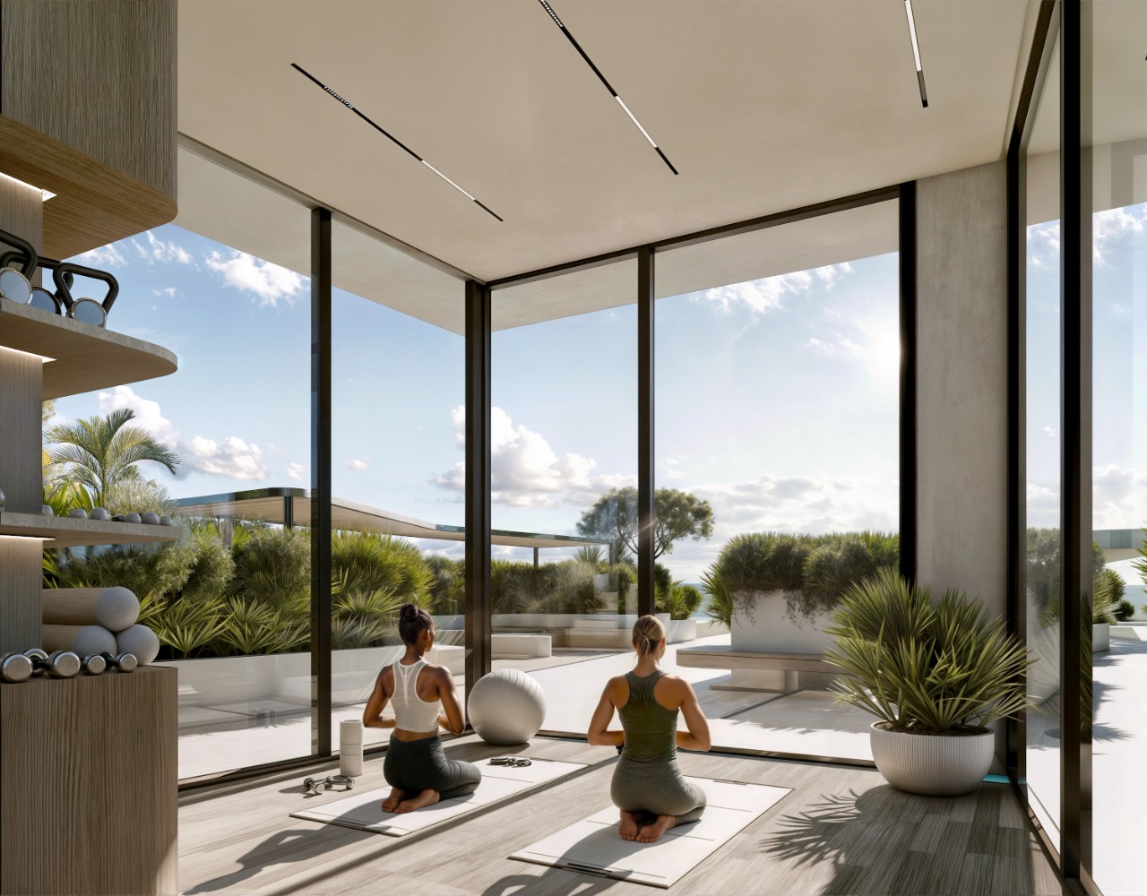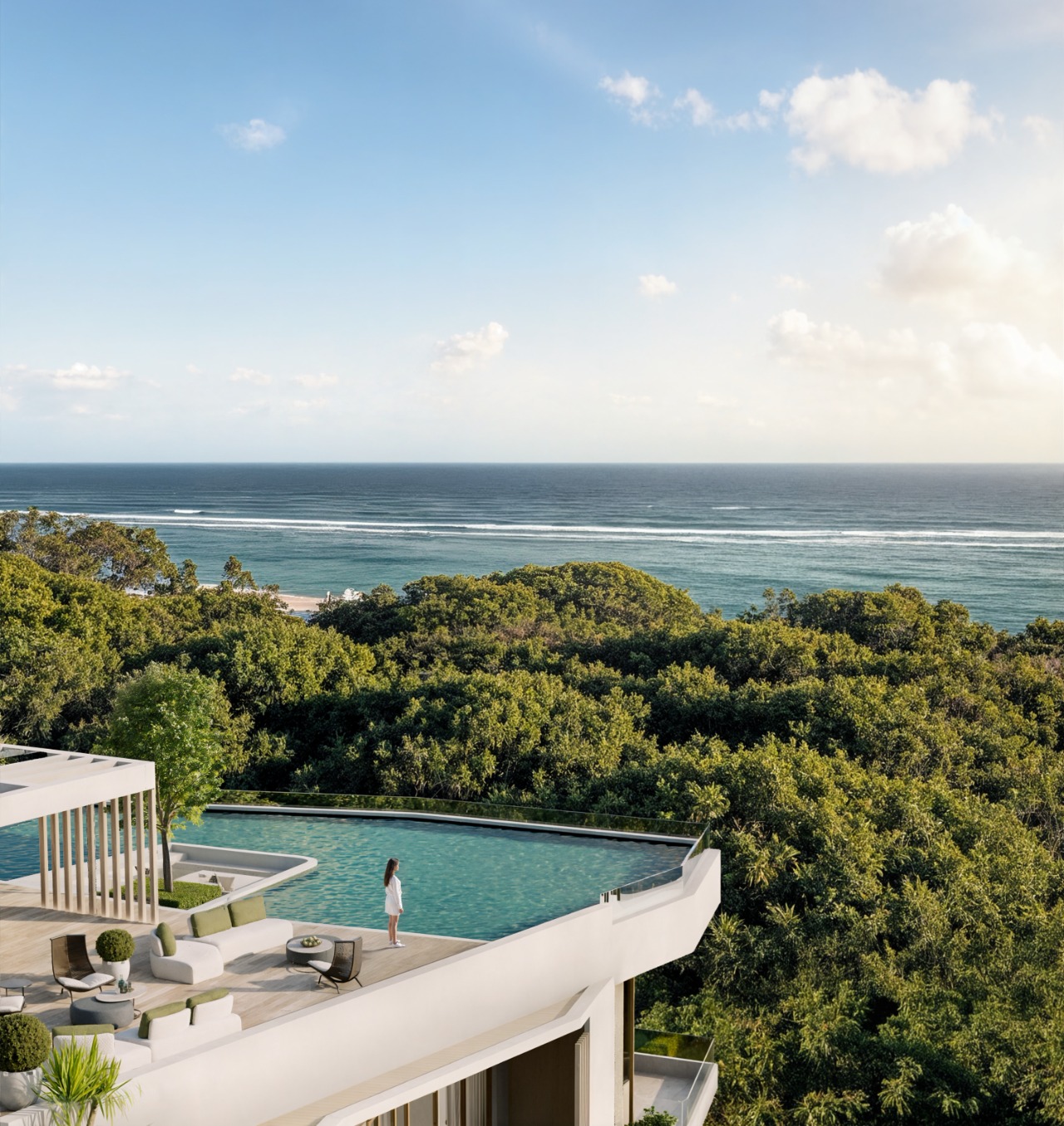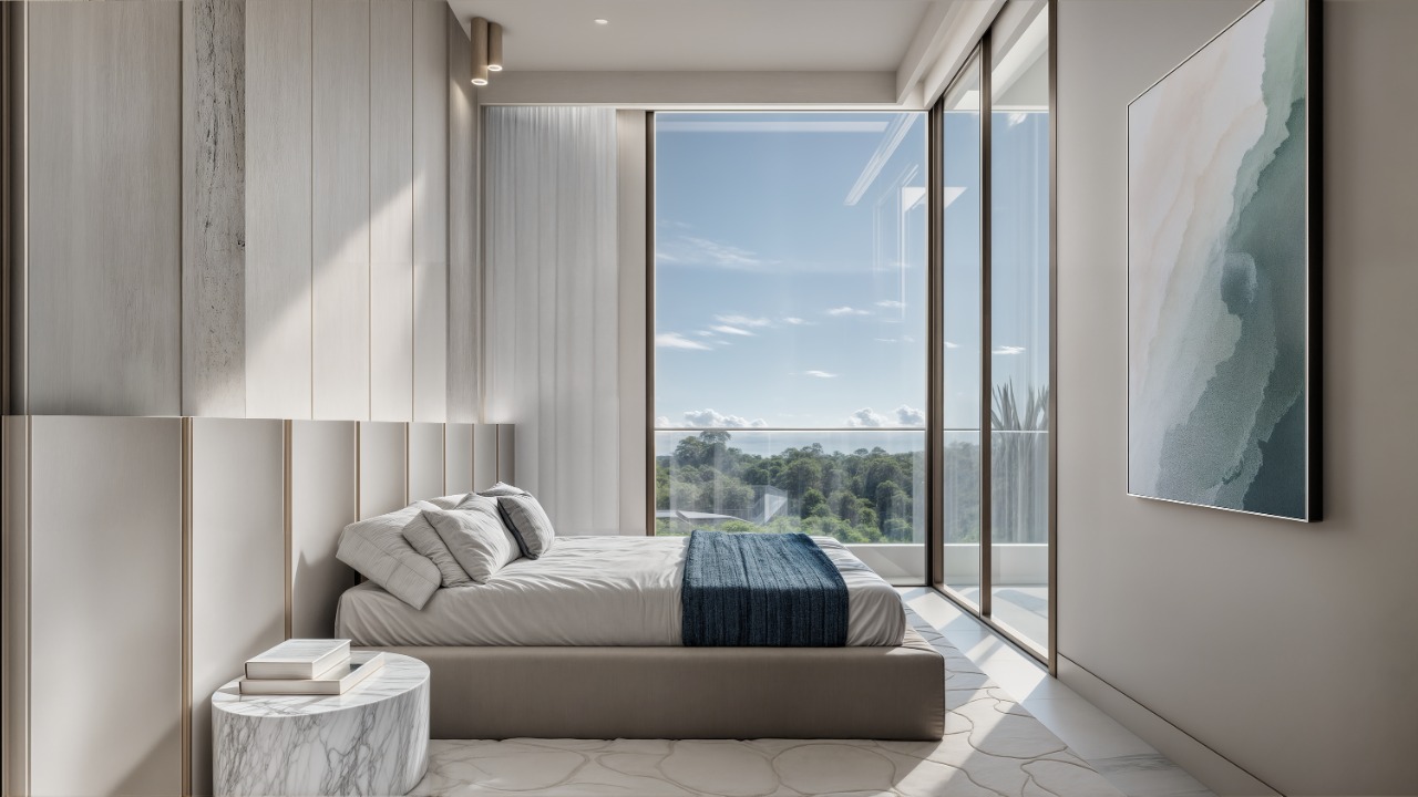 Each residence is conceived with an emphasis on indoor-outdoor connection and flexible living. A key design element is the inclusion of a generous, shaded private loggia that extends the living area and fosters a stronger relationship with the surrounding environment. Inside, open plan layouts seamlessly integrate kitchen and living functions while offering adaptable spaces that can serve as home offices, study areas or guest accommodation. A distinctive signature feature is the placement of a bathtub in each unit, strategically positioned between the bedroom and the loggia to capture uninterrupted ocean views without compromising privacy. This is achieved through deliberate facade orientation and integrated screening.