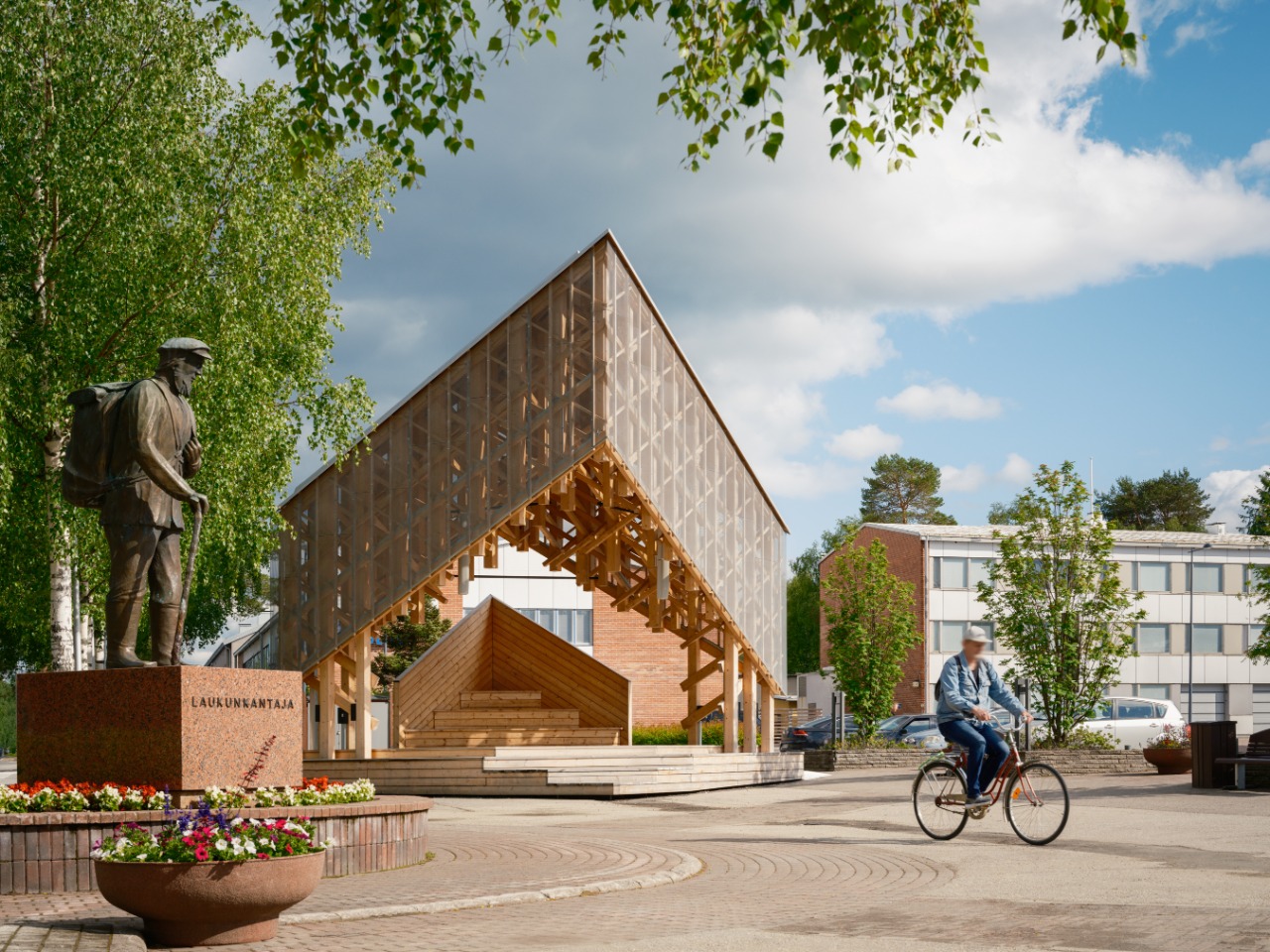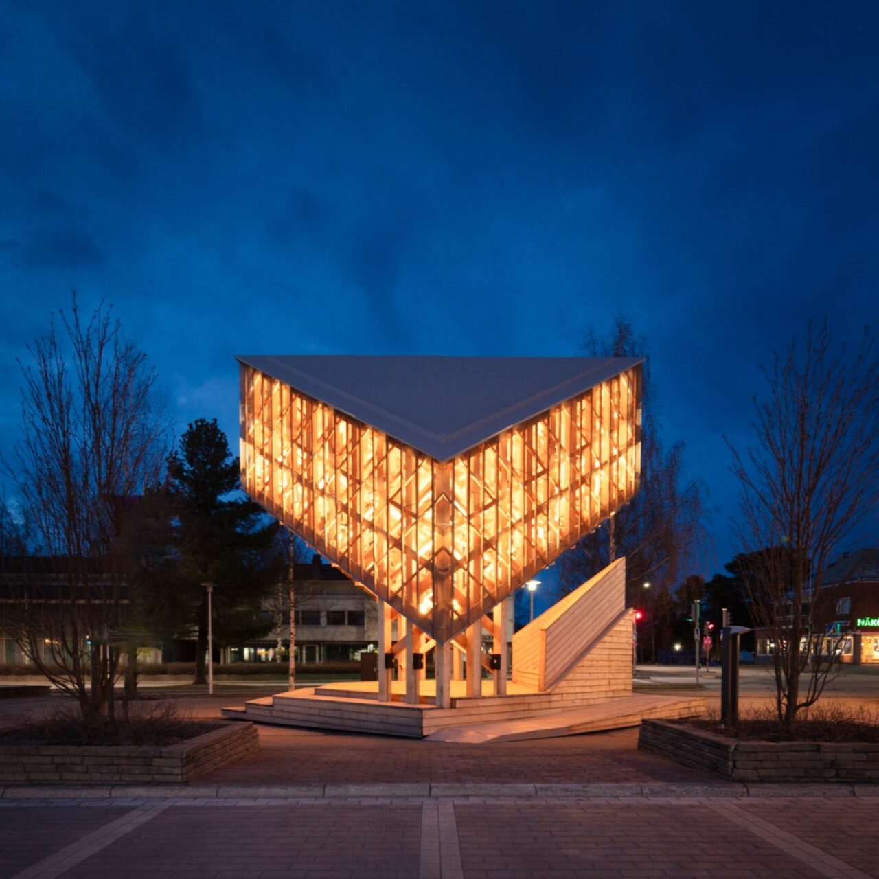 “Kide” (“ice crystal” in Finnish) draws inspiration from the fractal geometry of snow, reflected in the structure’s design. Additionally, its interior space captures the essence of a Finnish forest, creating a serene and immersive atmosphere. The structure is used not only by performers but as well by residents in their day-to-day market activities.