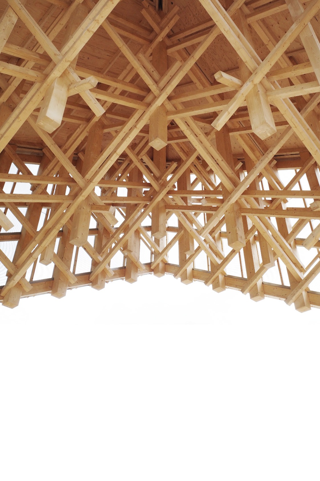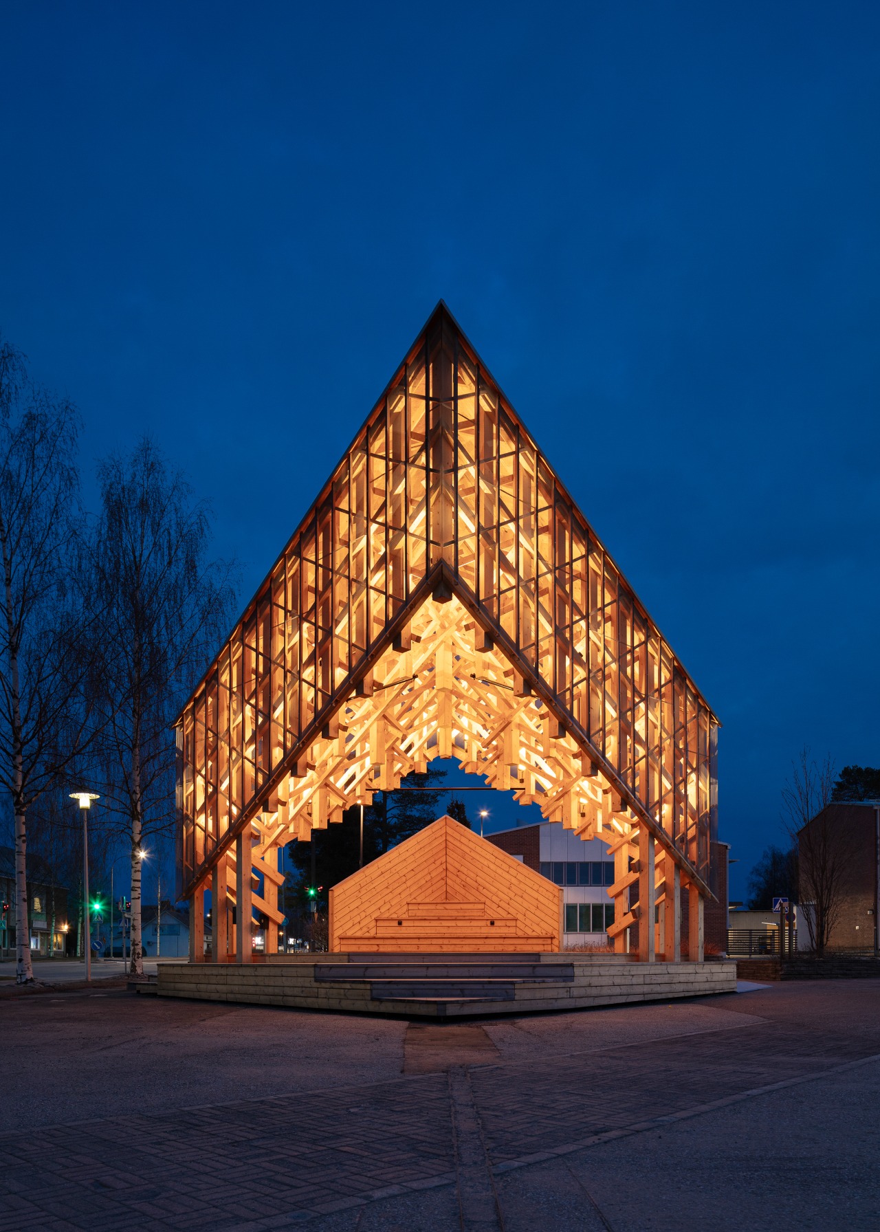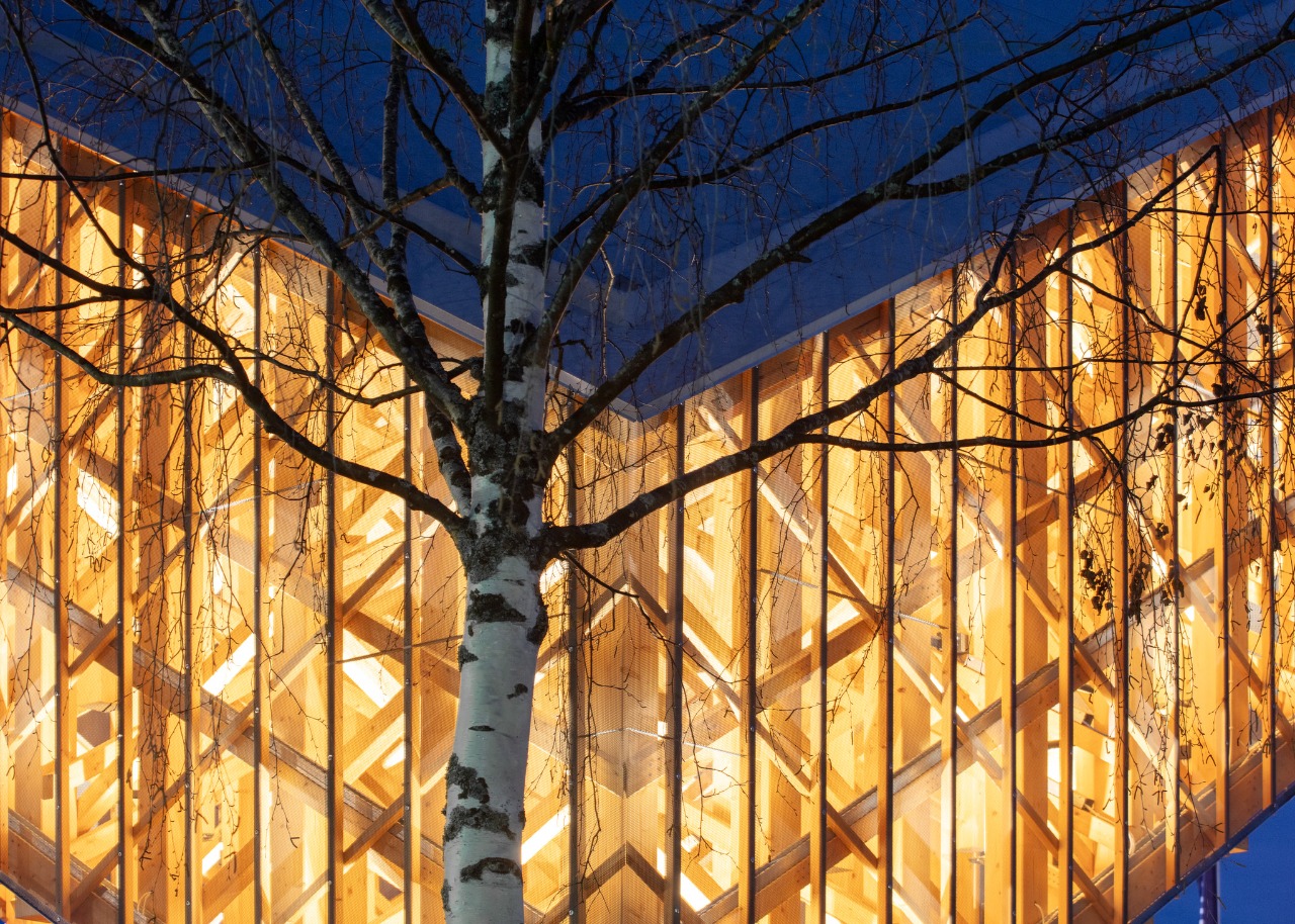 A translucent metal mesh elegantly reveals the intricate wooden framework, enhancing the structure’s depth and visual appeal. The roof comprises eight prefabricated LVL (laminated veneer lumber) elements, adding both strength and character to the design.