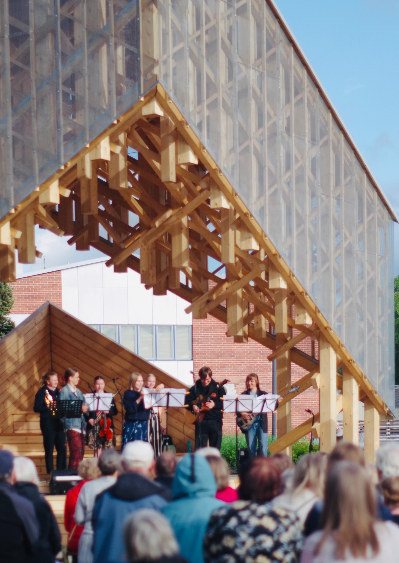 An elevated deck and backdrop, crafted from locally sourced pine wood, create a warm and inviting stage for performers. Under Kide’s canopy, a variety of events have taken place, including folk music festivals, dance performances, choirs, rock bands, and award ceremonies.