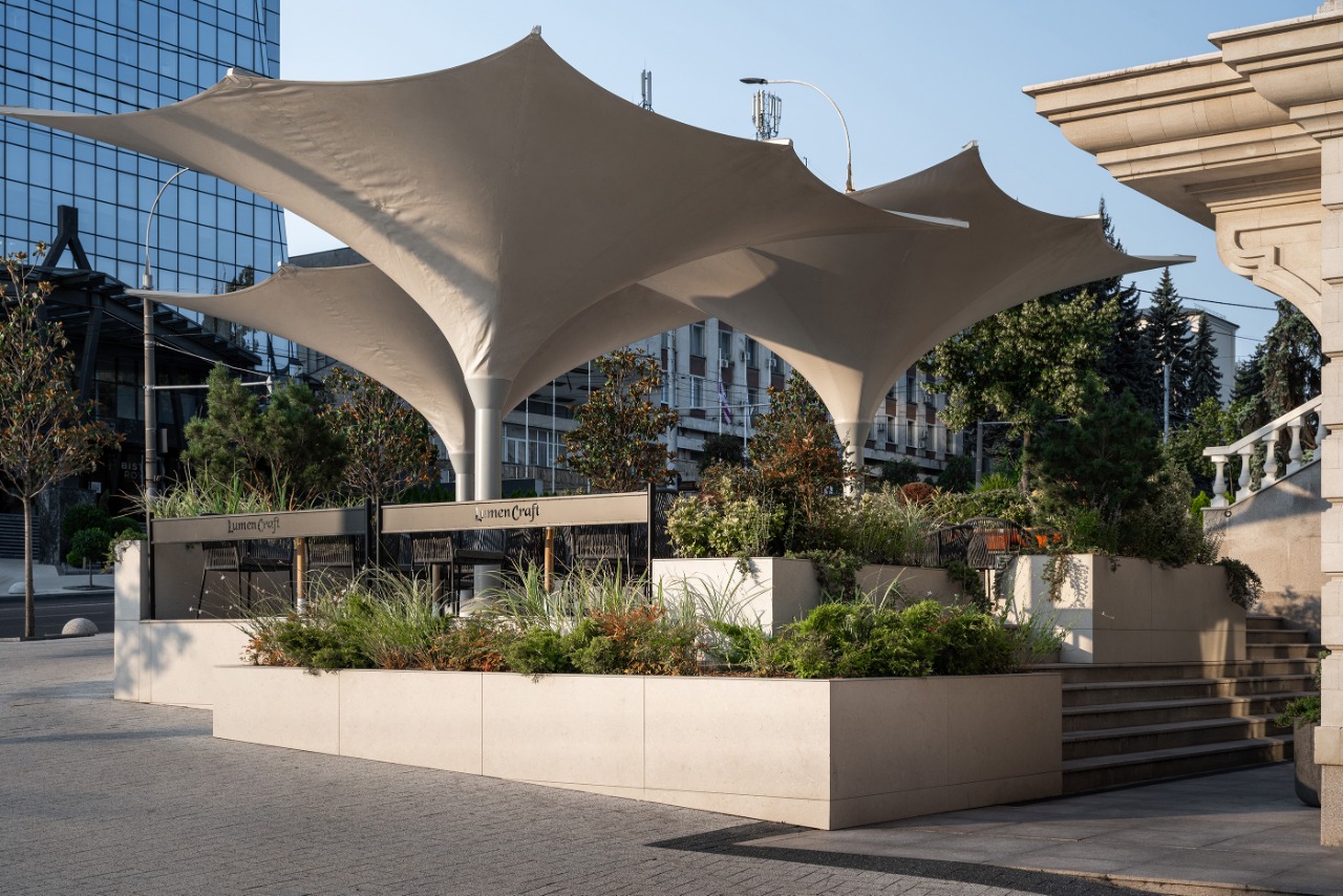 The terrace adapts to the site’s stepped configuration through several flat platforms, creating flexible seating areas. Sculptural flower-shaped umbrellas in front of the neoclassical façade introduce a striking contrast between organic forms and classical architecture. Integrated greenery in planters and large pots filters noise and visual pollution, transforming the terrace into an urban oasis that blurs the boundary between street and dining space. Thoughtful detailing ensures both privacy and shelter, making the terrace a transitional space where nature, design, and architecture harmoniously interact.