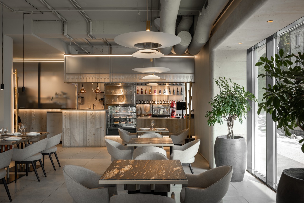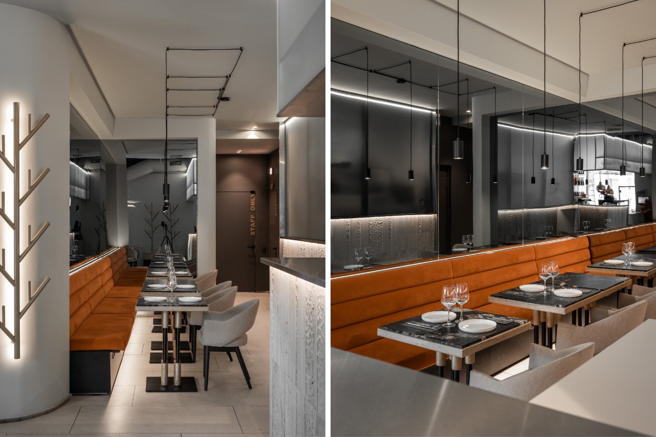 The interior unfolds in two distinct zones: the main hall, with 28 seats and expansive glazing where natural light plays a key role, and a more intimate corner with 10 seats. Mirrors placed here reflect light and visually extend the space, eliminating the impression of a transitional zone.