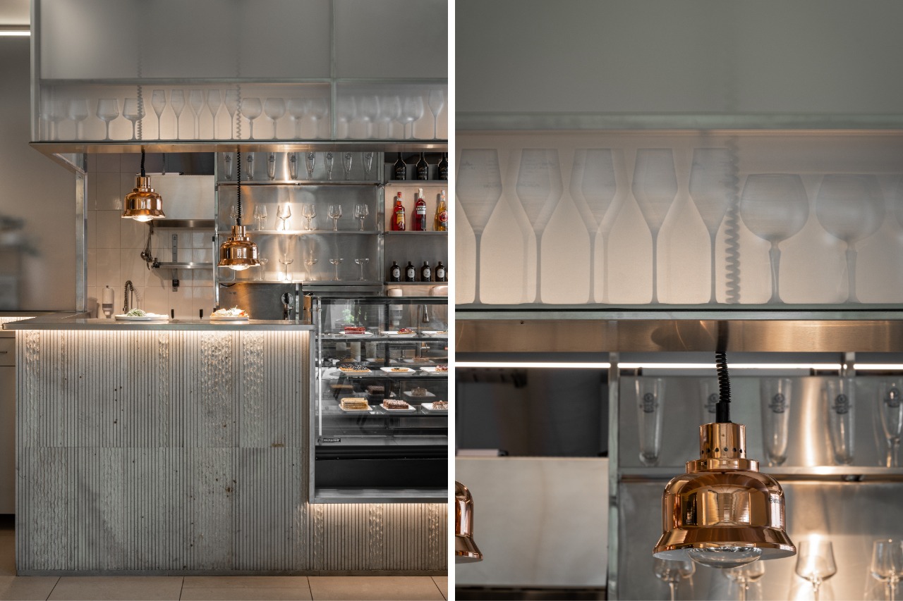 The focal point of the interior is the service counter, clad in hand-crafted Cosăuți stone that reveals a tridimensional texture of vertical strips. Integrated into it, a dessert display becomes a gastronomic stage, while a second counter facing the street opens the space toward passersby. Above, a semi-transparent suspended structure for glass storage becomes a visual feature in itself, with silhouettes perceived like shadows in motion.