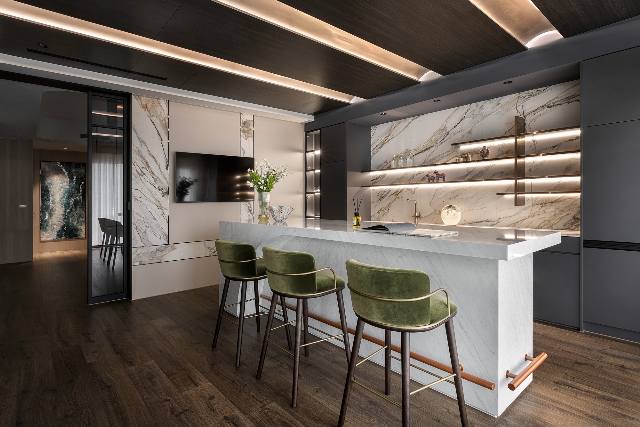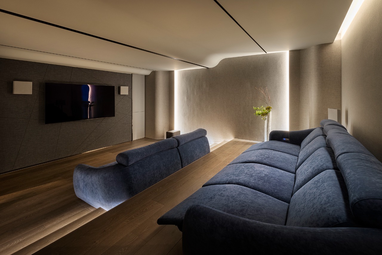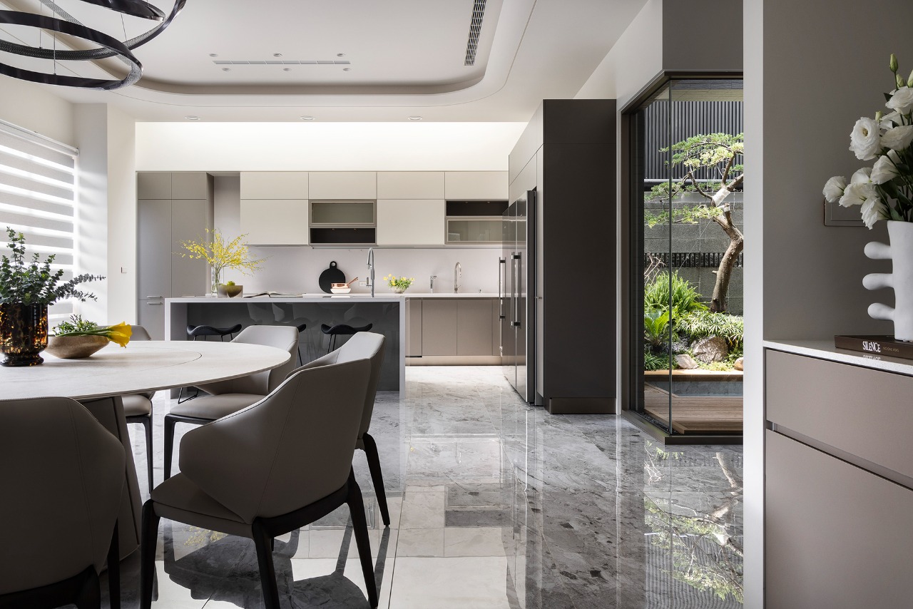 Upon entering, guests will be enveloped in public areas that showcase a consistent gray and white color palette, where rhythmic accents of reflective stone and contrasting furniture create a visually dynamic environment. The living room emerges as a tranquil oasis, beautifully incorporating a kare-sansui dry landscape garden visible through expansive floor-to-ceiling glass panels. This design choice allows sunlight to cascade into the space, infusing it with warmth and vitality. Meanwhile, the TV wall commands attention, crafted from elegant light gray marble with sharply defined edges, while the ceiling’s gracefully curved design adds a sense of depth and sophistication.
