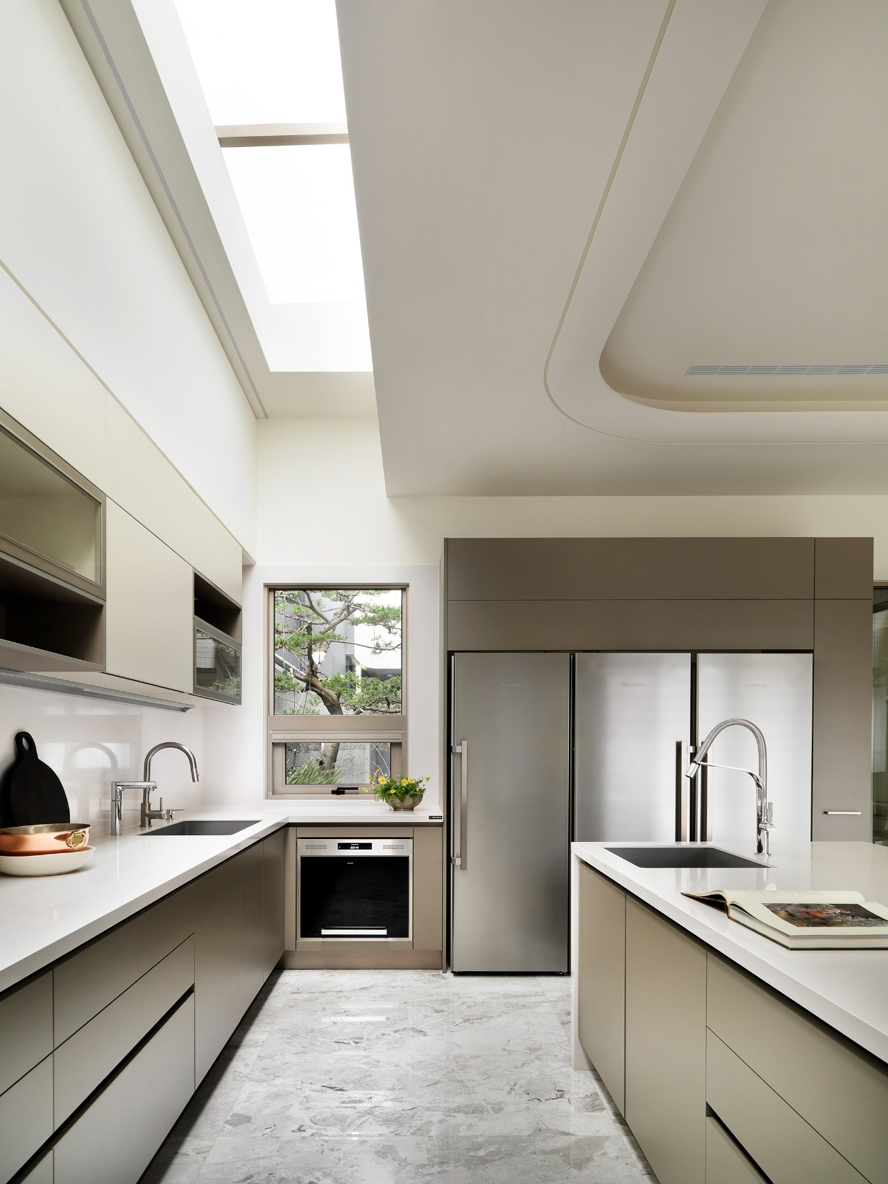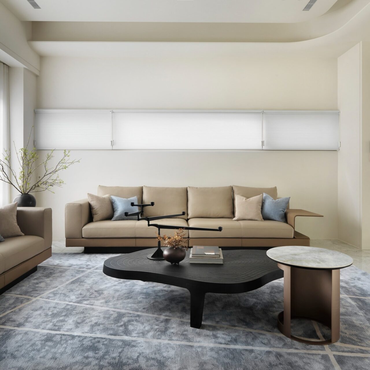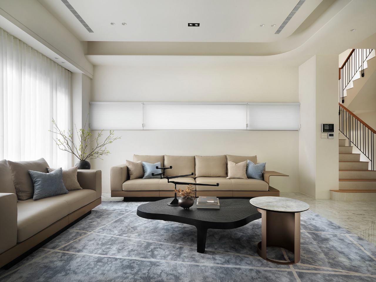 Upon entering, guests will be enveloped in public areas that showcase a consistent gray and white color palette, where rhythmic accents of reflective stone and contrasting furniture create a visually dynamic environment. The living room emerges as a tranquil oasis, beautifully incorporating a kare-sansui dry landscape garden visible through expansive floor-to-ceiling glass panels. This design choice allows sunlight to cascade into the space, infusing it with warmth and vitality. Meanwhile, the TV wall commands attention, crafted from elegant light gray marble with sharply defined edges, while the ceiling’s gracefully curved design adds a sense of depth and sophistication.