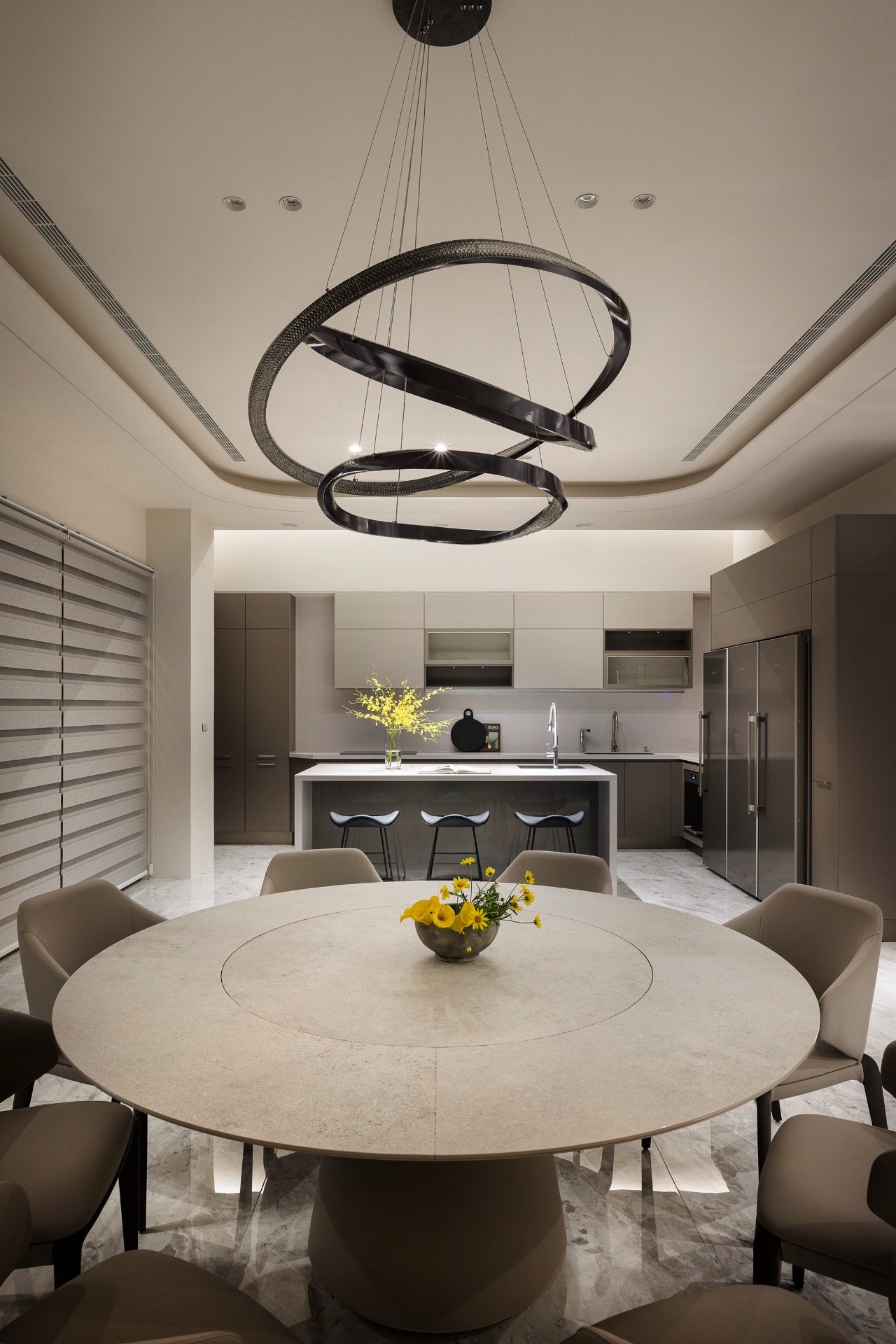 Transitioning seamlessly, one will see that the open-plan kitchen and dining area fosters a sense of connection and interaction. A circular dining table serves as a centerpiece, reinforcing familial bonds and inviting lively conversations. Above, a strategically placed skylight floods the kitchen with an abundance of natural light, enhancing the vibrant atmosphere and encouraging a free flow of dialogue. Finally, the staircase captivates with its unique curved perforated mesh screen, serving as a striking focal point. As natural light pours in from the atrium, it dances across the staircase, creating an enchanting visual experience with each step. This design not only enhances the overall aesthetic but also enriches the experience of moving through the space.