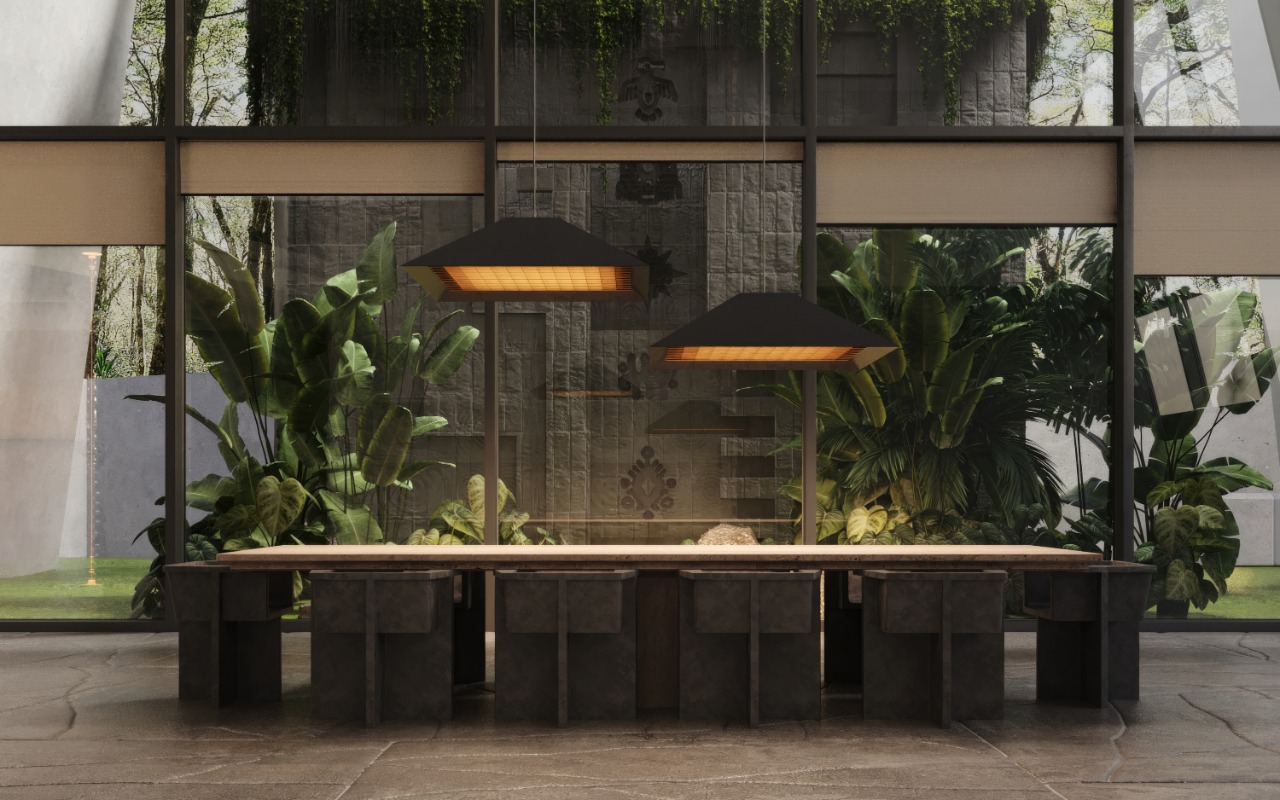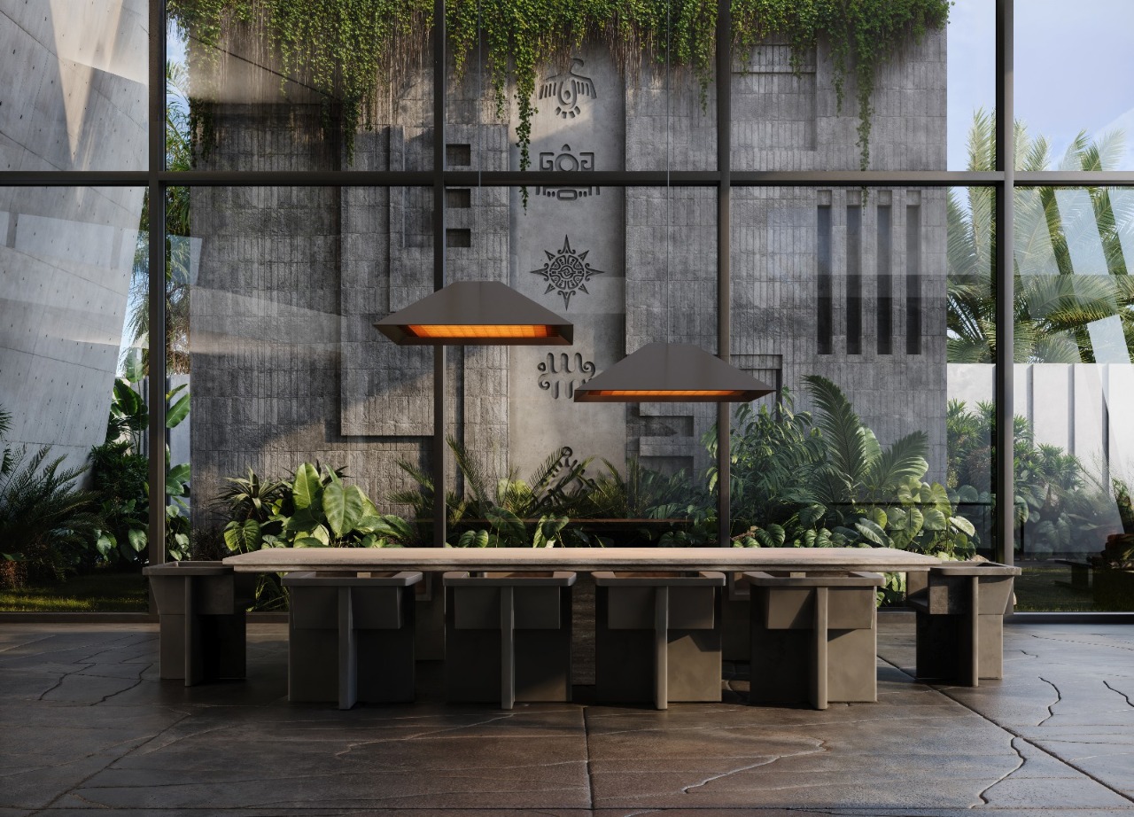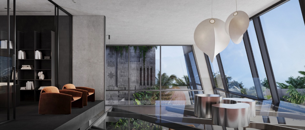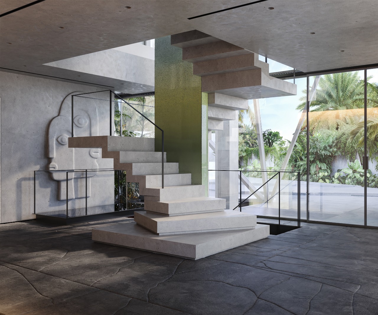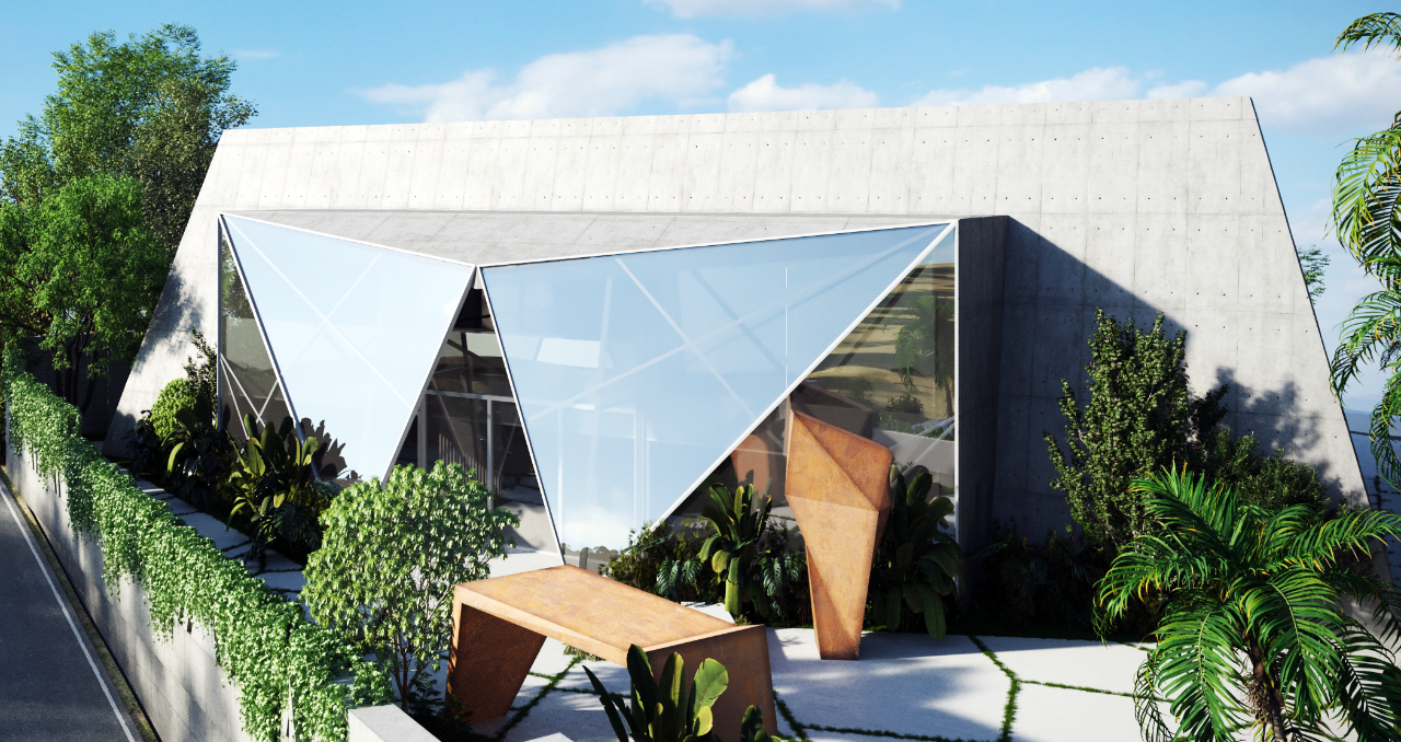 The architectural concept draws on sacred forms of the past. The inclined concrete walls reinterpret the geometry of Mayan pyramids and Hindu temples, becoming both structural system and spatial narrative. These sloped planes define not only the exterior expression, but also the interior movement, layout, and light.