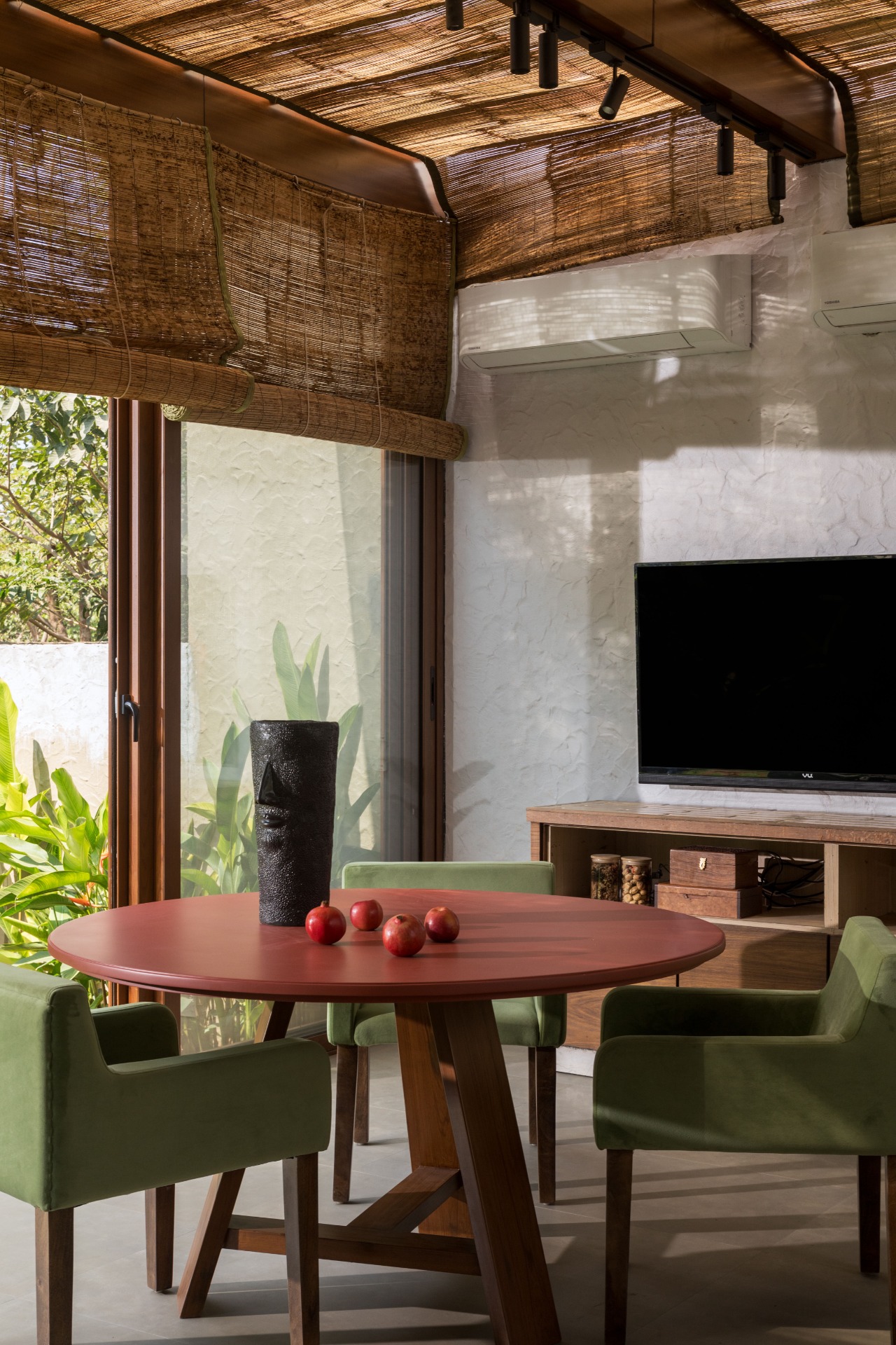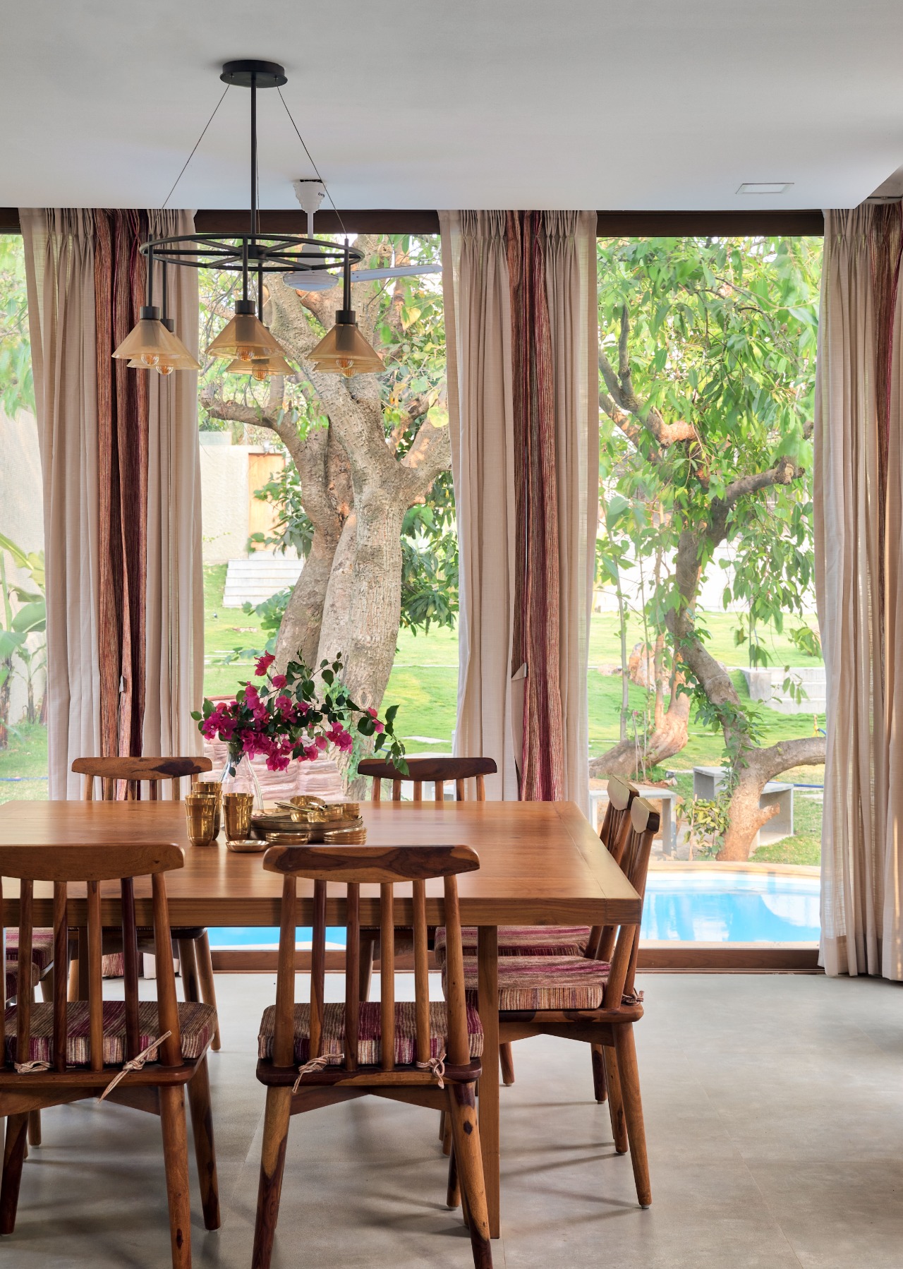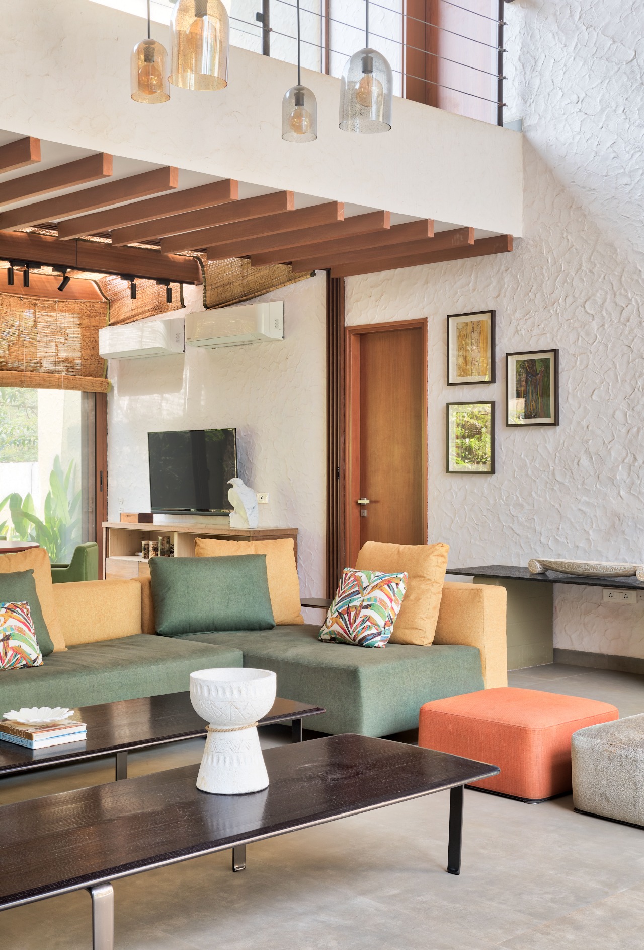 Set against the lush backdrop of Lonavala, this twin-villa retreat was envisioned as a haven for gatherings, celebrations, and effortless living. The design intent was clear from the outset: to create a home that could host lively parties yet remain pristine, functional, and free from the challenges of the region’s heavy monsoons. Maintenance-free living, a palette of natural materials, and a sense of openness guided every design decision, resulting in a space that feels both understated and celebratory.