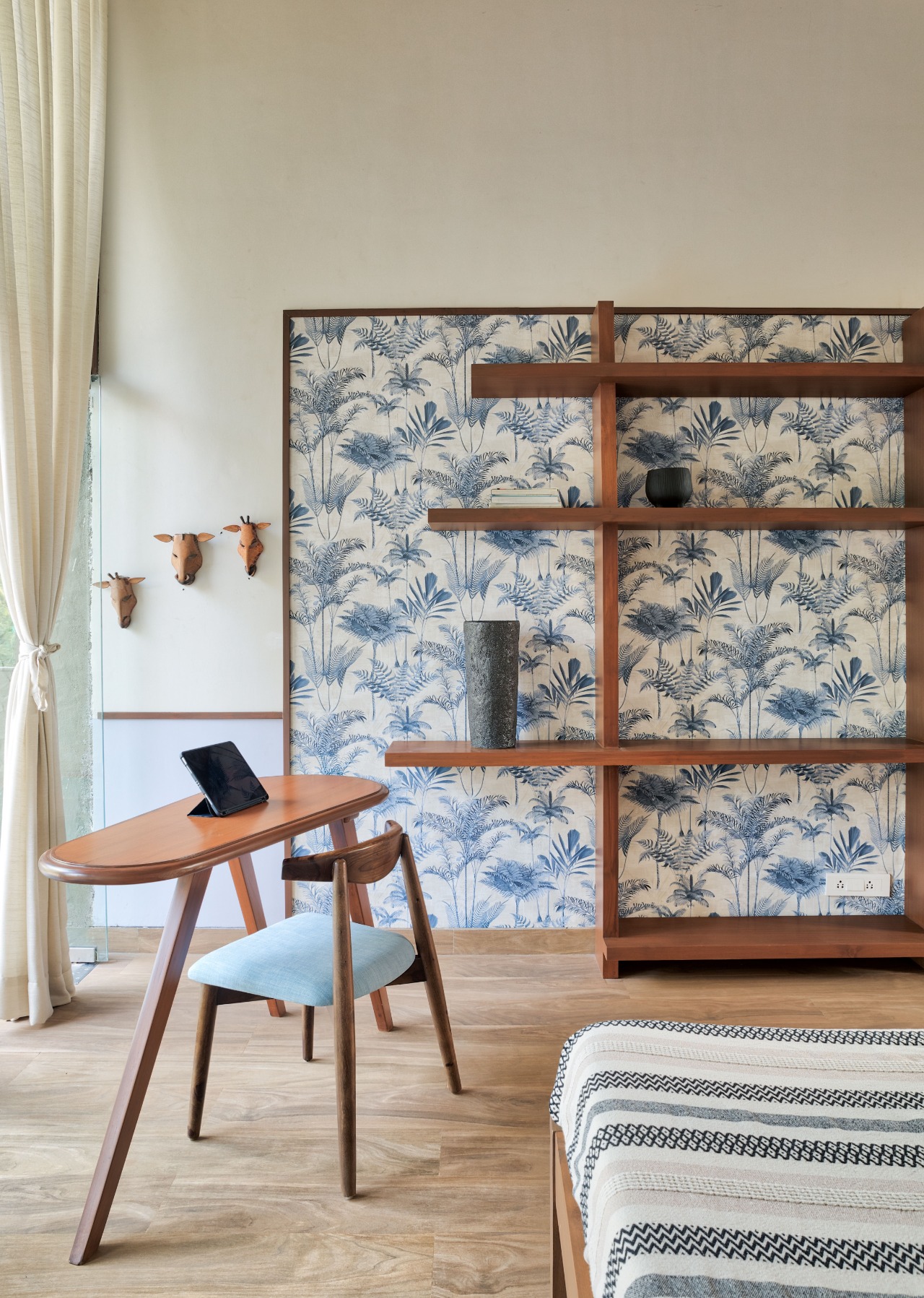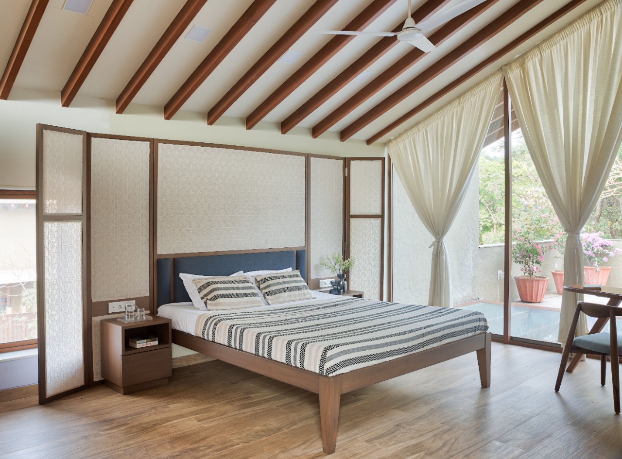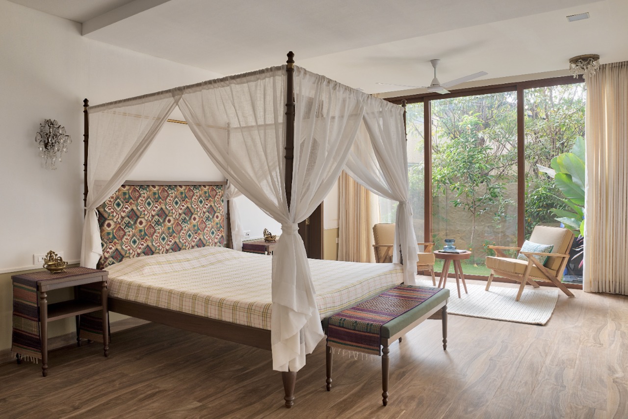 The material palette is tactile yet sensible: Burma teak for durability, cotton and handloom fabrics for lightness, and Nexion tiles alongside natural limestone for seamless surfaces that age gracefully. The approach to cost-efficiency was never about compromise but about discernment, choosing materials that weather well, blending quality with restraint. Landscape design, too, followed this ethos; trees were favoured over delicate flowering plants, ensuring longevity against the rains while retaining a natural, unmanicured charm.