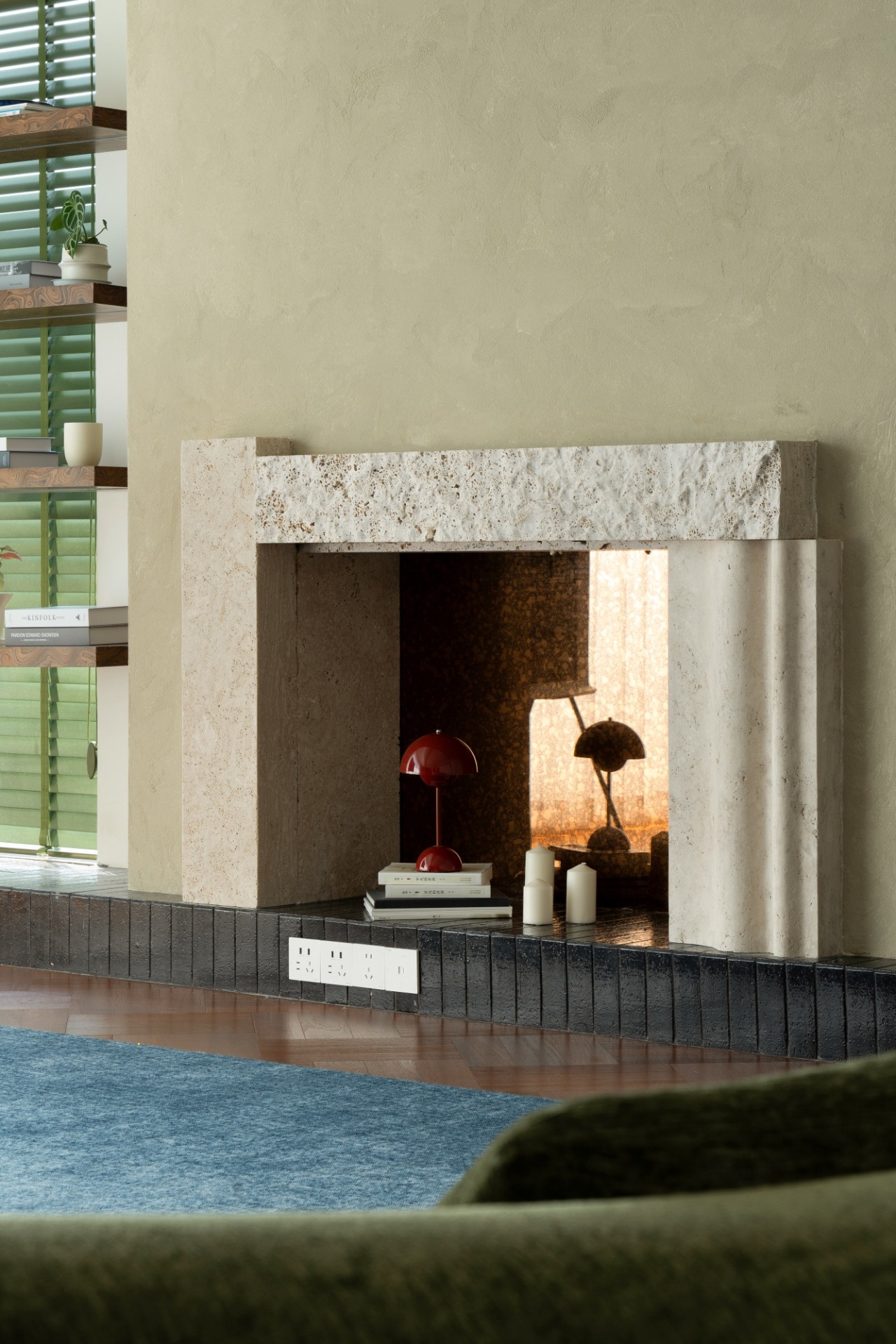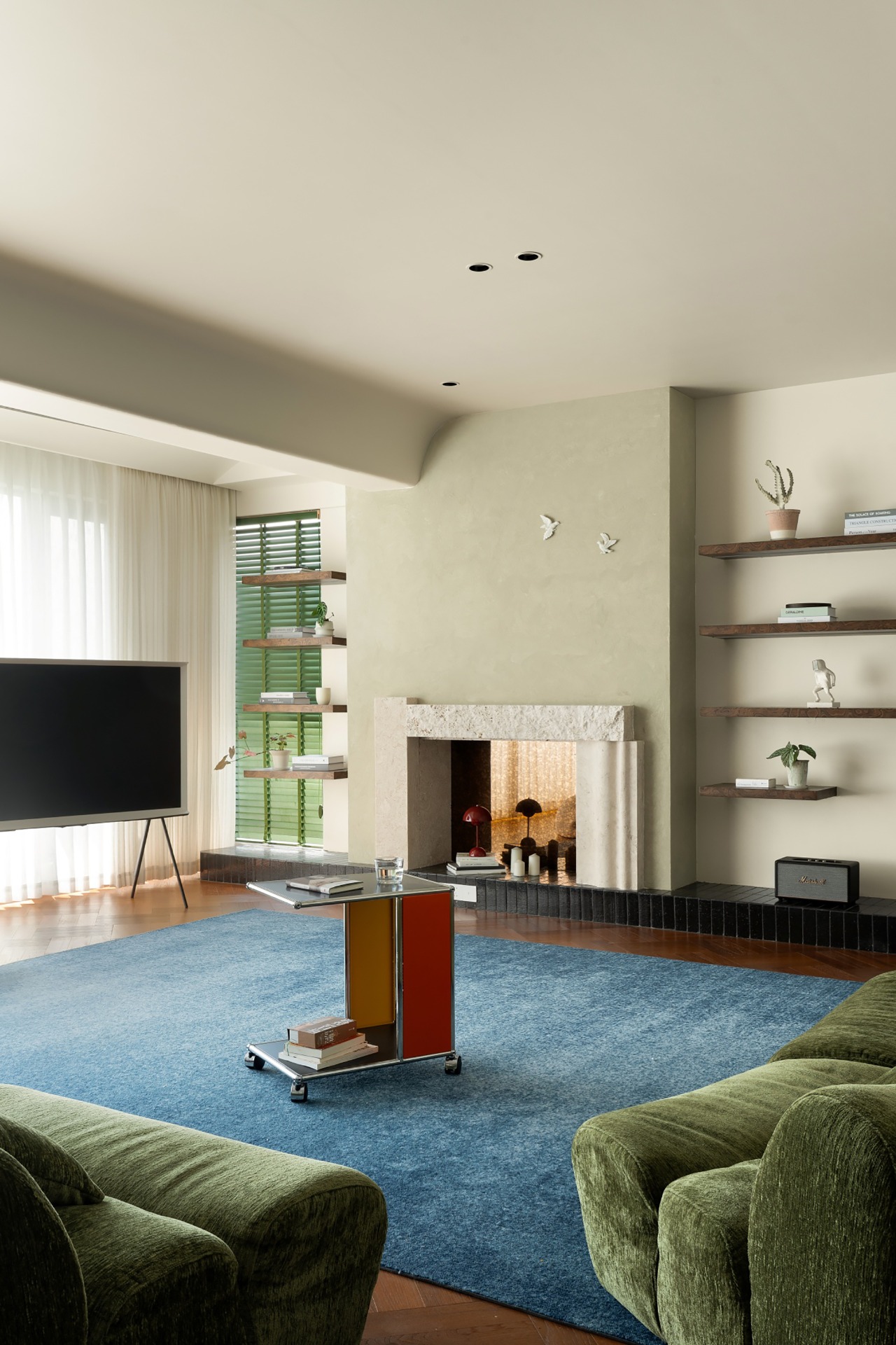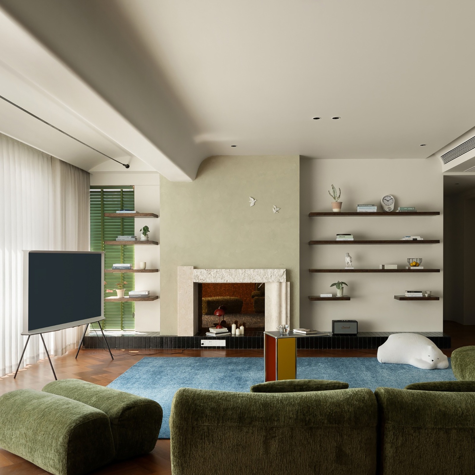 The living room abandons the traditional TV wall and combines artistic paint and wooden shelves with decorative items and green plants, creating a natural and casual atmosphere.