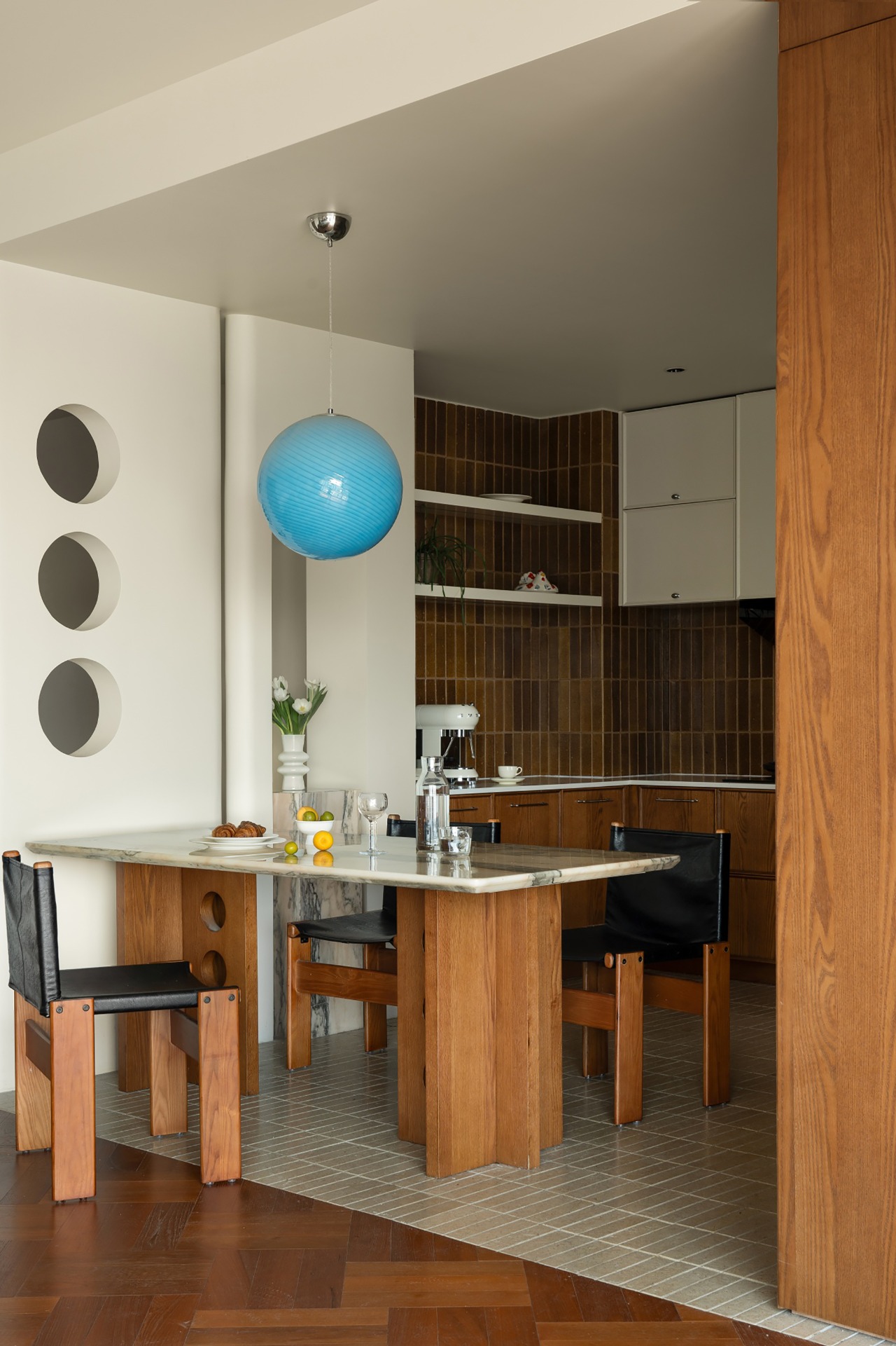 The entrance is separated by a decorative wall, which not only creates a sense of style but also separates it from the open kitchen.
