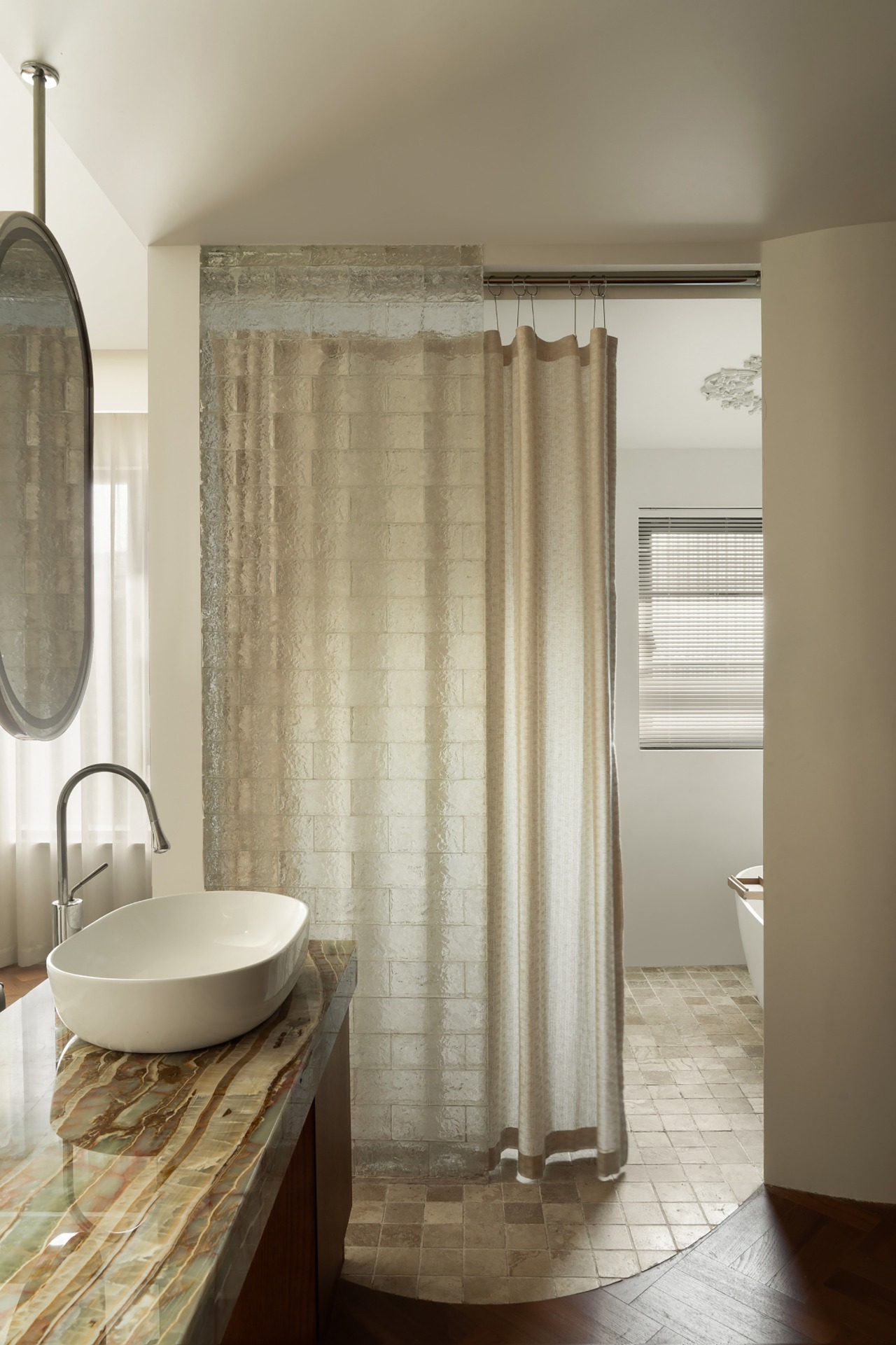 In response to the rigid layout and insufficient spatial hierarchy of traditional bathrooms, we abandon the conventional layout and use curved walls to create large suites.
