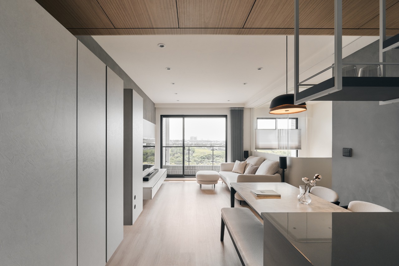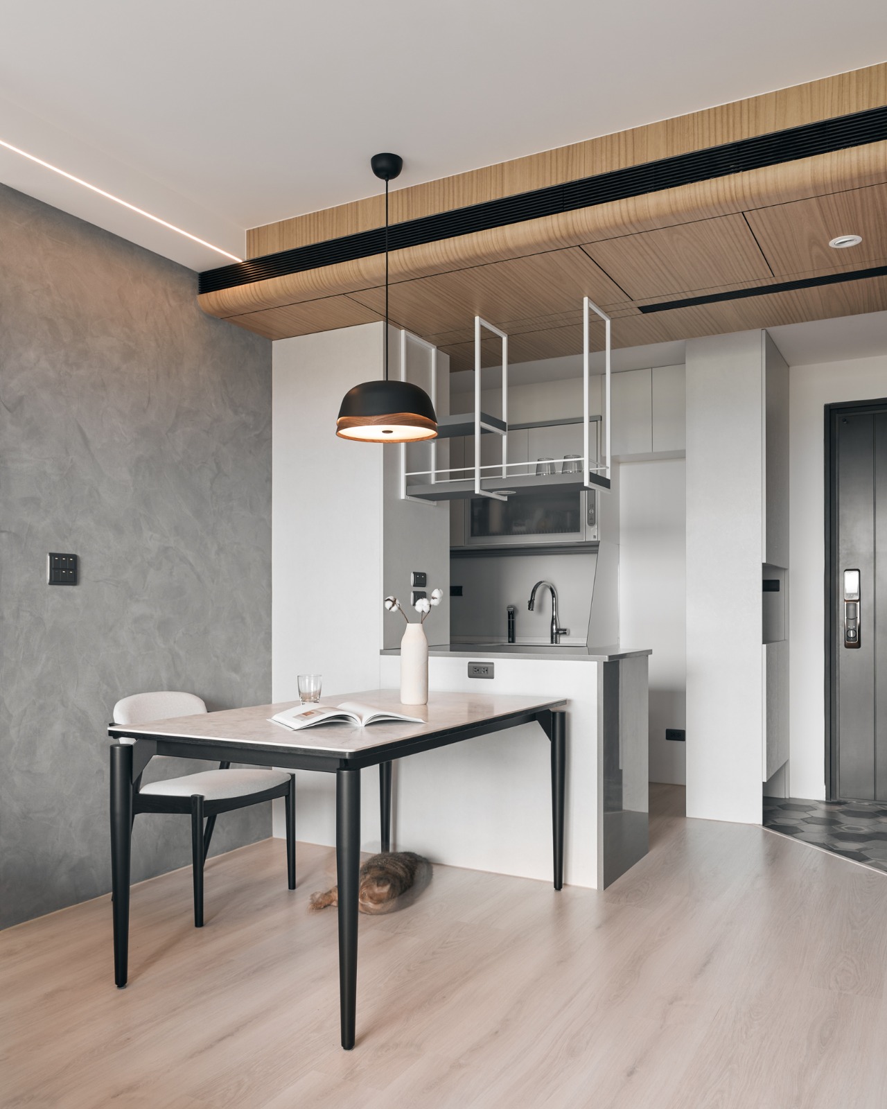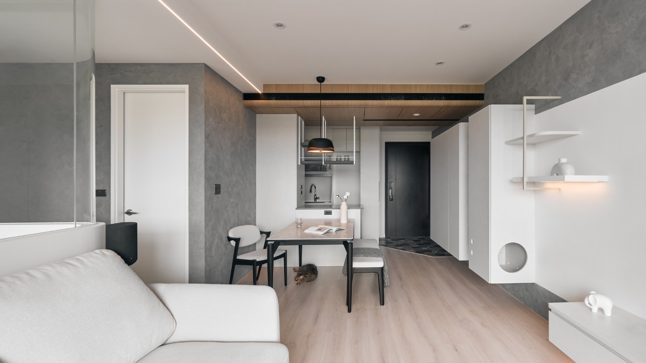 This single-story residence, spanning approximately 60 square meters, is a delicate exploration of spatial openness and serene comfort within a compact footprint. Subtle spatial reconfiguration allows the layout to breathe, transforming what was once a confined interior into a calm and well-balanced retreat. The cabinetry throughout adopts a seamless, handle-free design, presenting a clean visual language that enhances spatial clarity. Overhead, the ceiling subtly defines the living and kitchen zones, concealing the air conditioning and dehumidification systems while gently softening the impact of a structural beam. The interplay between warm wood veneer and fine black detailing establishes a quiet rhythm, bringing depth and refinement to the atmosphere.