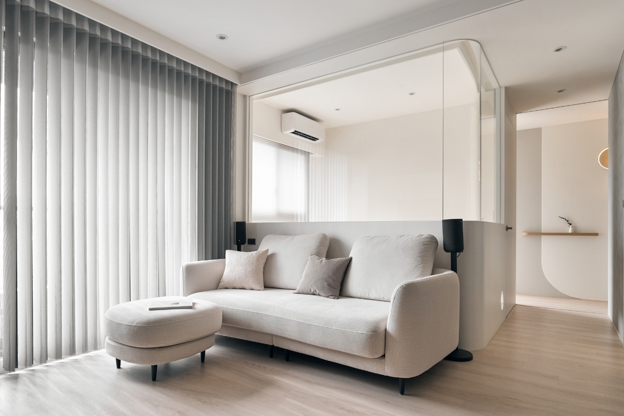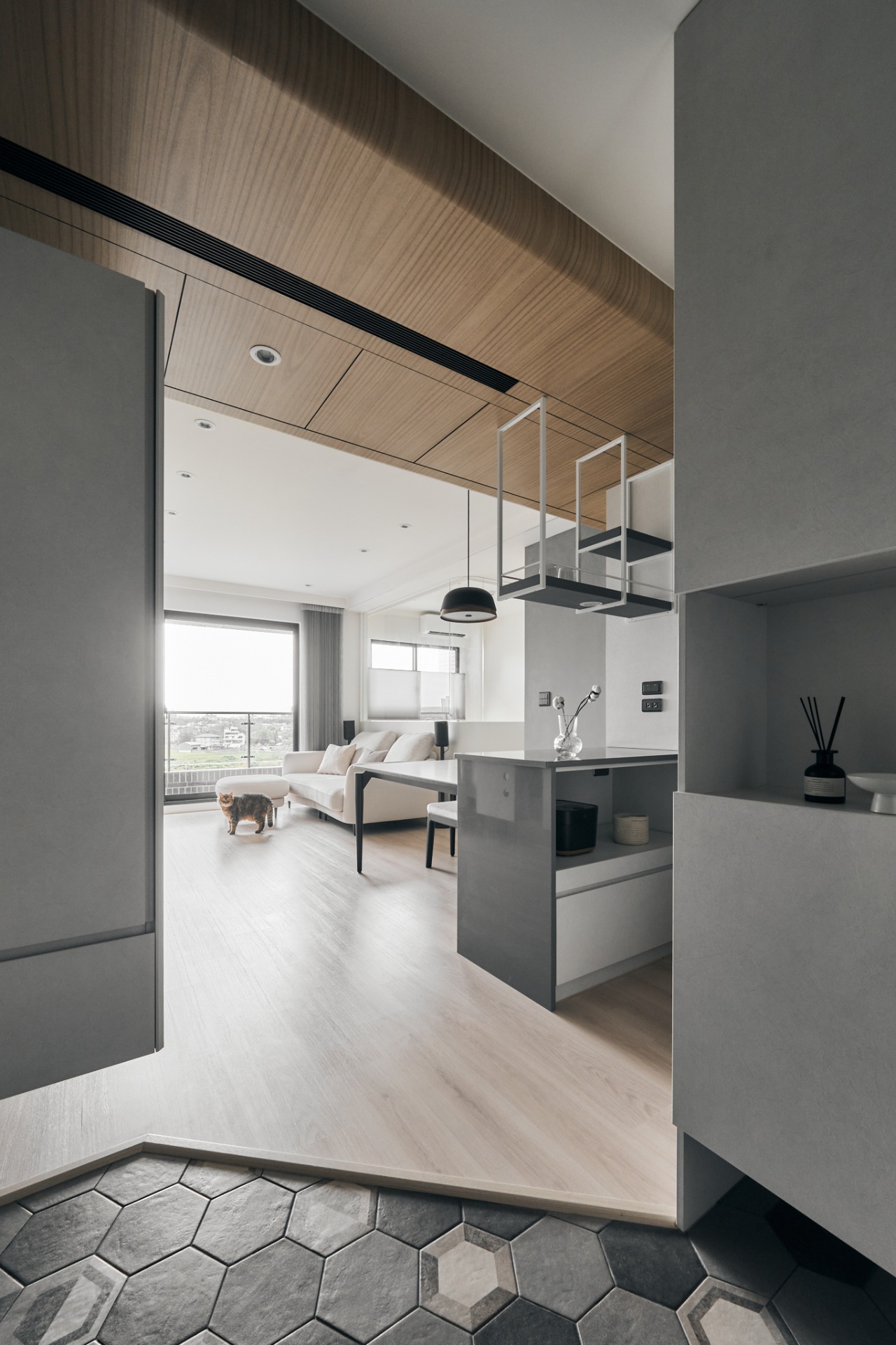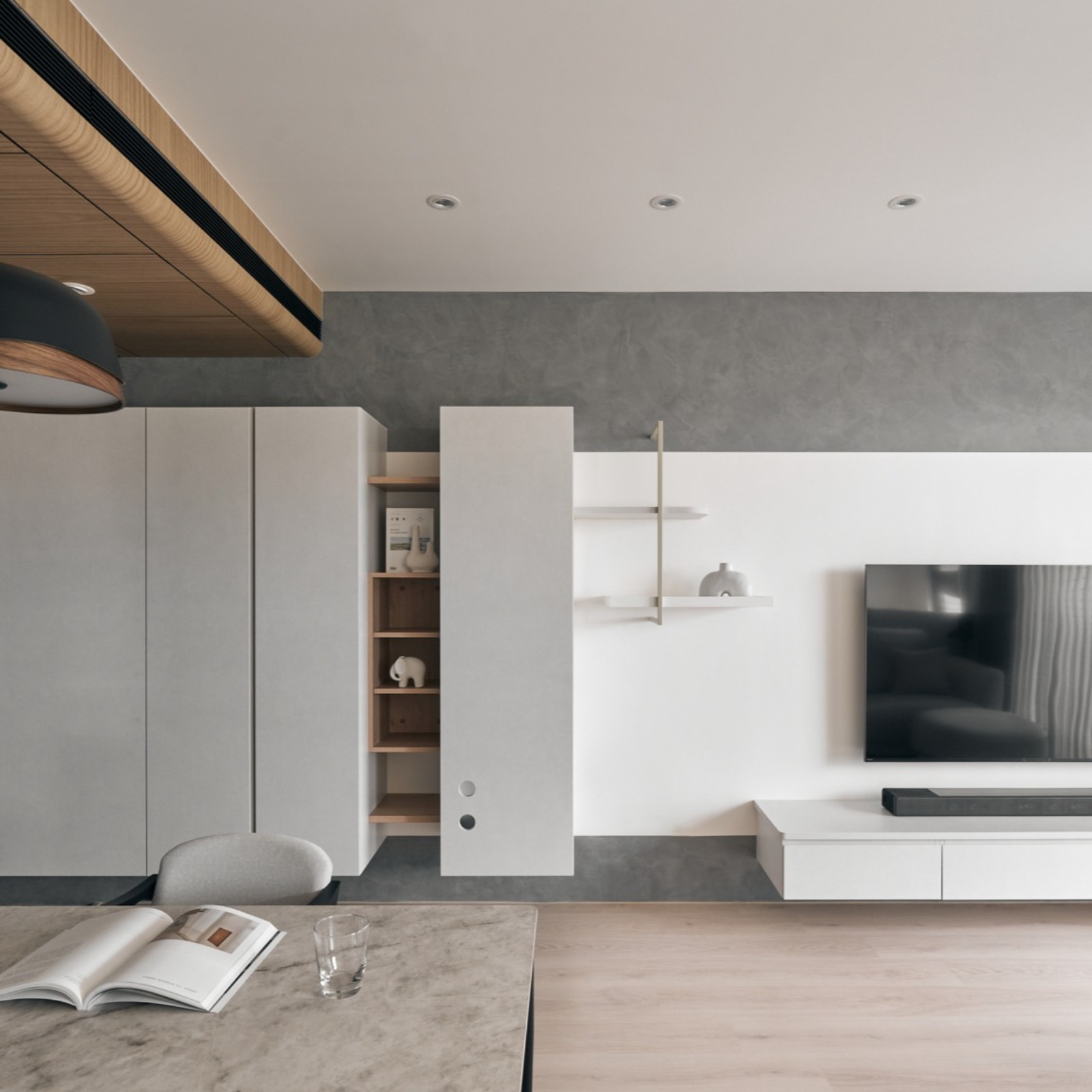 This single-story residence, spanning approximately 60 square meters, is a delicate exploration of spatial openness and serene comfort within a compact footprint. Subtle spatial reconfiguration allows the layout to breathe, transforming what was once a confined interior into a calm and well-balanced retreat. The cabinetry throughout adopts a seamless, handle-free design, presenting a clean visual language that enhances spatial clarity. Overhead, the ceiling subtly defines the living and kitchen zones, concealing the air conditioning and dehumidification systems while gently softening the impact of a structural beam. The interplay between warm wood veneer and fine black detailing establishes a quiet rhythm, bringing depth and refinement to the atmosphere.