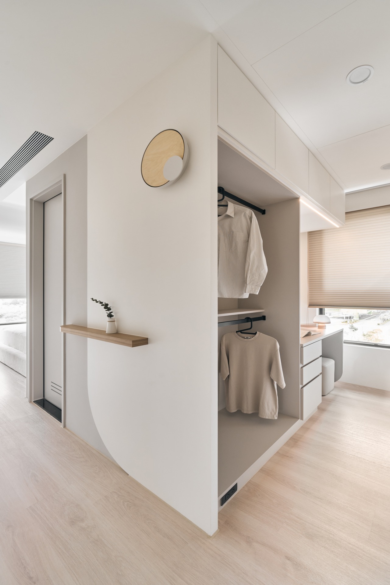 The dressing area continues this language of understated harmony. One side accommodates a vanity and open hanging zone, while the other conceals a generous storage section behind sliding doors. Near the entrance, drawers and cabinets provide dedicated places for handbags, hats, and outerwear, crafting a well-ordered environment where everyday function meets quiet elegance. Through its gentle color palette and sensitive detailing, the design embodies a warm modernity that invites calm, balance, and a deeply personal sense of belonging.