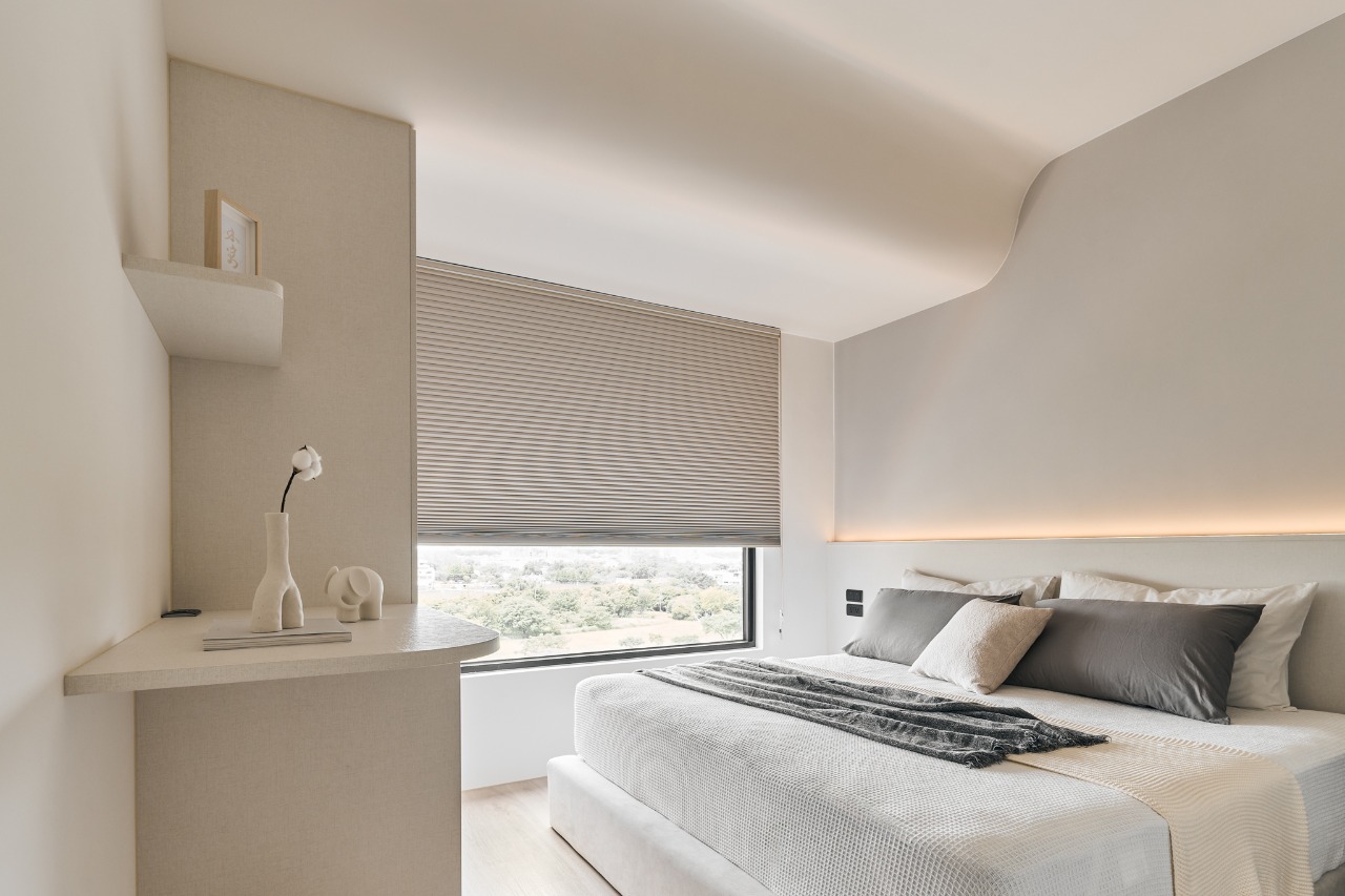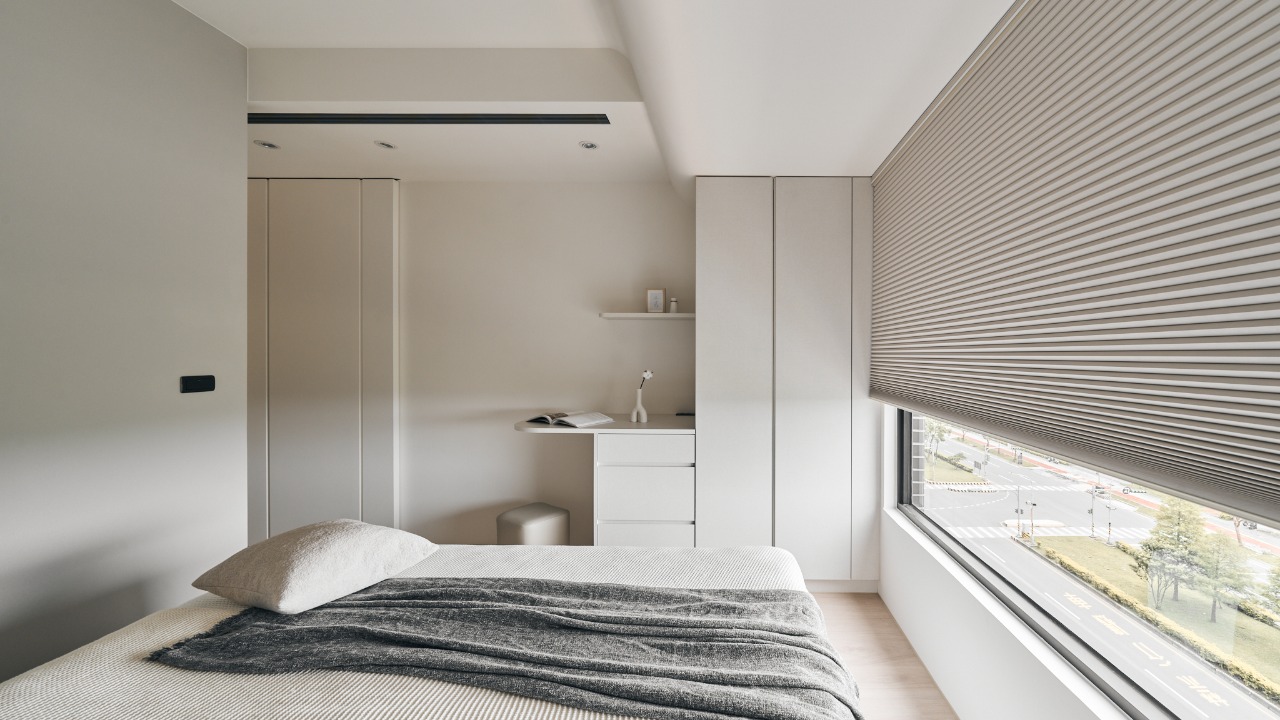At the corridor’s end lies the master suite, reimagined from two opposing rooms into a singular, cohesive domain. This new configuration introduces a generous walk-in closet that mediates between dressing and sleeping zones, allowing the couple to maintain distinct daily rhythms in quiet harmony. Within the bedroom, a once-heavy structural beam has been reshaped with a graceful curve, its softened contour diffuses light in a tender gradient, turning a former constraint into a poetic architectural feature.