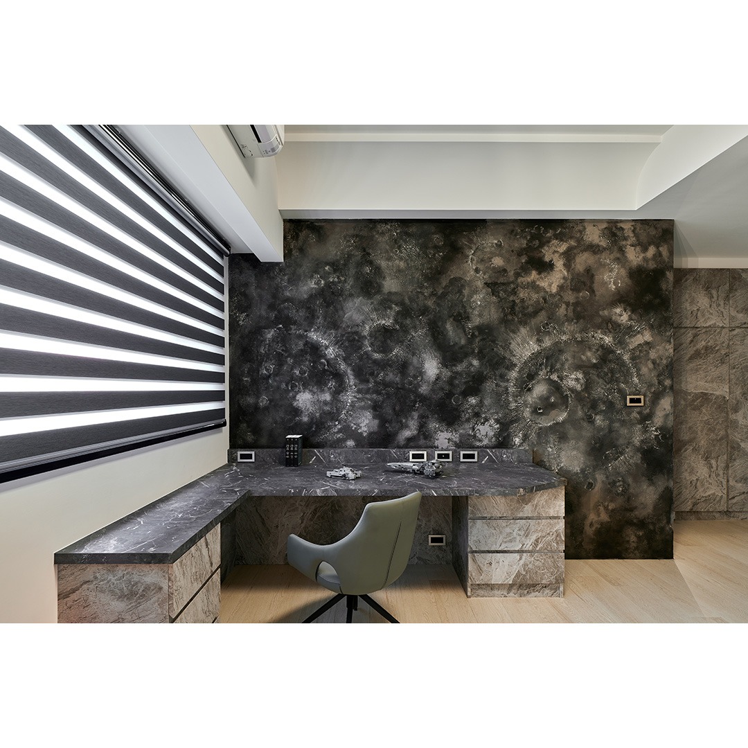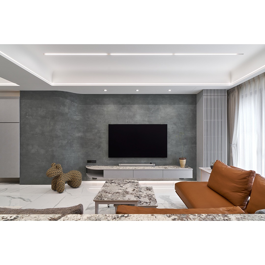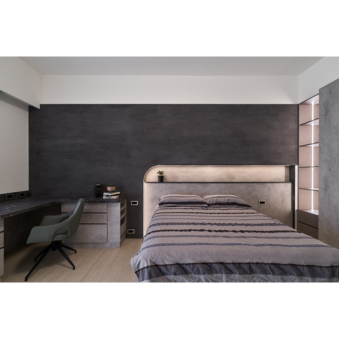 The residence in Yongkang, Tainan, is home to a family of four, with each member’s wishes woven into its design. The mother, devoted to cooking, envisioned a fluid and spacious island kitchen; the children dreamed of displaying their model collections and creating a “moon wall”; while the father hoped for a living room expansive enough to host gatherings. Guided by the theme of the moon, the designer employed muted tones and curved lines as visual language, deconstructing and reconstructing functions with subtle precision. The island and dining table can be either combined or separated—light and effortless for daily life, yet grand and accommodating for social occasions. The curved television wall, finished with layered German coatings, extends like rock strata to create depth, serving as a steady anchor for the entire family.