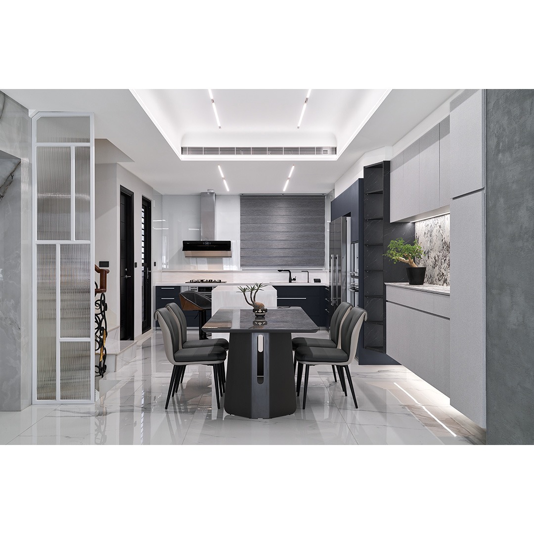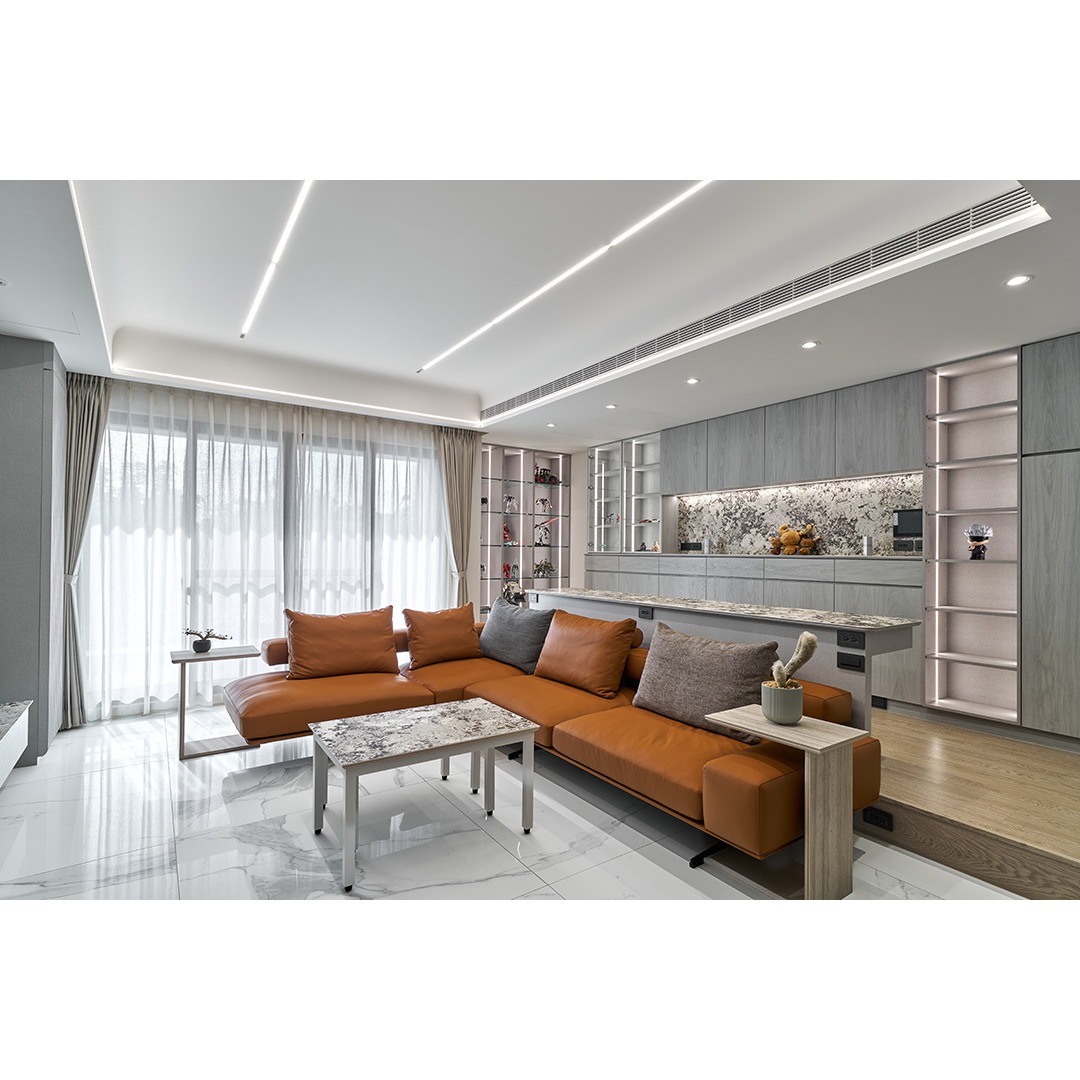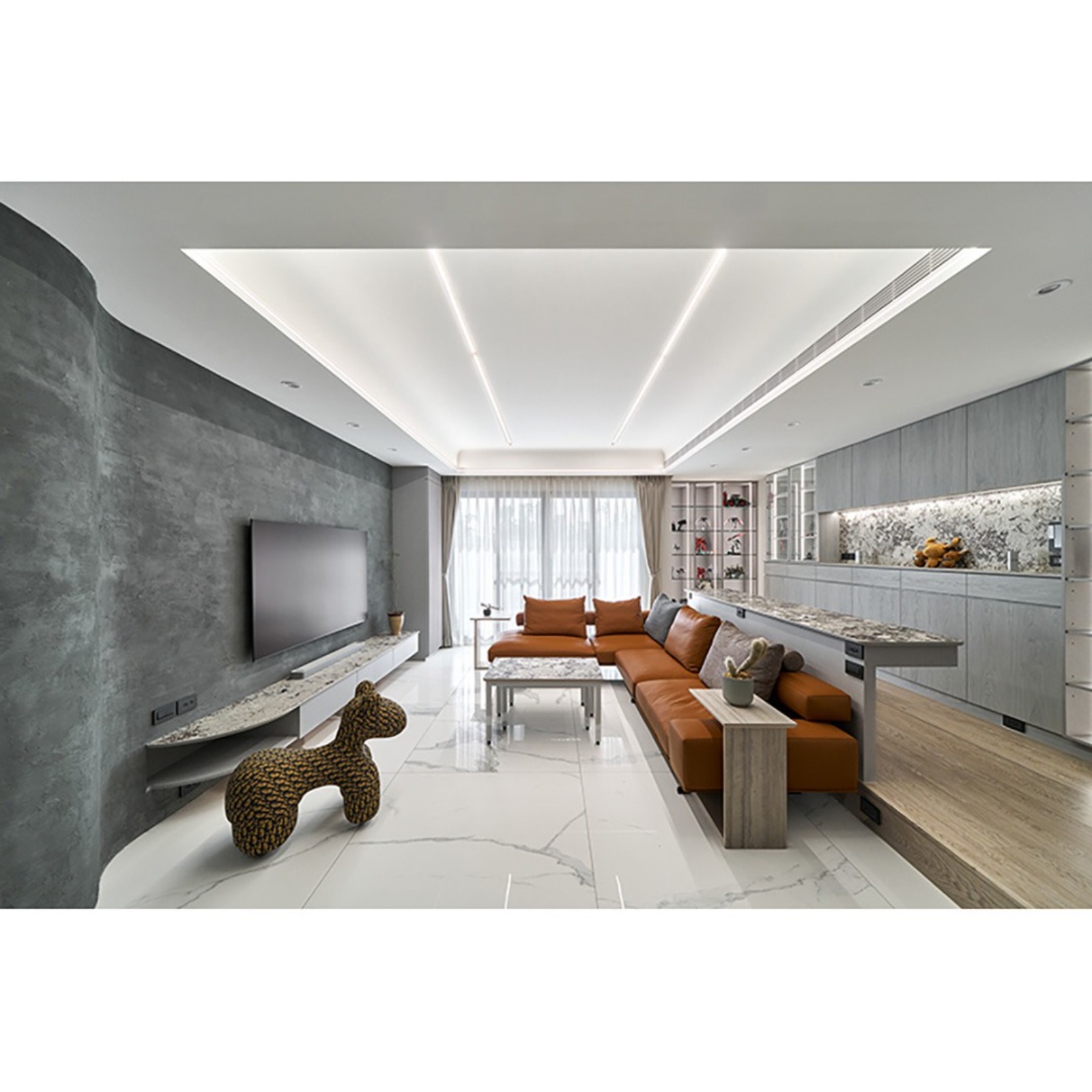 The residence in Yongkang, Tainan, is home to a family of four, with each member’s wishes woven into its design. The mother, devoted to cooking, envisioned a fluid and spacious island kitchen; the children dreamed of displaying their model collections and creating a “moon wall”; while the father hoped for a living room expansive enough to host gatherings. Guided by the theme of the moon, the designer employed muted tones and curved lines as visual language, deconstructing and reconstructing functions with subtle precision. The island and dining table can be either combined or separated—light and effortless for daily life, yet grand and accommodating for social occasions. The curved television wall, finished with layered German coatings, extends like rock strata to create depth, serving as a steady anchor for the entire family.