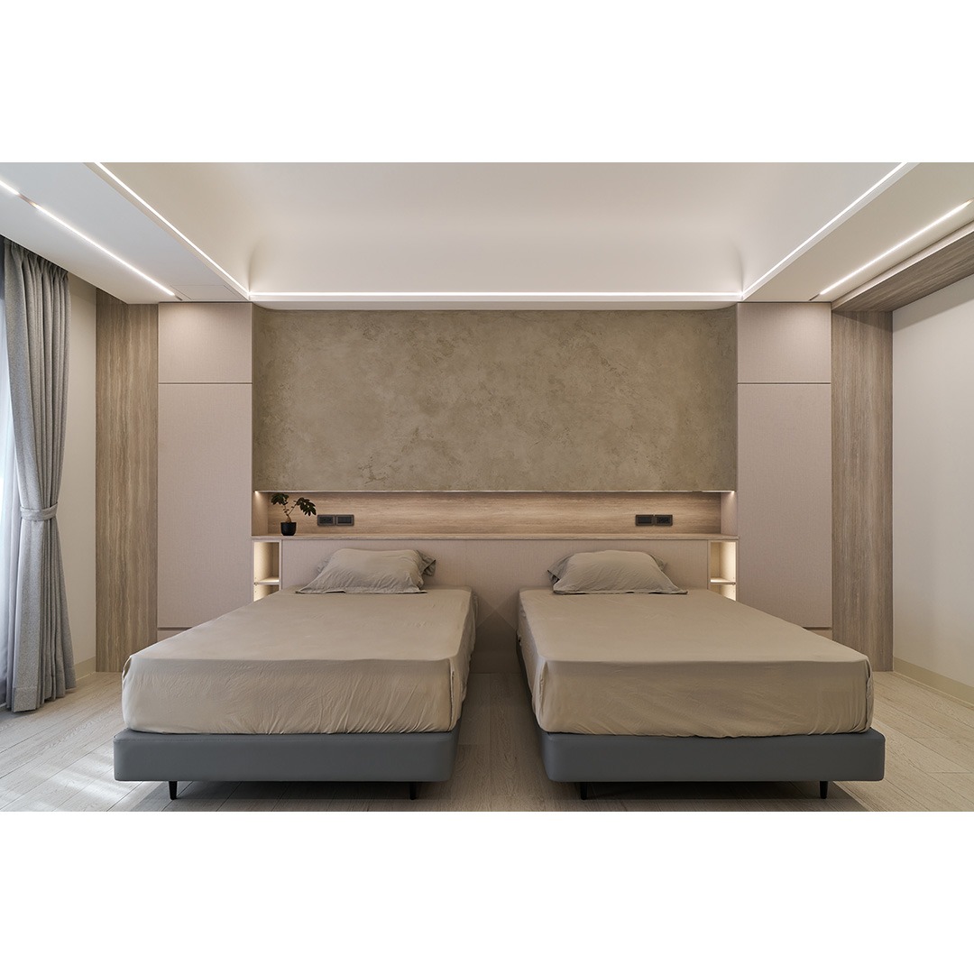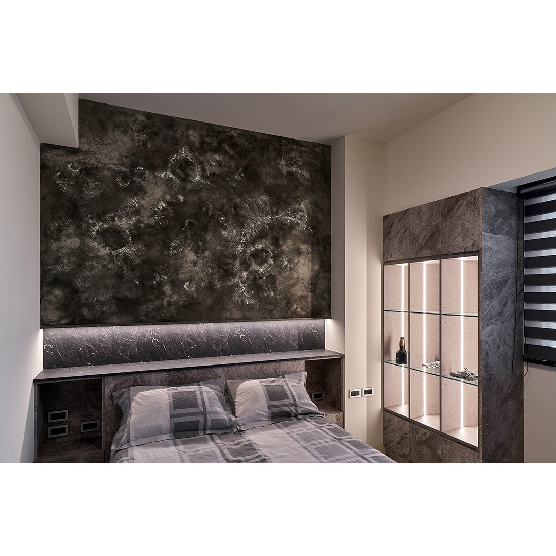 On the third floor, the master bedroom is rendered in milky brown and dried-rose hues, evoking the softness of twilight and leaving a lingering sense of warmth. The fourth-floor secondary bedrooms respond to the children’s personalities: one with rock-like textures, the other inspired by the lunar surface, each becoming a chapter of its own story. The design avoids bold colors that compete for attention; instead, it reveals the rhythm of home through the flow of light and the breath of textures. Like the moon that draws loved ones back, the home gathers its residents day by day, uniting them within its layers of texture and light.