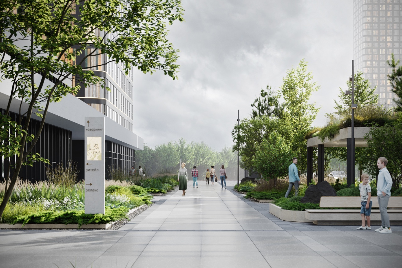 The heart of the district is a cascade park that combines recreation, education and development areas. A system of planted ditches (bioswales) for collecting and treating rainwater has been implemented here, and thematic groves become a platform for environmental excursions and acquaintance with the principles of sustainable development. “My Street 2.0” is a rethinking of the approach to creating an urban environment.