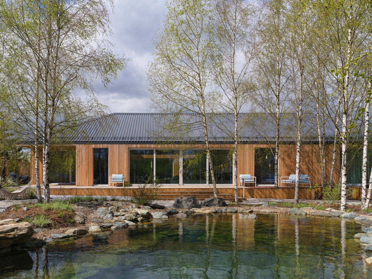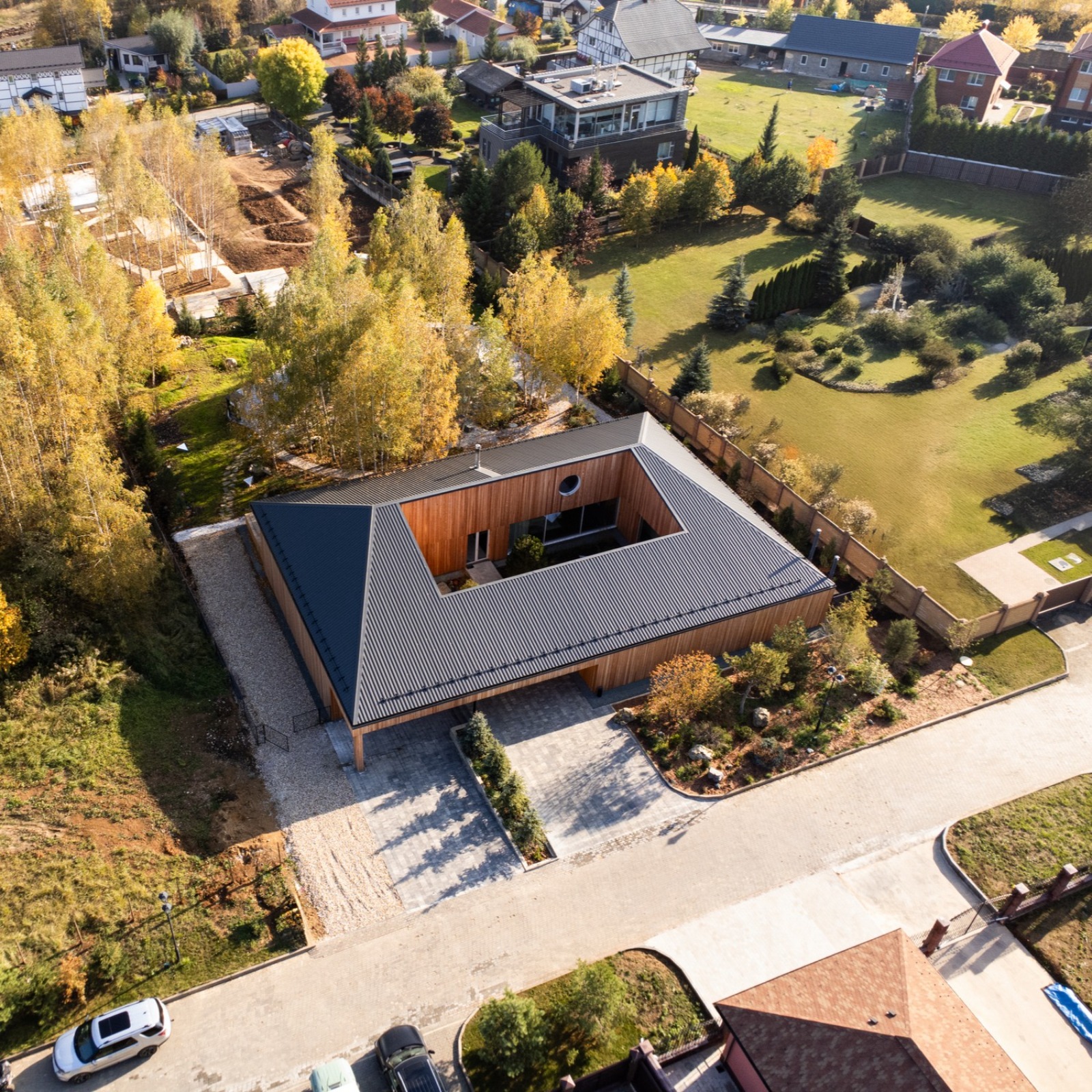 The house was conceived as a place for temporary suburban living with a focus on activity inside. Suburban real estate in this region is rarely characterized by holistic and beautiful architecture. Therefore, our main task has become not to be in the context of the environment, but rather the opposite – a house that is directed into itself.