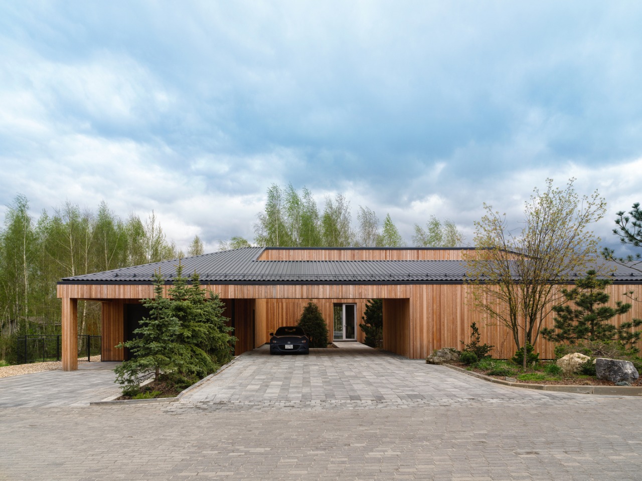 As a result of teamwork with the customer, we have a seemingly minimalistic house with echoes of the Scandinavian style. However, the complex shape of the roof and the internal atrium made the house very distinctive and recognizable. We supplemented this image with the use of industrial materials and as a result we got a rather individual and, in a sense, mystical object on the plain, inspired by the personality of its owner.