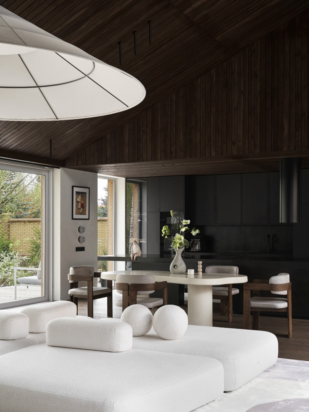 The design is based on light textured walls, a lot of warm wood to match the facade and a large number of interesting details that you want to look at. For example, a massive chandelier in the center of the main space, which emphasizes the pitched shape of the roof and the architecture of the house.