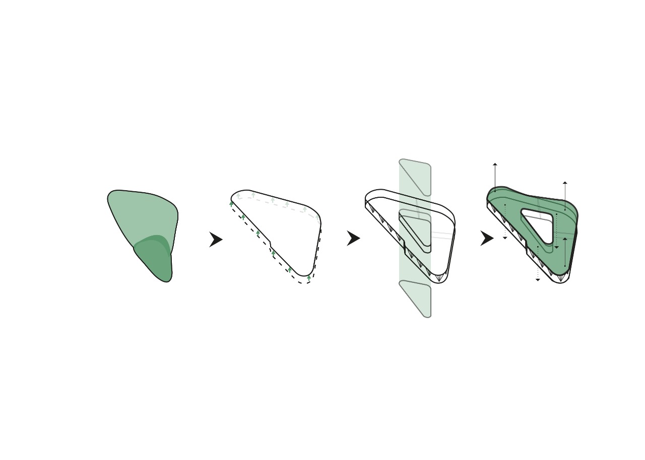 The building has the shape of a triangle with rounded corners, integrated into the environment. The green courtyard-atrium and green roof enhance the associations with nature embedded in the image.