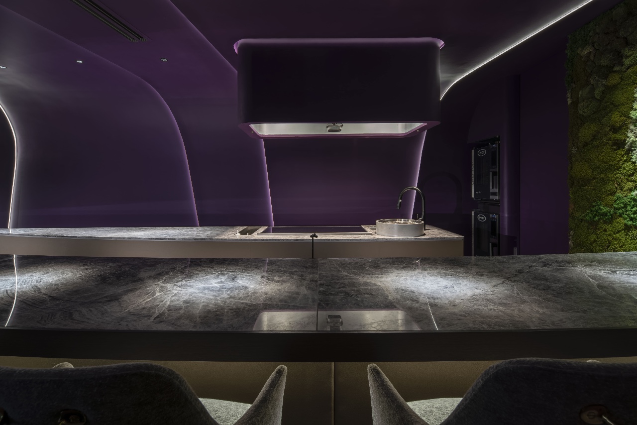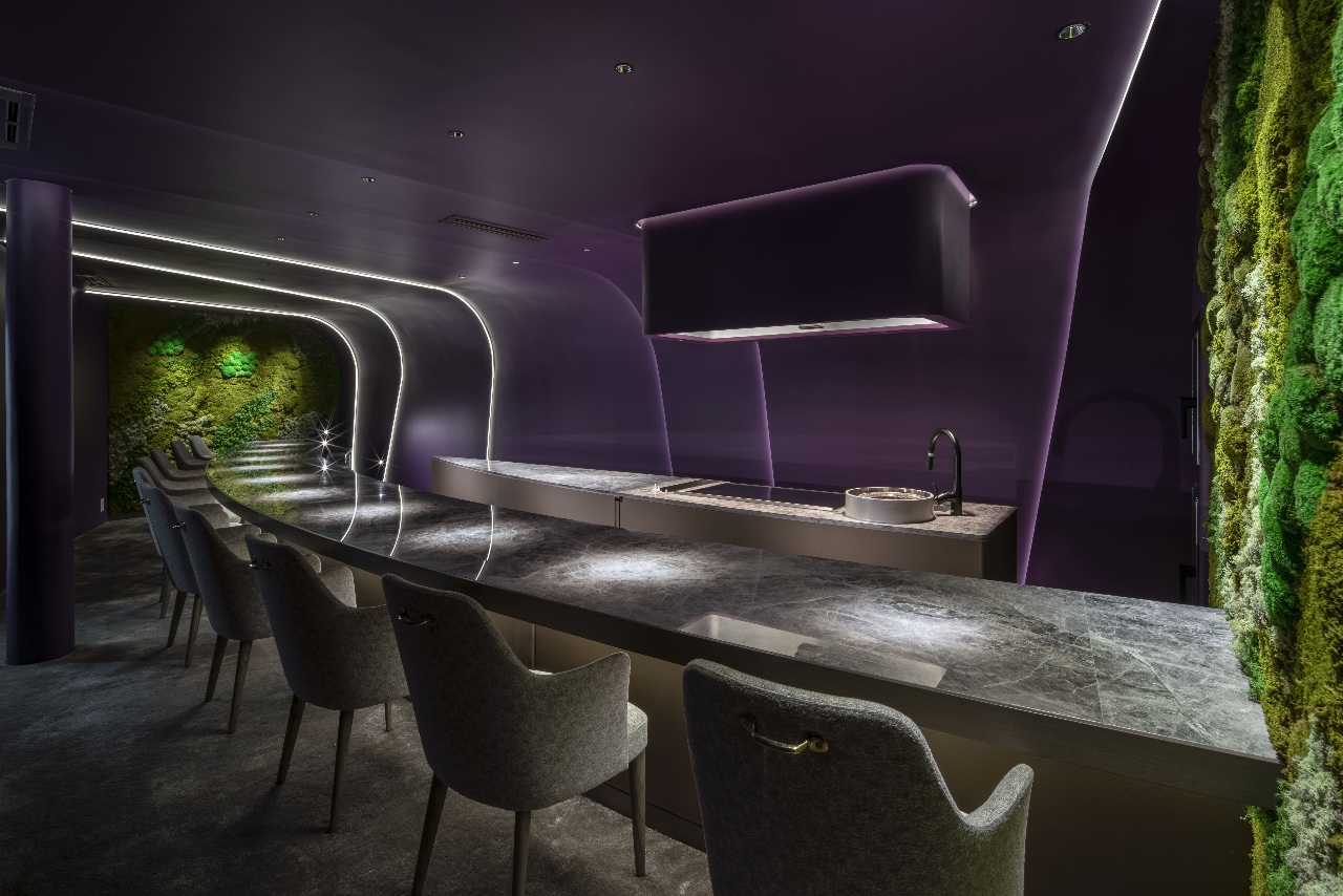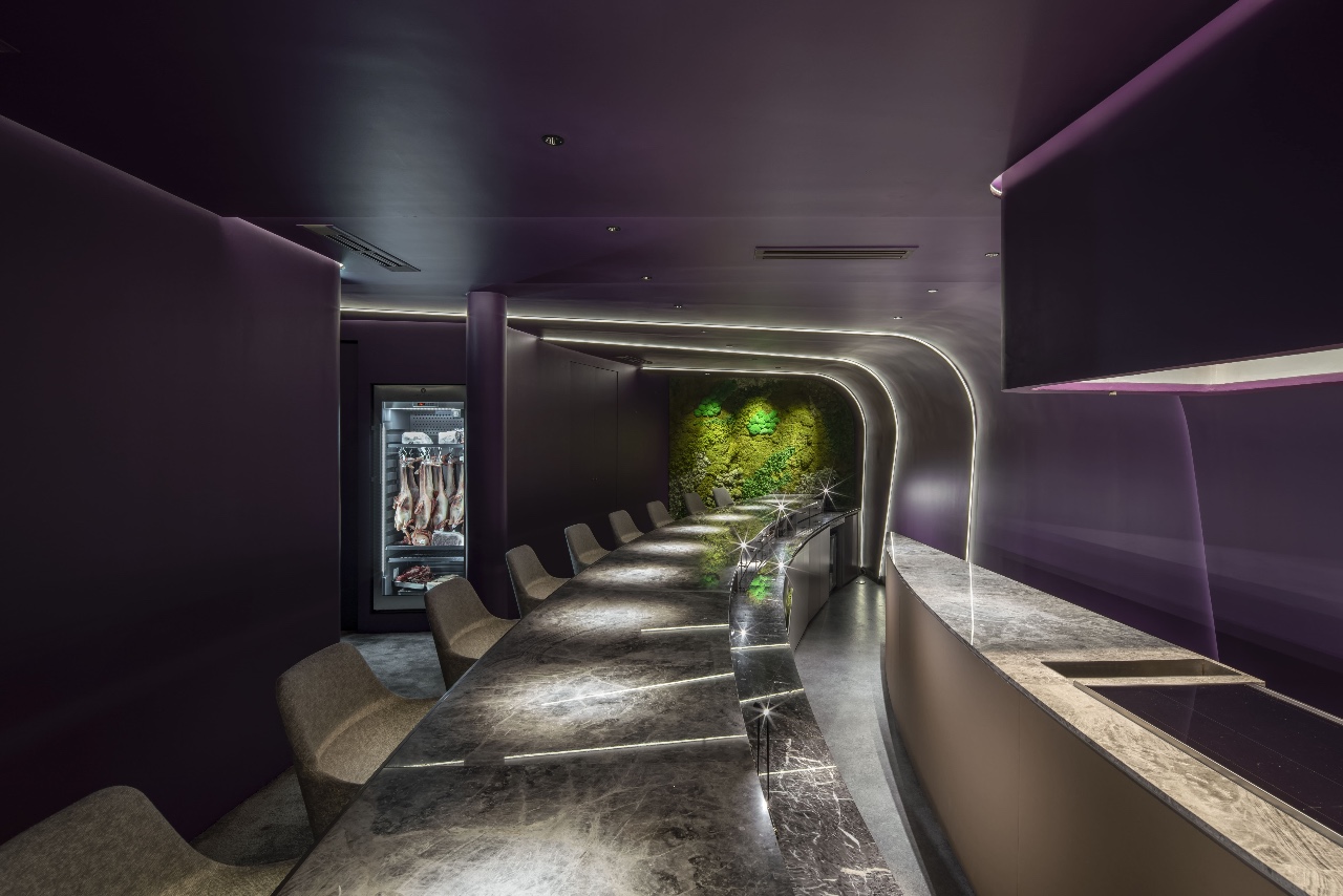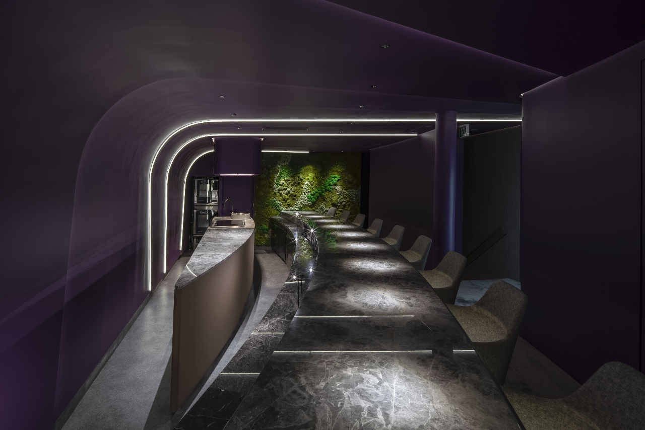 French restaurant with a theme of another dimension.There are only 10 seats.After spending some time in the waiting area on the first floor,which is decorated in soft colors, the atmosphere changes dramatically when you go up to the second floor,where a purple space spreads out before you.The ceiling and walls are seamlessly connected by seven large purple skins.You can enjoy watching the chefs prepare their dishes over a natural marble seating counter.The moss artwork on the illuminated walls matches the purple space perfectly.It is the perfect space to enjoy the food.