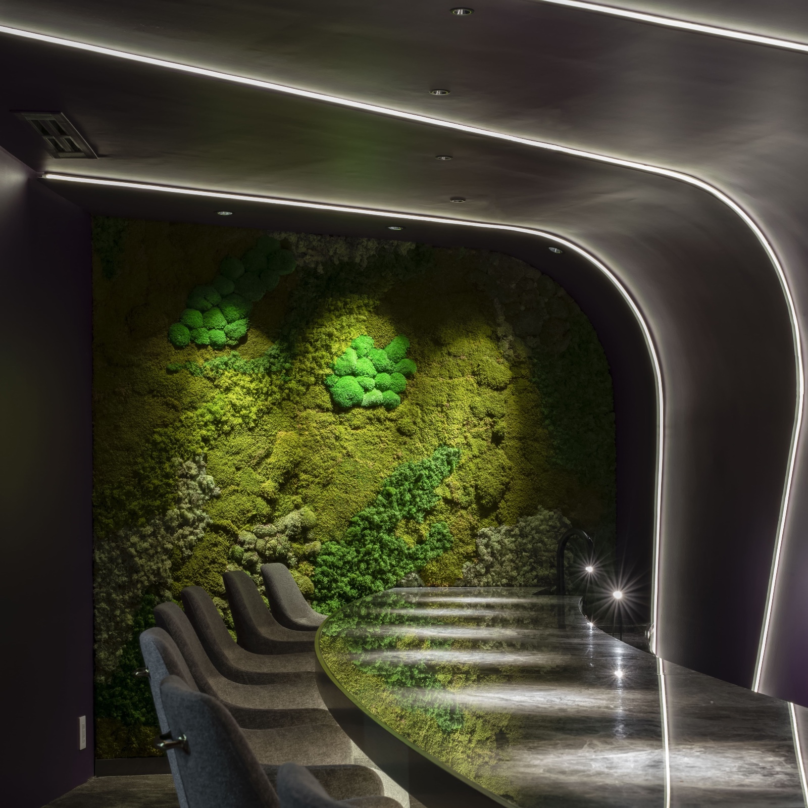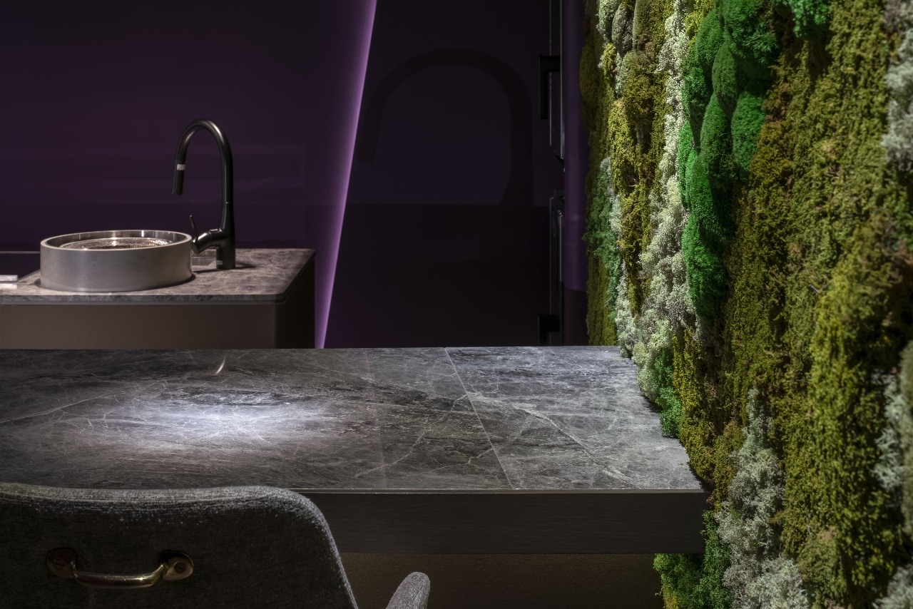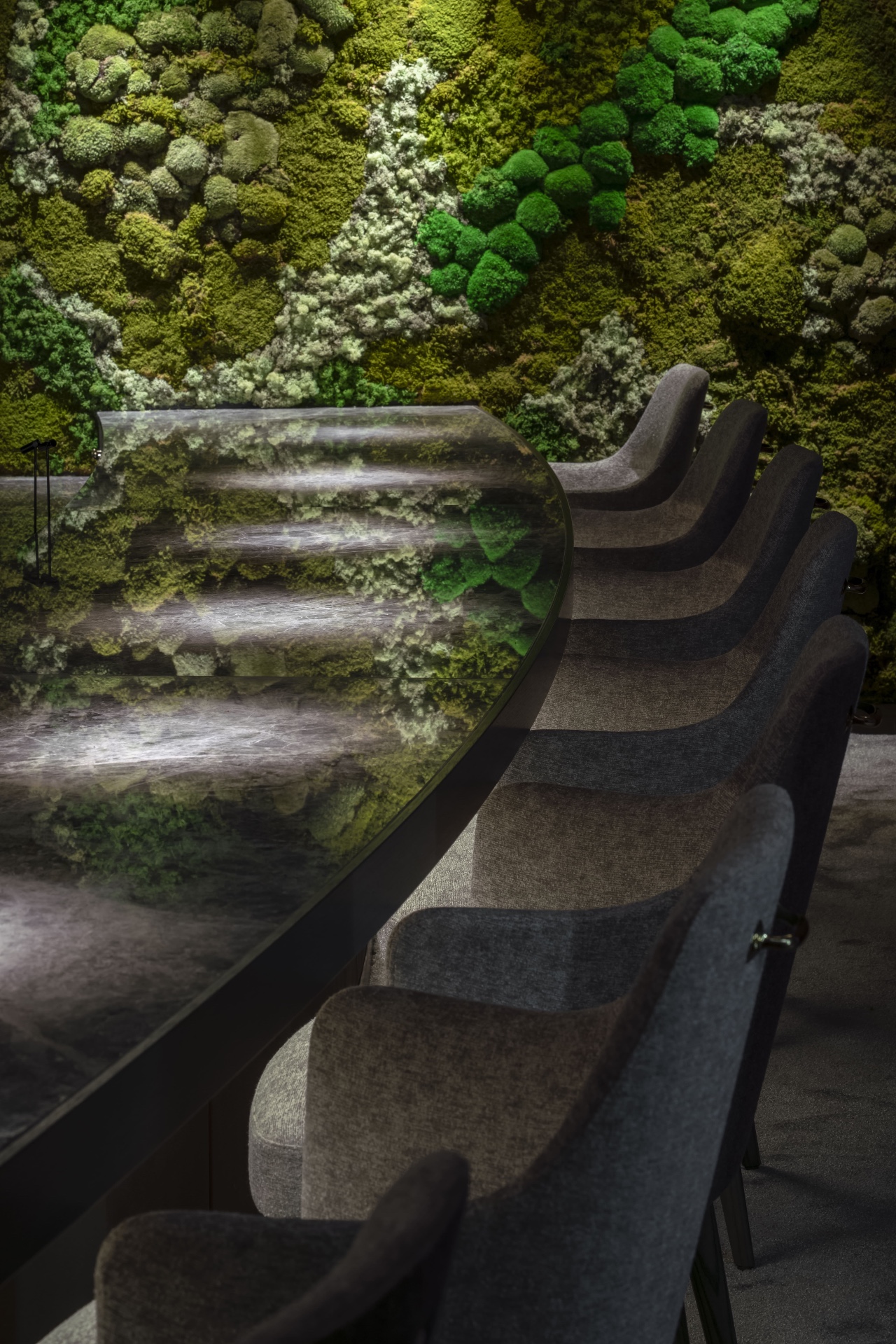 French restaurant with a theme of another dimension.There are only 10 seats.After spending some time in the waiting area on the first floor,which is decorated in soft colors, the atmosphere changes dramatically when you go up to the second floor,where a purple space spreads out before you.The ceiling and walls are seamlessly connected by seven large purple skins.You can enjoy watching the chefs prepare their dishes over a natural marble seating counter.The moss artwork on the illuminated walls matches the purple space perfectly.It is the perfect space to enjoy the food.