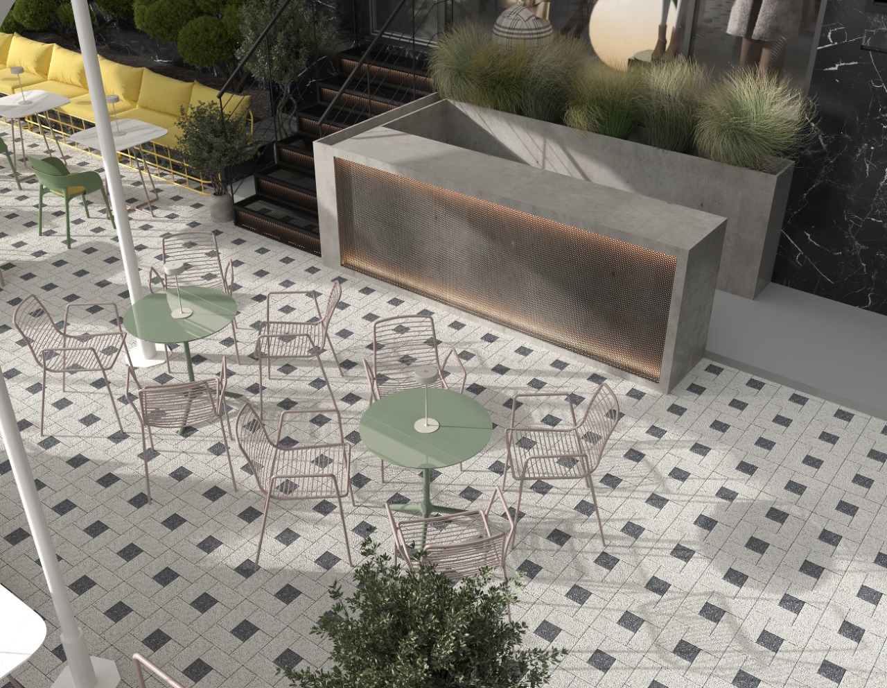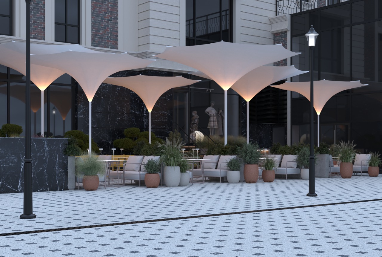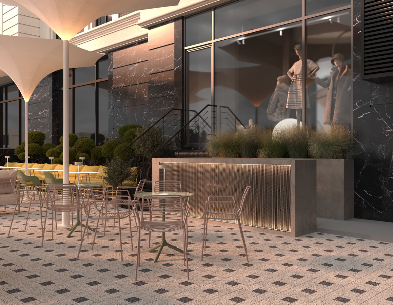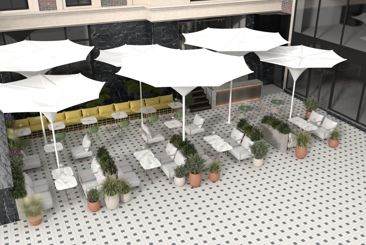 Through clean lines and balanced proportions, the terrace conveys an atmosphere of elegant relaxation, designed for social connection and mindful pauses. Ornamental vegetation placed in sculptural planters brings texture and vitality, while discreet lighting fixtures and architectural umbrellas shape a warm and inviting ambiance. The natural color palette — olive green, beige, and soft metallic accents — enhances visual harmony and sensory comfort.