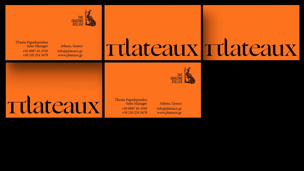 Typography plays a defining role. The use of the Greek character Π in the name Plateaux references the idea of a surface or base where things are laid out and displayed, giving the identity structure, presence and immediate recognisability.