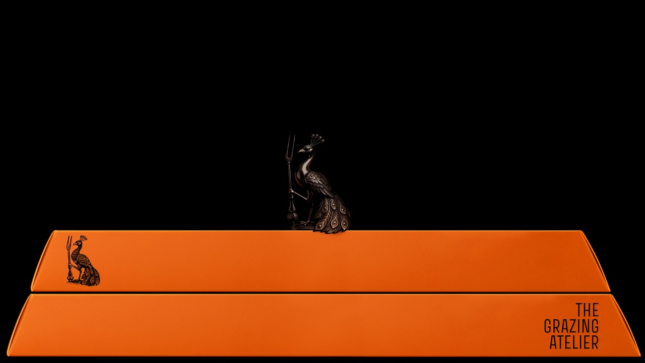 The concept “The Grazing Atelier” defines the system. Each grazing box functions as a visual tableau. The peacock, paired with an ornamented Rococo fork, references the lavish tables of the French court, establishing a maximalist and expressive tone that embraces abundance with confidence and theatricality.