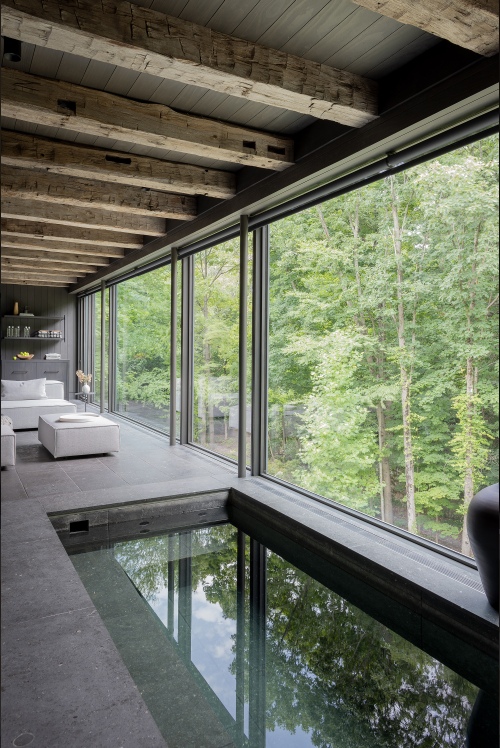 A former garden shed has been transformed into a compact spa retreat, retaining elements of the original structure. Within a modest footprint, the design integrates a soaking pool, indoor and outdoor showers, and framed views of the landscape through a continuous glass façade.