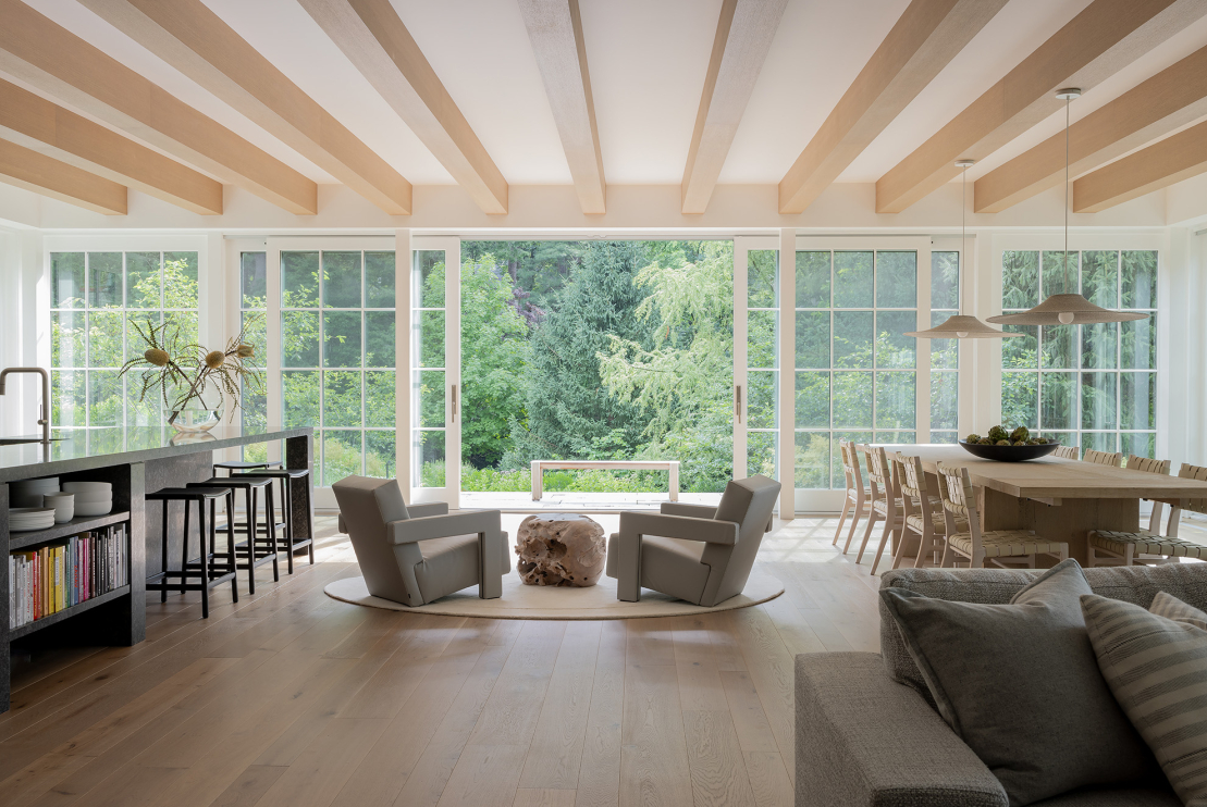 At the core of the transformation is a “life room” — a unified kitchen, dining, and living space inspired by an orangerie. Defined by oak beams and expansive glazing, it opens directly onto restored terraces and gardens, dissolving boundaries between interior and landscape. This space anchors daily life, prioritising comfort, flexibility, and connection.