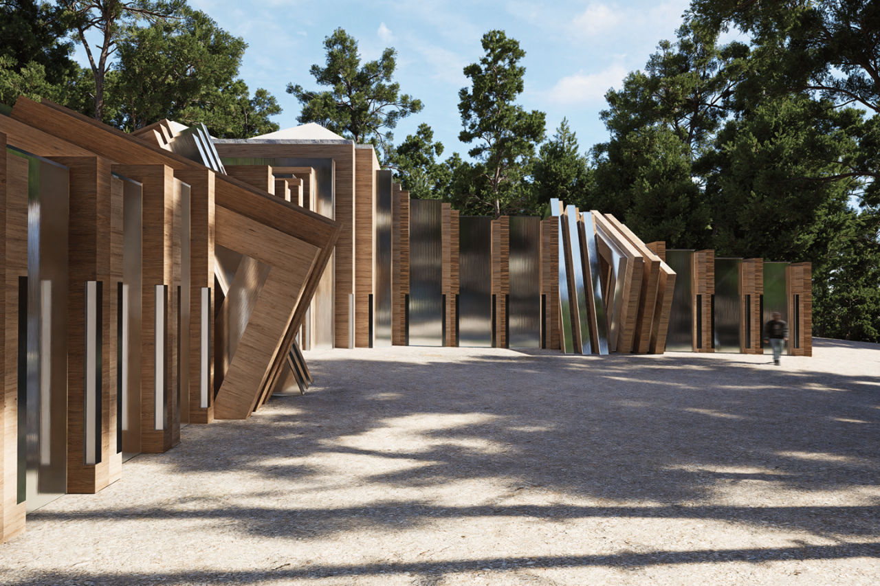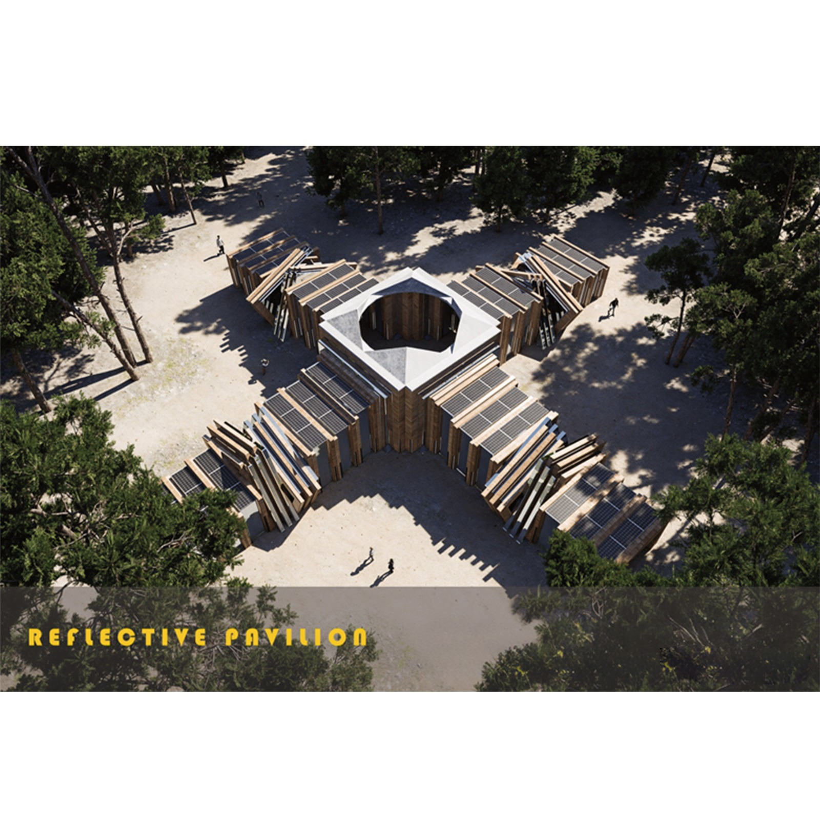 The Reflective Pavilion is a site-specific architectural installation located at the intersection of Half Dome Trail and John Muir Trail in Yosemite National Park, designed to foster a deep and contemplative connection between visitors and the natural world. Drawing inspiration from sacred geometry and Platonic solids, the pavilion is organized around a central hexahedral volume, framed by a radial array of prefabricated mass timber elements. The integration of brushed recycled aluminum panels creates a refined, subtle reflectivity that captures light, movement, and atmosphere without glare, enhancing the spatial and emotional experience. A central skylight introduces natural daylight into the core of the structure, animating the interior with dynamic shadow play and establishing a direct visual link to the sky.