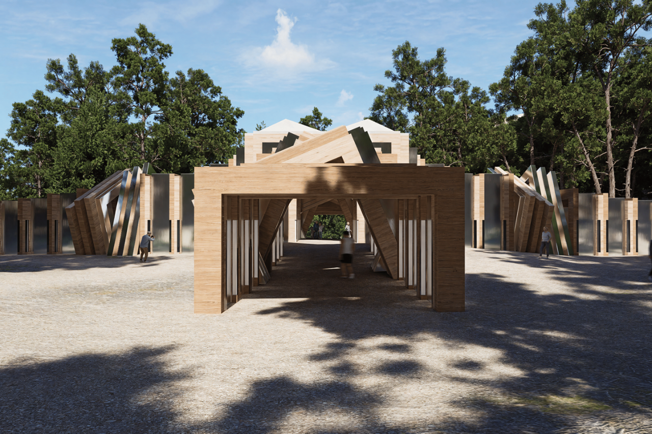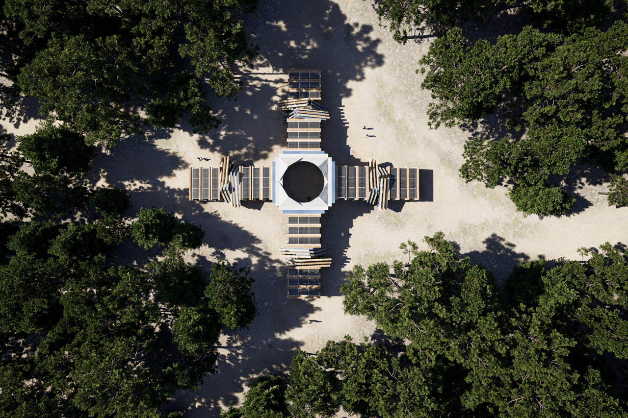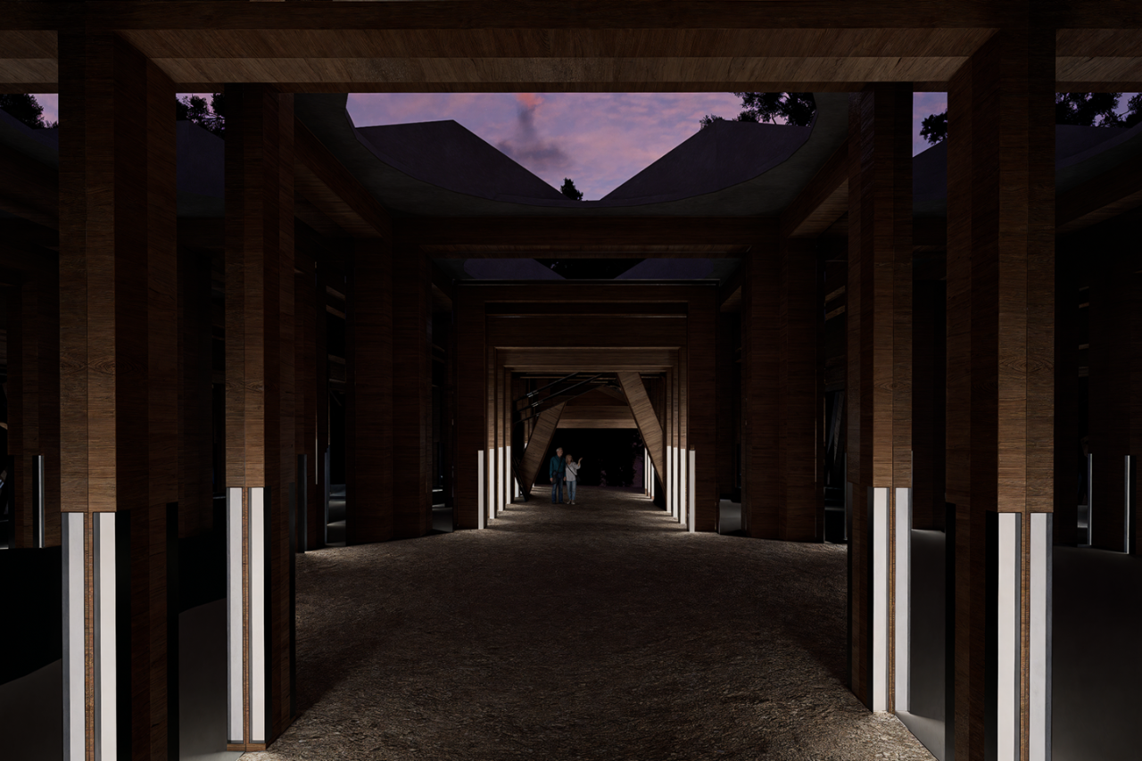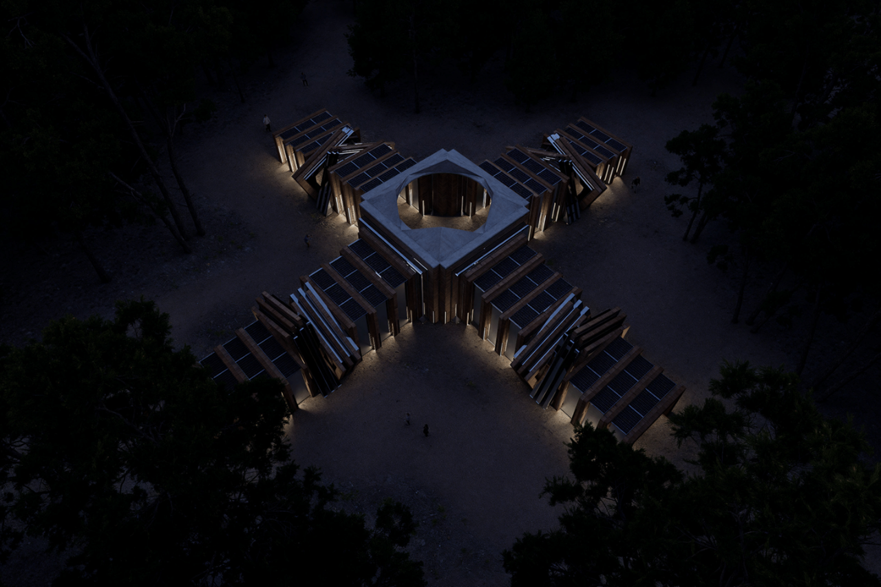 The design prioritizes sustainability, utilizing low-carbon concrete, renewable materials, and solar panels coupled with a battery energy storage system to support off-grid operation. All components are digitally modeled and CNC-fabricated off-site, allowing for precise, low-waste assembly using traditional mortise and tenon joinery adapted to modern mass timber systems. The pavilion is conceived as a multi-use public space — a setting for contemplation, stargazing, and cultural programming including picnics, acoustic performances, and storytelling. Safety is ensured through the use of fire-rated materials, seismic-resistant timber joinery, and a low-impact foundation system that preserves the site’s ecological integrity.