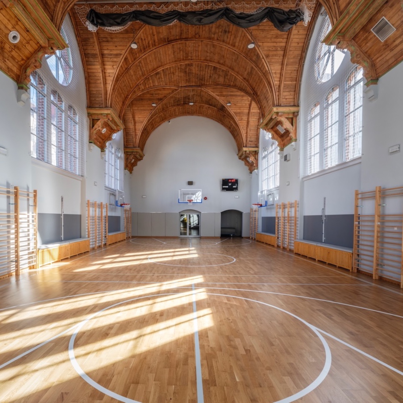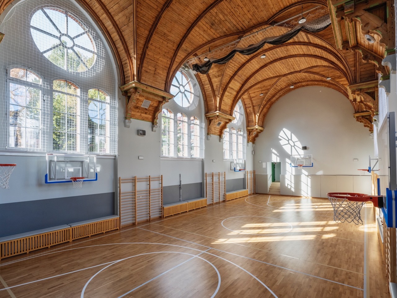 The project concerns the revitalisation of a historic neo-Gothic gymnasium located within the Primary School No. 1 complex in Szczecin. Built at the turn of the 19th and 20th centuries, the hall represents a rare example of early school sports architecture, combining functional clarity with refined historic detailing.