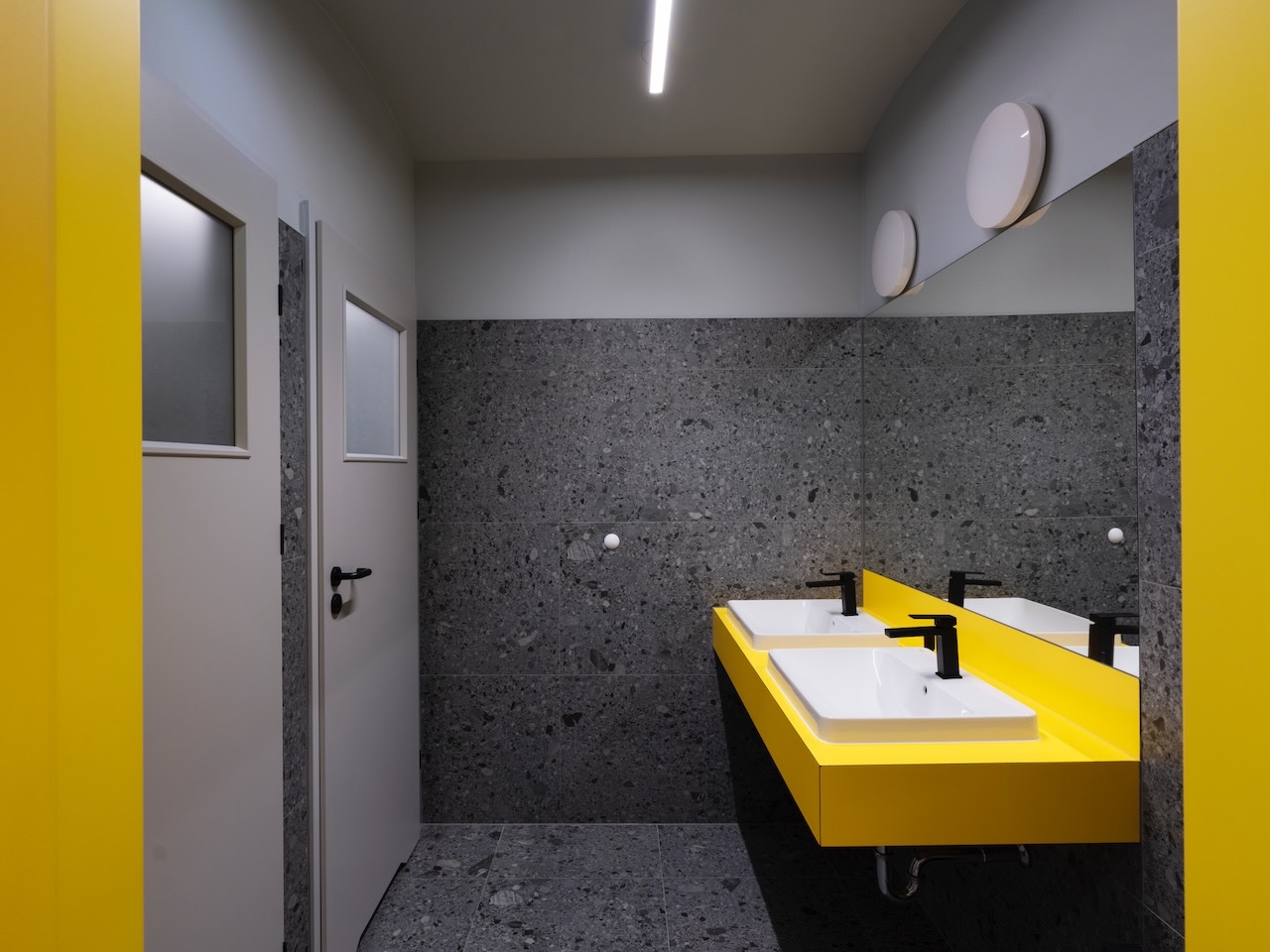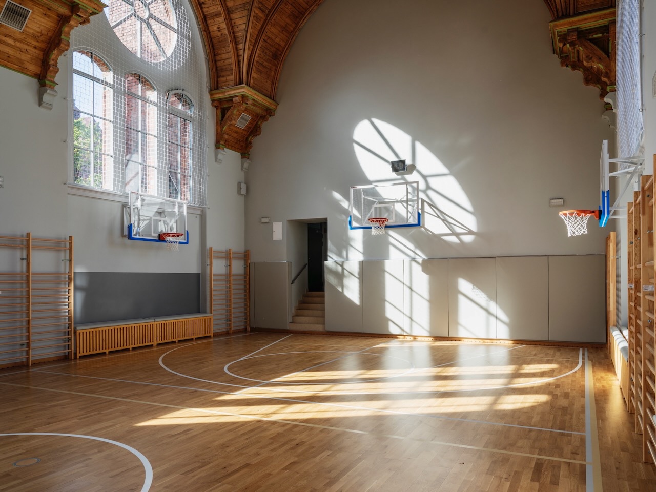 The revitalised hall meets contemporary standards for school sports facilities. Modern, technologically advanced solutions were implemented, including a high-performance wooden sports floor suitable for multiple disciplines. Lighting, ventilation, acoustics and safety systems were carefully coordinated to support intensive daily use by pupils while preserving the historic character of the space.