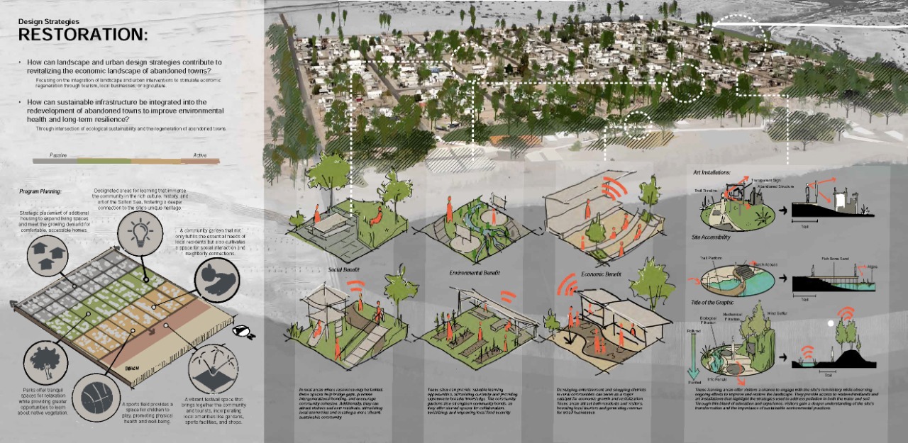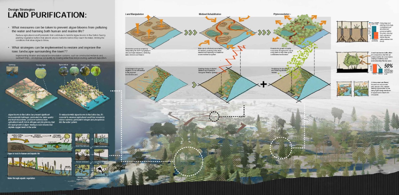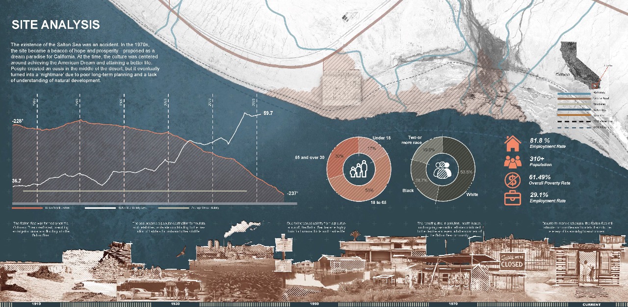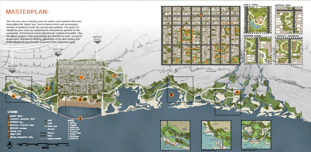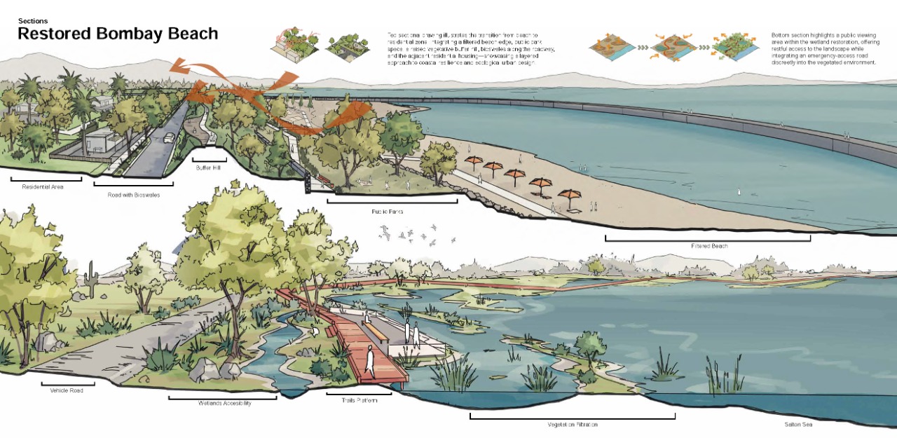 abandoned structures, and a small yet resilient community that continues to call this place home.This project focuses on Bombay Beach because it offers a unique opportunity to address significant environmental damage while preserving and honoring the social and cultural identity that remains. It explores ways to restore the ecology of the Salton Sea while also improving the health and well-being of the people who still live there. The site offers a rare chance for andscape architecture to address the intersection of ecological repair, public health, and cultural memory. The project’s goal is to heal both the land and its people. Through strategies such as terrain alteration, water and land puification, and socialrestoration, this project reimagines Bombay Beach as a place where both people and ecosystems can once again thrive. It is not solely about repairing what has been damaged; it is about creating space for community, memory, and renewal. The design invites engagement by offering spaces for gathering, reflection, and reconnection with the land, all while acknowledging the site’s history and envisioning a more hopeful future.