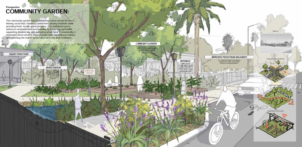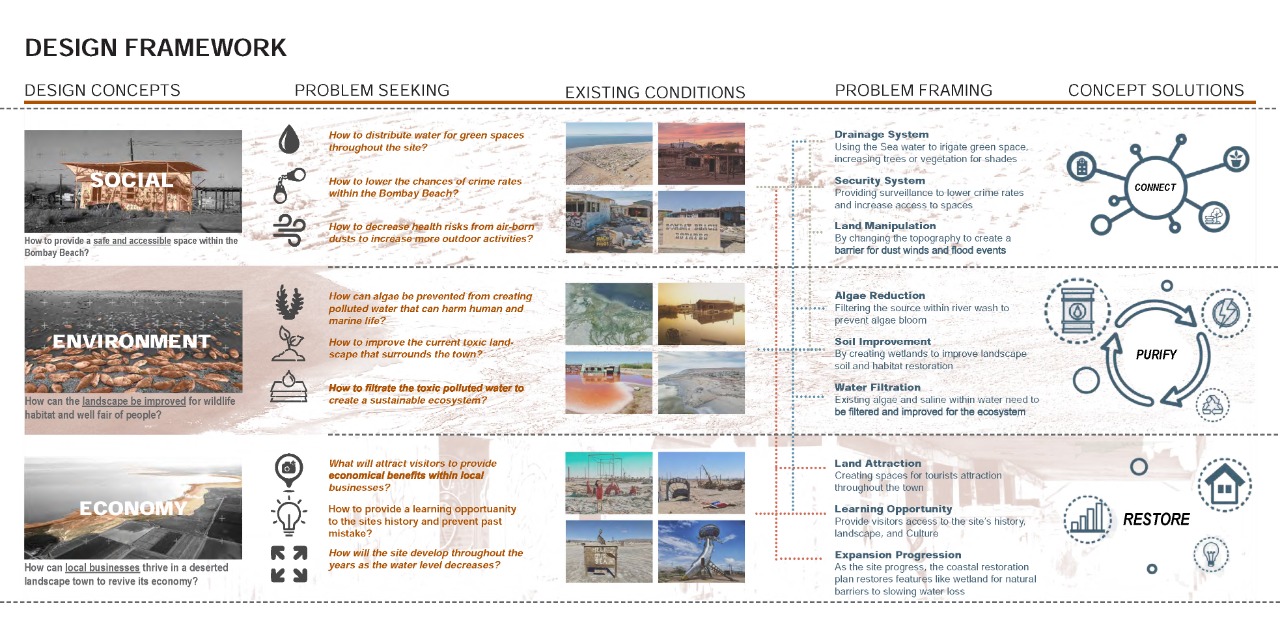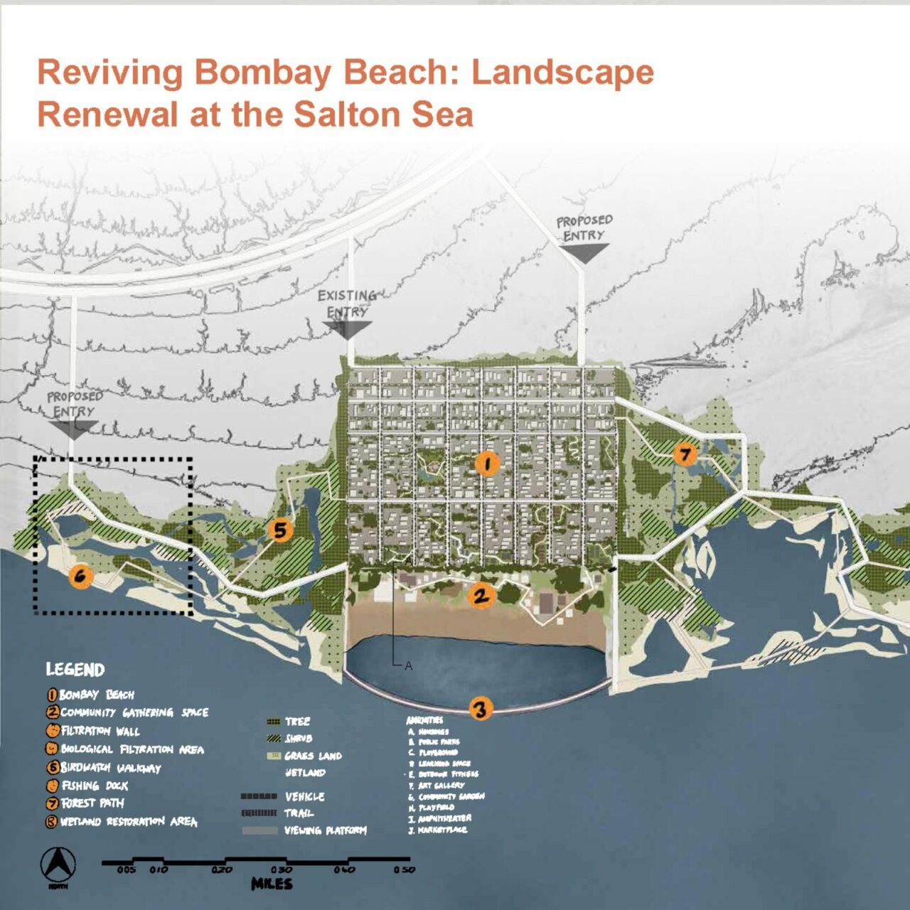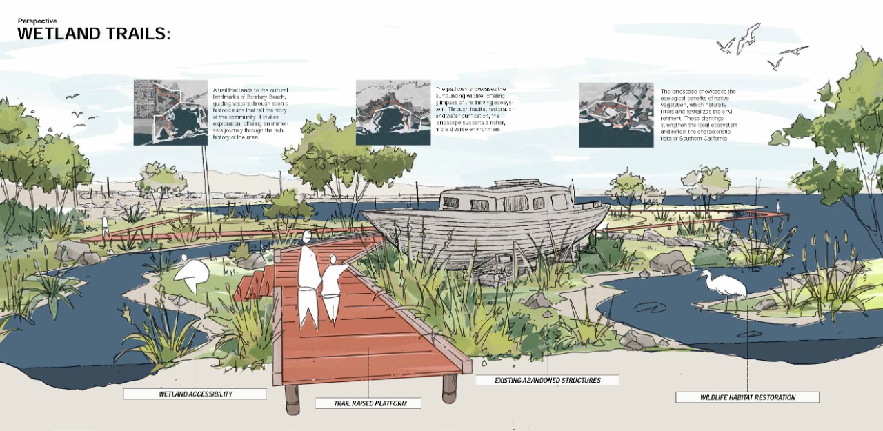 abandoned structures, and a small yet resilient community that continues to call this place home.This project focuses on Bombay Beach because it offers a unique opportunity to address significant environmental damage while preserving and honoring the social and cultural identity that remains. It explores ways to restore the ecology of the Salton Sea while also improving the health and well-being of the people who still live there. The site offers a rare chance for andscape architecture to address the intersection of ecological repair, public health, and cultural memory. The project’s goal is to heal both the land and its people. Through strategies such as terrain alteration, water and land puification, and socialrestoration, this project reimagines Bombay Beach as a place where both people and ecosystems can once again thrive. It is not solely about repairing what has been damaged; it is about creating space for community, memory, and renewal. The design invites engagement by offering spaces for gathering, reflection, and reconnection with the land, all while acknowledging the site’s history and envisioning a more hopeful future.
