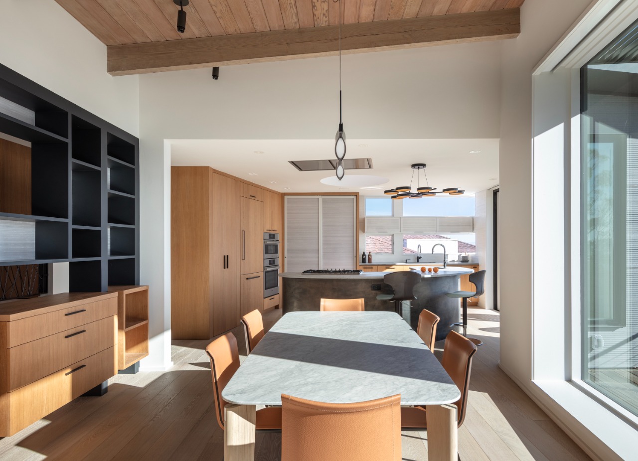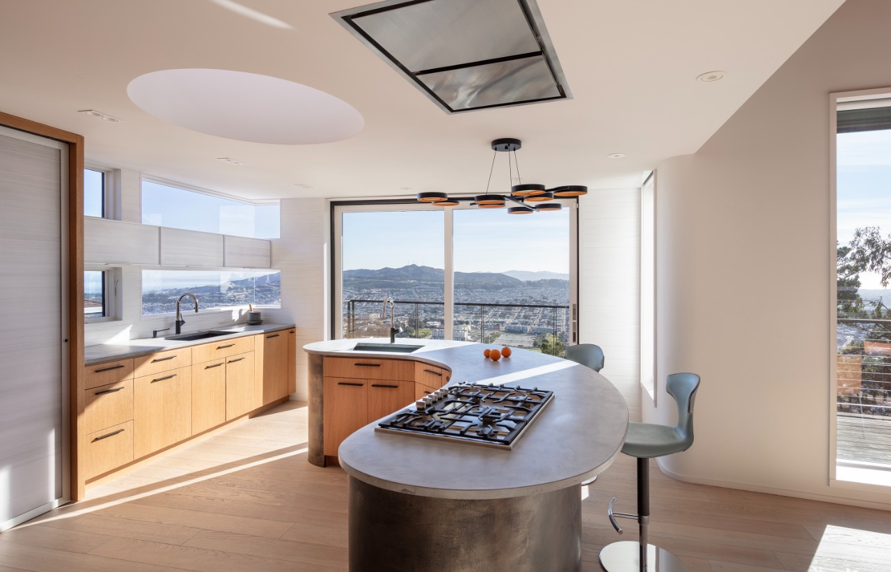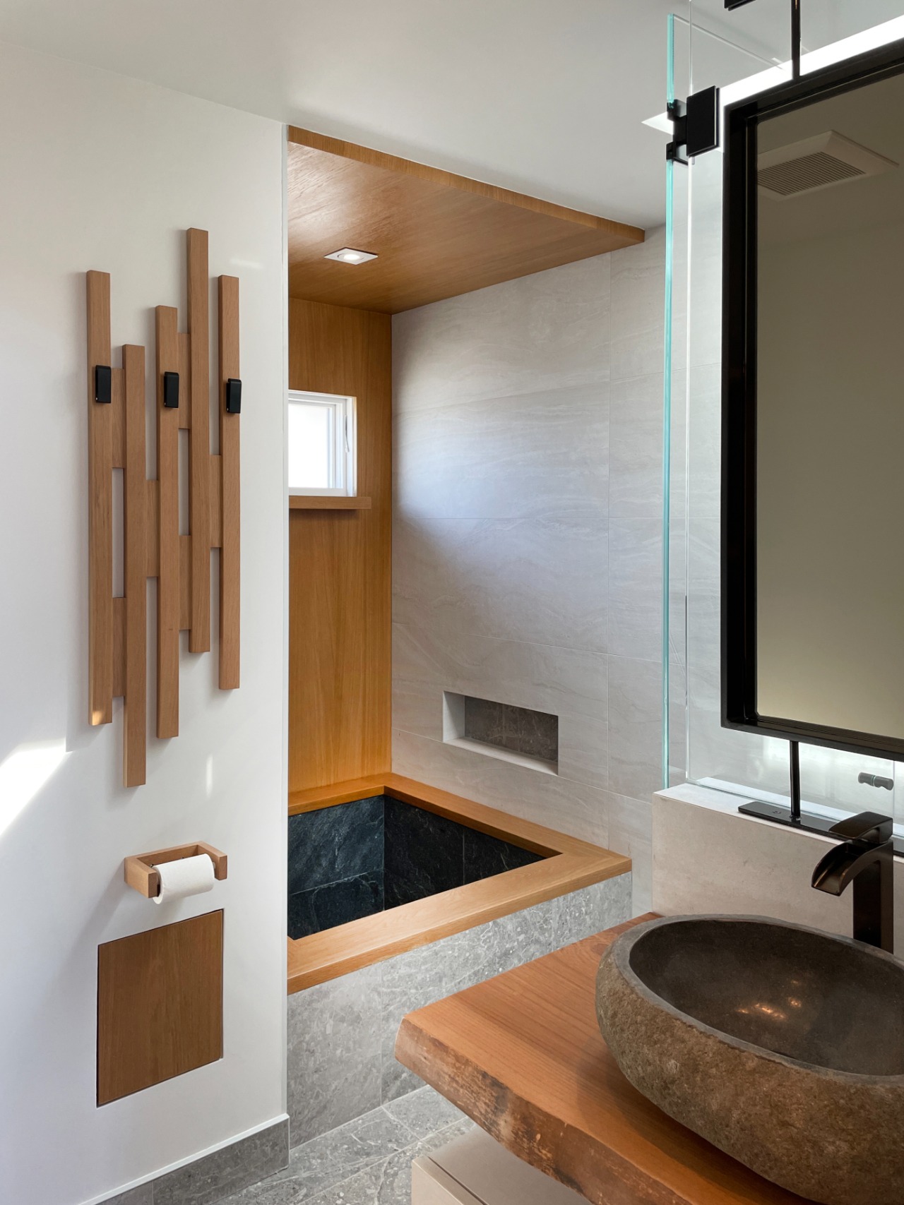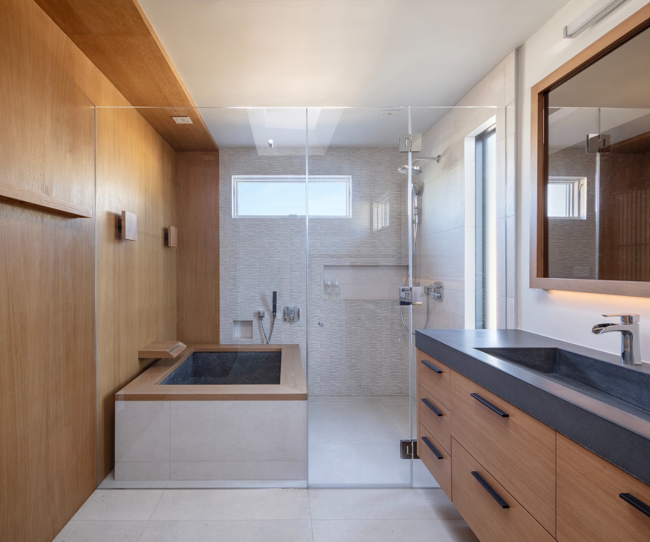 Handcrafted wood details, an amorphous-shaped island with a hand-troweled concrete counter and a simplicity of detail throughout make this house comfortable yet modern. Custom designed soaking tubs, a tatami room and the clean wood details work together to give the house a modern, warm feel without feeling too over-designed.
