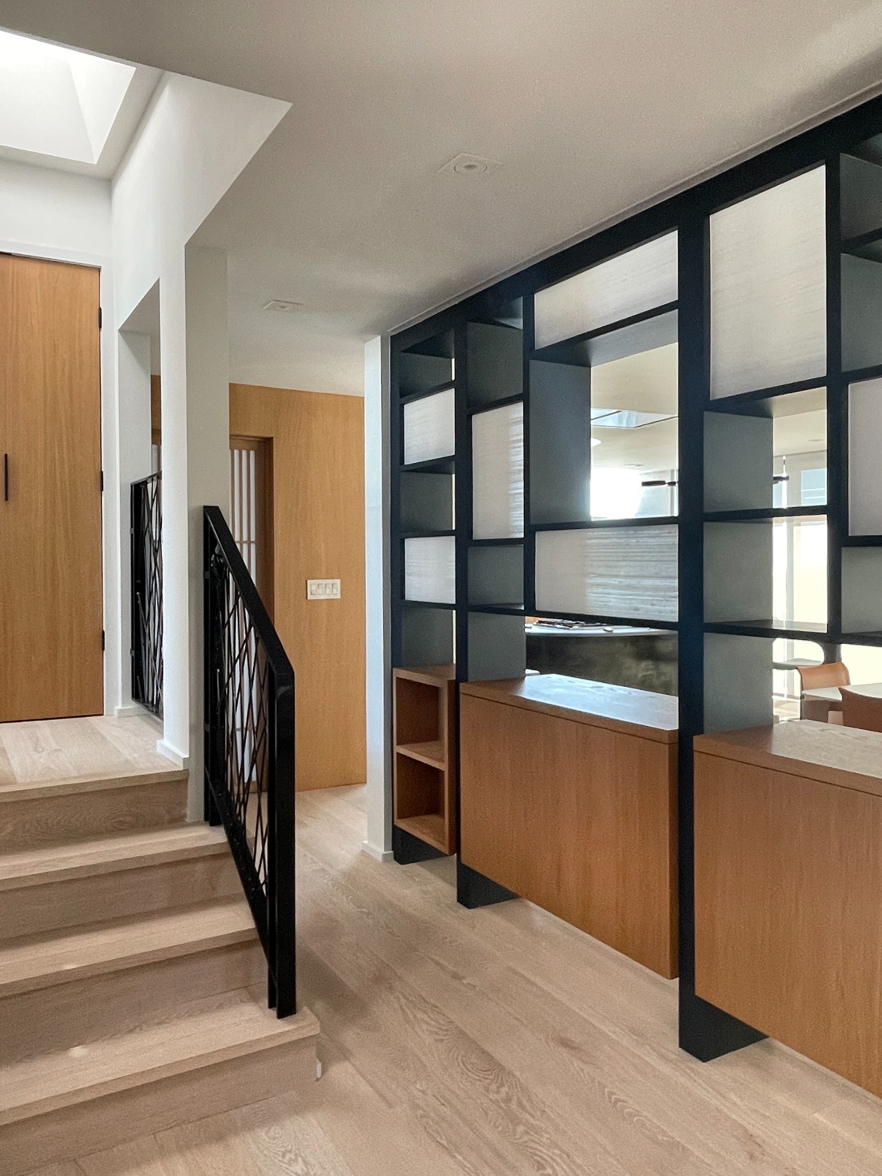 The goals were simple – modernize the house, open it up and give better access to the outdoors while giving the home a touch of Japanese feel, harkening back to the owner’s home country. The original kitchen was an odd L-shaped space and cut off from the rest of the house – making it part of the public spaces of the house was paramount. The rear deck was also oddly designed, as the only portion on the same level with the house was directly off the kitchen – the main deck was half a level down and there was no direct access from the living room. Resolving these issues was the crux of the design challenge.