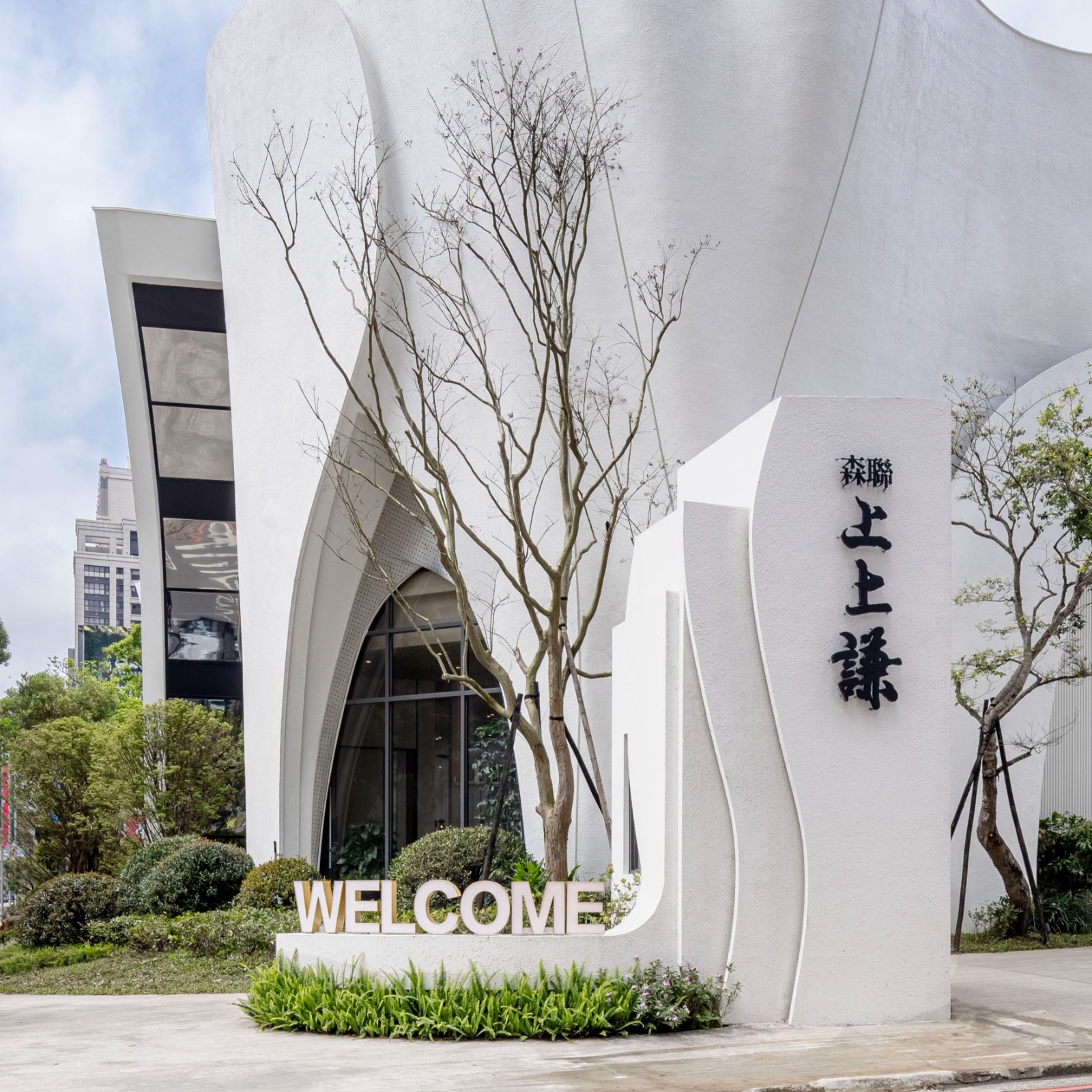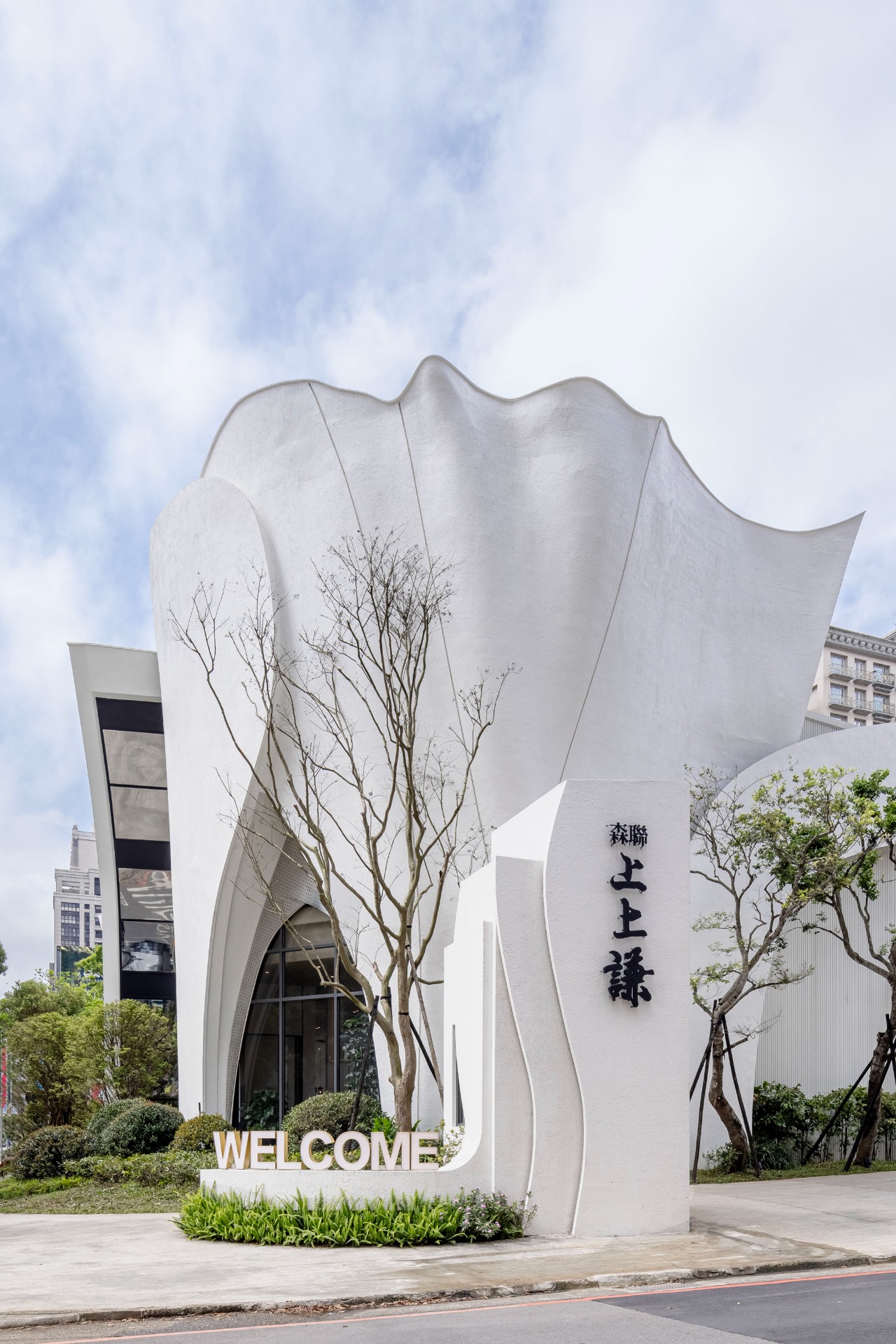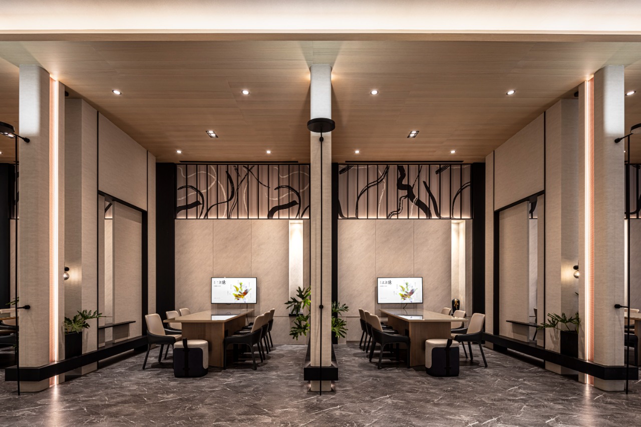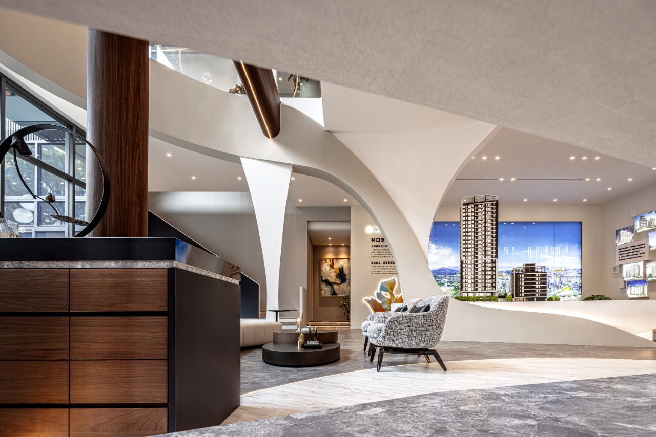 This innovative commercial space intricately weaves the captivating imagery of “seeds taking root and blossoms unfurling” into its design, creating a harmonious connection between architecture and nature. The exterior boasts overlapping curved layers that gracefully mimic the delicate shape of petals. Complementing this organic form, dappled tree shadows dance across the façade, resulting in a soft, poetic visual effect that invites exploration. Upon entering, one will be greeted by a breathtaking soaring curved ceiling that elegantly connects the first and second floors. This architectural feature not only enhances the sense of openness but also draws the eye upward, inviting visitors to appreciate the beauty of the space. Light strips intricately tracing the curves illuminate the interiors, further emphasizing the dynamic motion of a flower as it unfolds. The choice of materials thoughtfully blends warm wood textures with sleek matte metal finishes, creating a balanced aesthetic. Accents of ironwork add a refined touch, elevating the overall sophistication of the design. Each element within this space works in harmony, inviting visitors to experience a seamless journey through nature-inspired artistry.