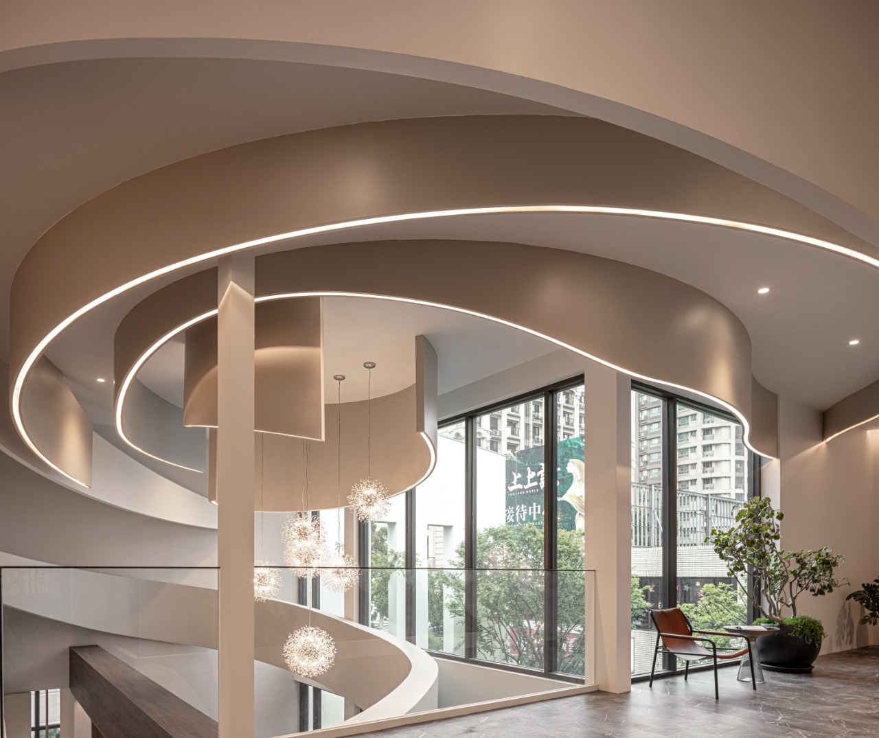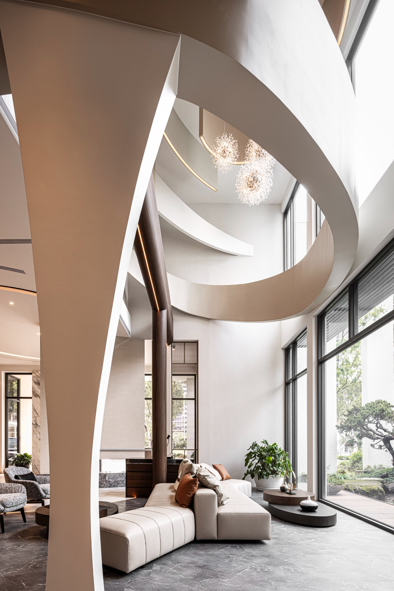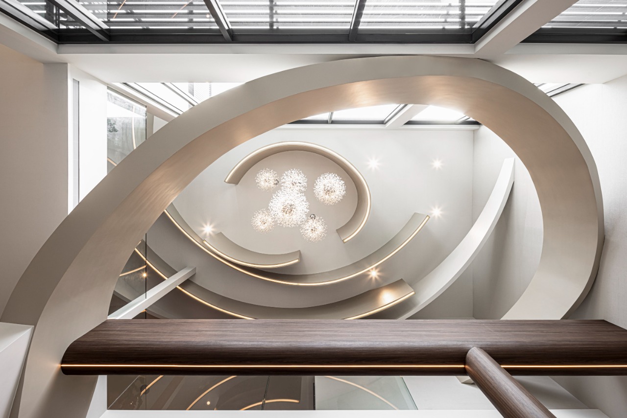 The spiral staircase, in essence a large-scale sculpture, elegantly features an upward-arching curve that symbolizes a seed taking root. As one ascends, the handrail and ceiling curve seamlessly unite, enhancing the visual flow. This design creates an immersive experience, where the rhythmic movement feels as if it is surrounded by delicate petals. Furthermore, spherical pendant lights bloom at the apex like flower stamens, anchoring the visual focal point across multiple floors.