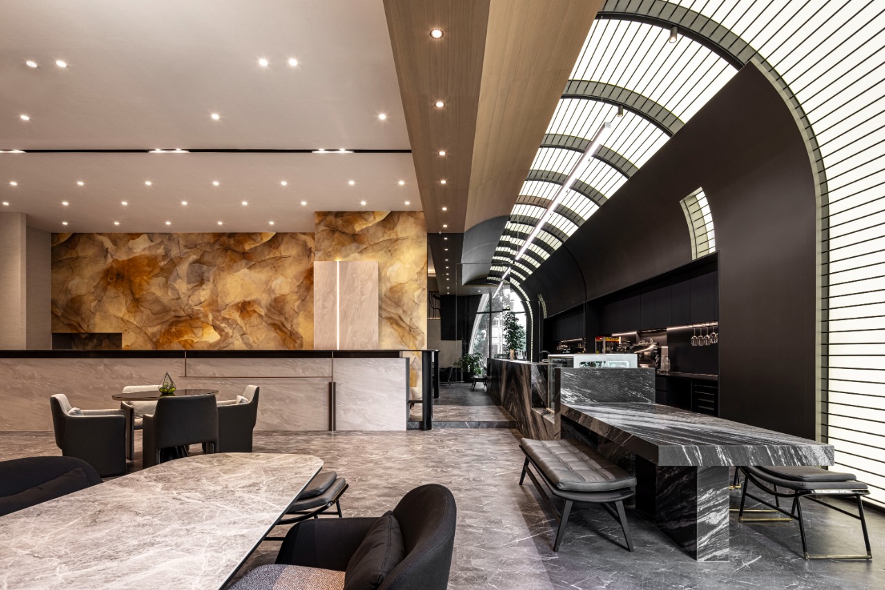 The interior design is characterized by gracefully curved white walls and ceilings, which beautifully merge with recessed and linear light strips that subtly illuminate the contours, thereby enhancing the sense of fluidity throughout the space. As you enter the first-floor lobby, you are greeted by a variety of thoughtfully arranged sofas that invite relaxation and conversation. The main wall behind the reception counter stands out as a captivating focal point, adorned with a striking yellow marble finish that commands attention.