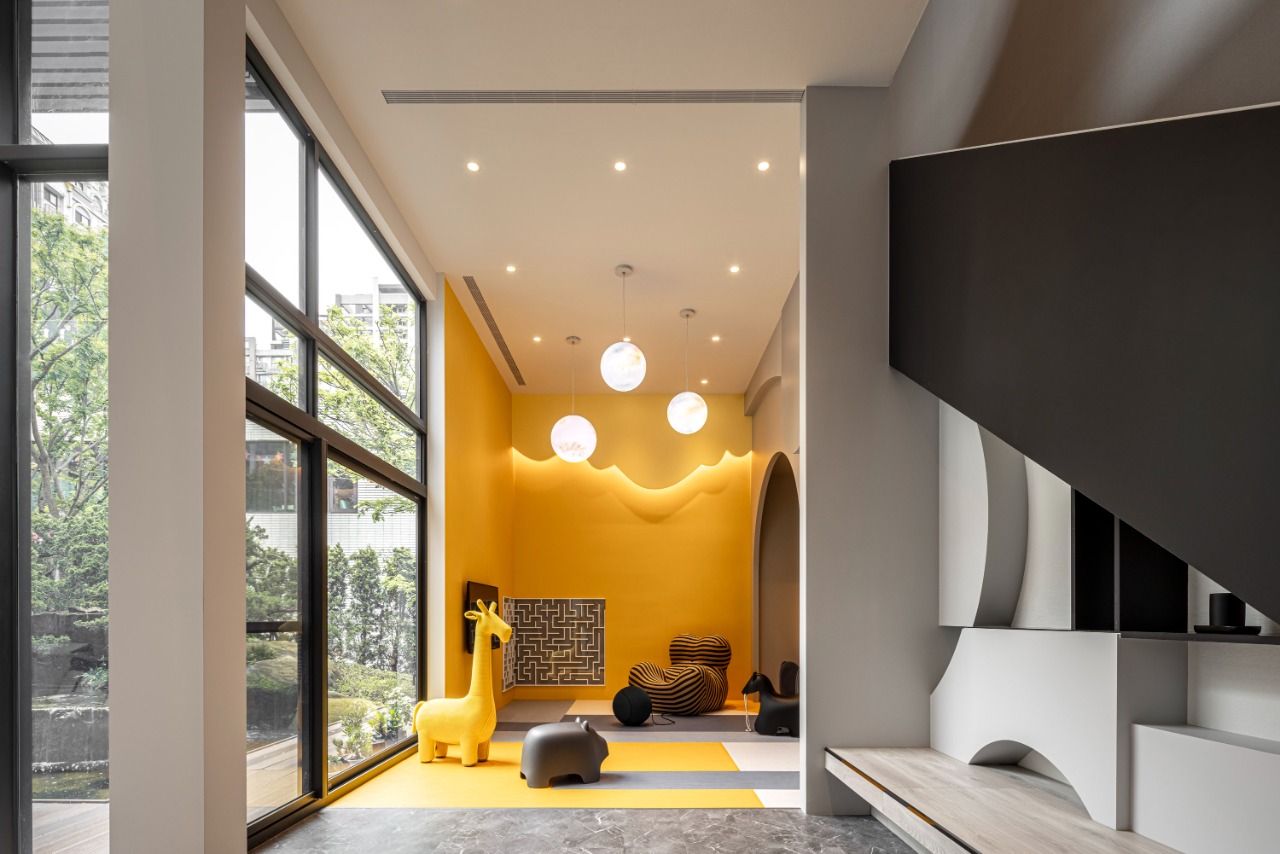 Transitioning into the meeting areas, one will discover multiple semi-open zones featuring light gray fabric upholstery, which, alongside warm orange light strips, creates an inviting and intimate atmosphere ideal for collaboration. Meanwhile, the bar area captivates with its unique arched grid ceiling adorned with a light membrane, complemented by strategically placed mirrors and a sophisticated black marble island that together extend the visual boundaries of the space. Moreover, the children’s play area bursts with energy, boasting bright yellow walls and whimsical color-blocked flooring. This vibrant setting not only draws the eye but also provides a safe and engaging environment for young ones to explore and enjoy their activities.