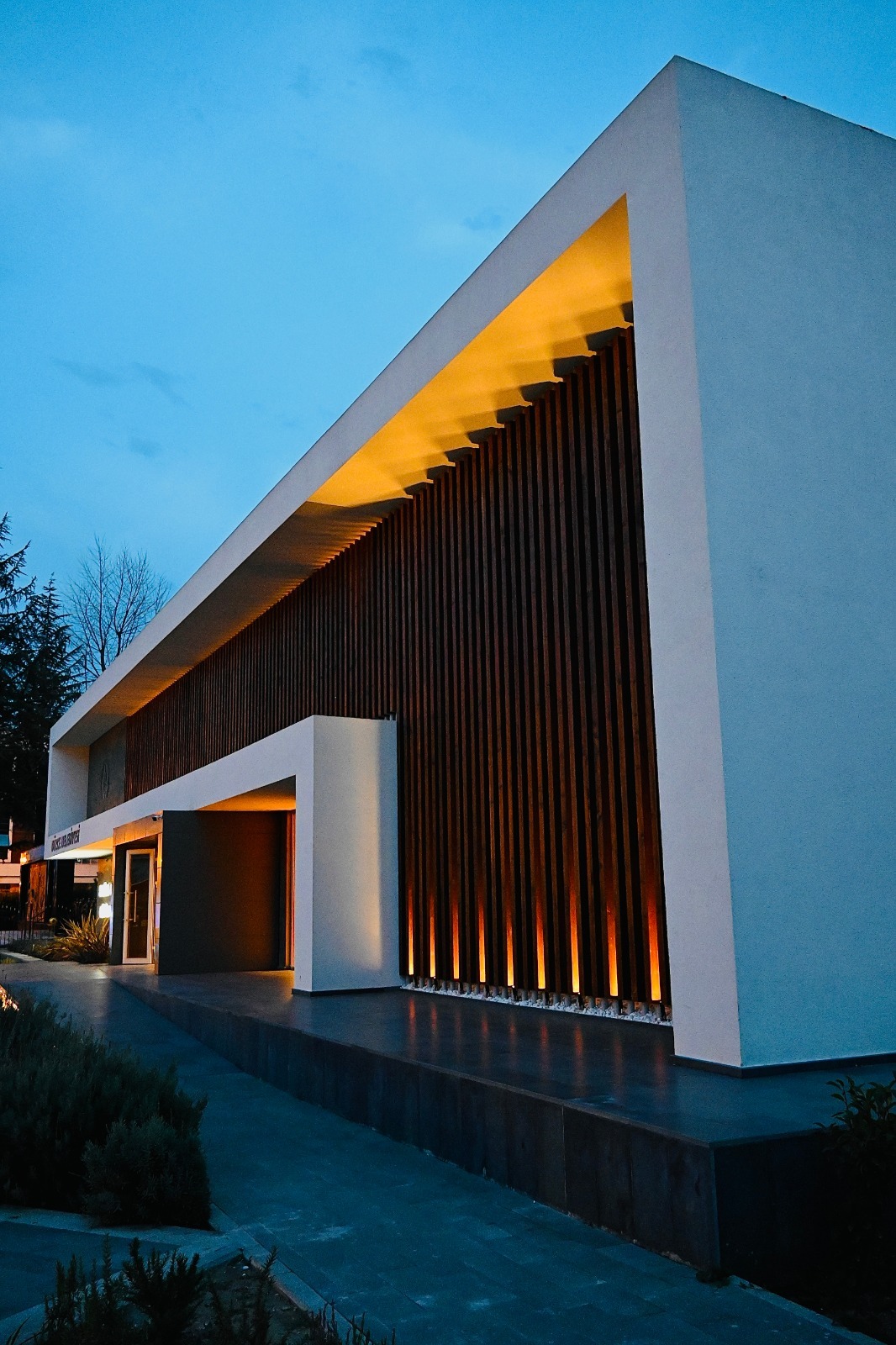 The natural material line in the interior is continued in the exterior with wood and basalt, and white, a symbol of purity and truth, dominates the facade.In the landscape design, an olive tree representing “Life and Wisdom” is positioned at the building’s entrance, while a two-colored tree representing “Duality/Communication” is located in the western corner. The steps extending across the building’s entrance are conceived as a meeting point, and the ground geometry is designed in a form that contrasts with the building’s rationalist appearance.