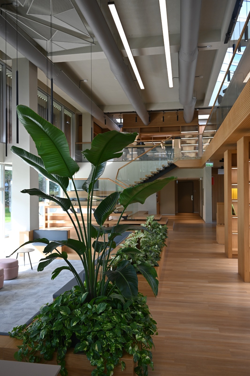 The interior cladding and furniture are made of natural wood, creating a warm and inviting effect, with cushioned seating areas in places. The mezzanine floor is covered with acoustic wooden panels to prevent loud noises from disturbing the space.
