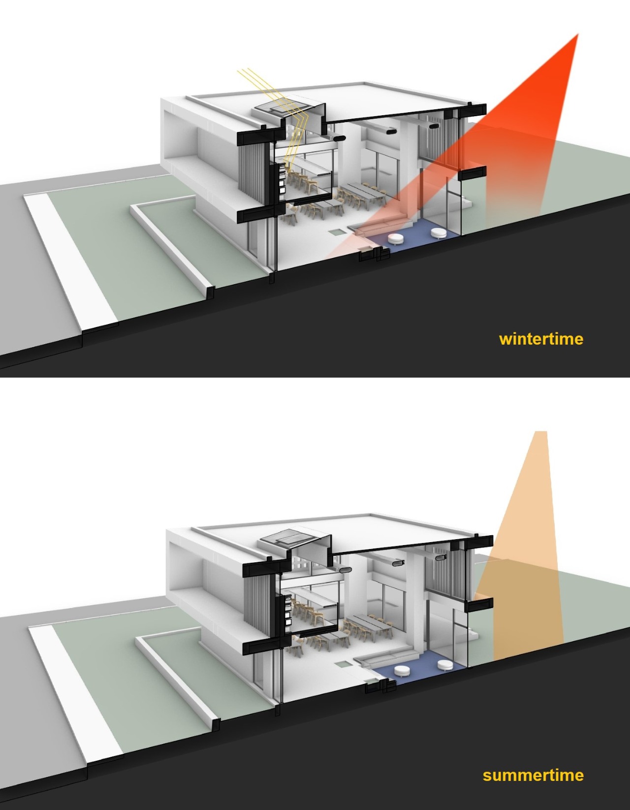 The eaves, designed to define the facades along the long sides of the building, provide a strong frame for the wooden columns that play a significant role in the character of both long facades. On the south facade, these eaves provide sun control within the framework of passive climate control objectives, while the wooden columns allow filtered daylight to enter. Similarly, the wooden columns on the north facade allow the light entering from inside to establish a subtle connection with the city when the building is illuminated.